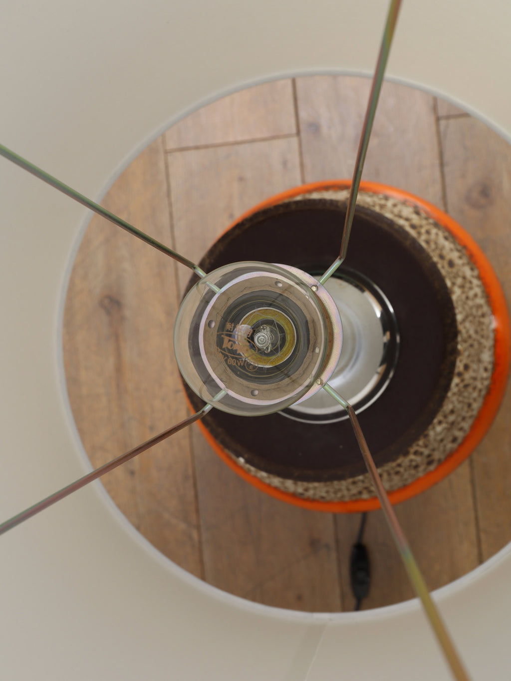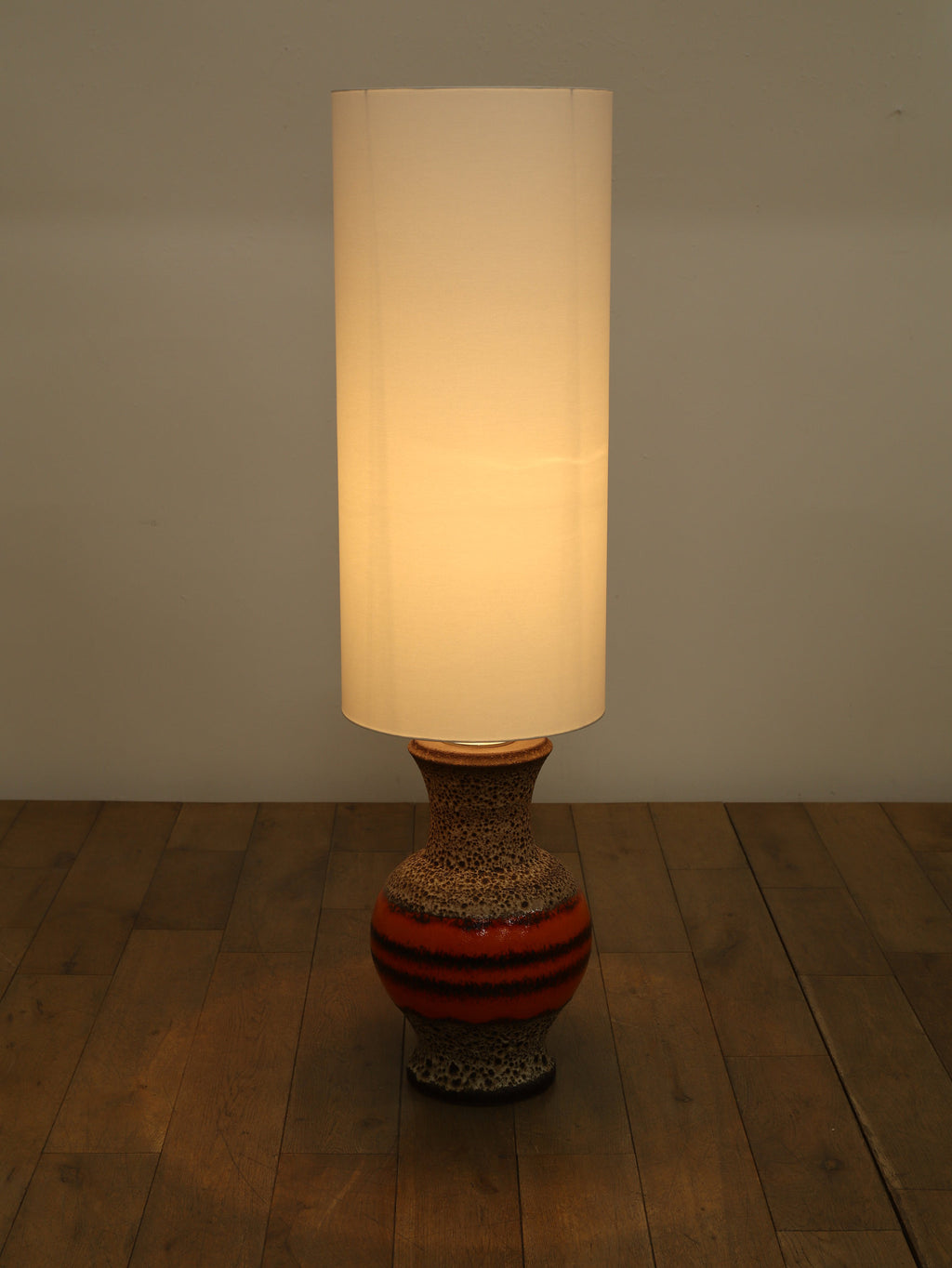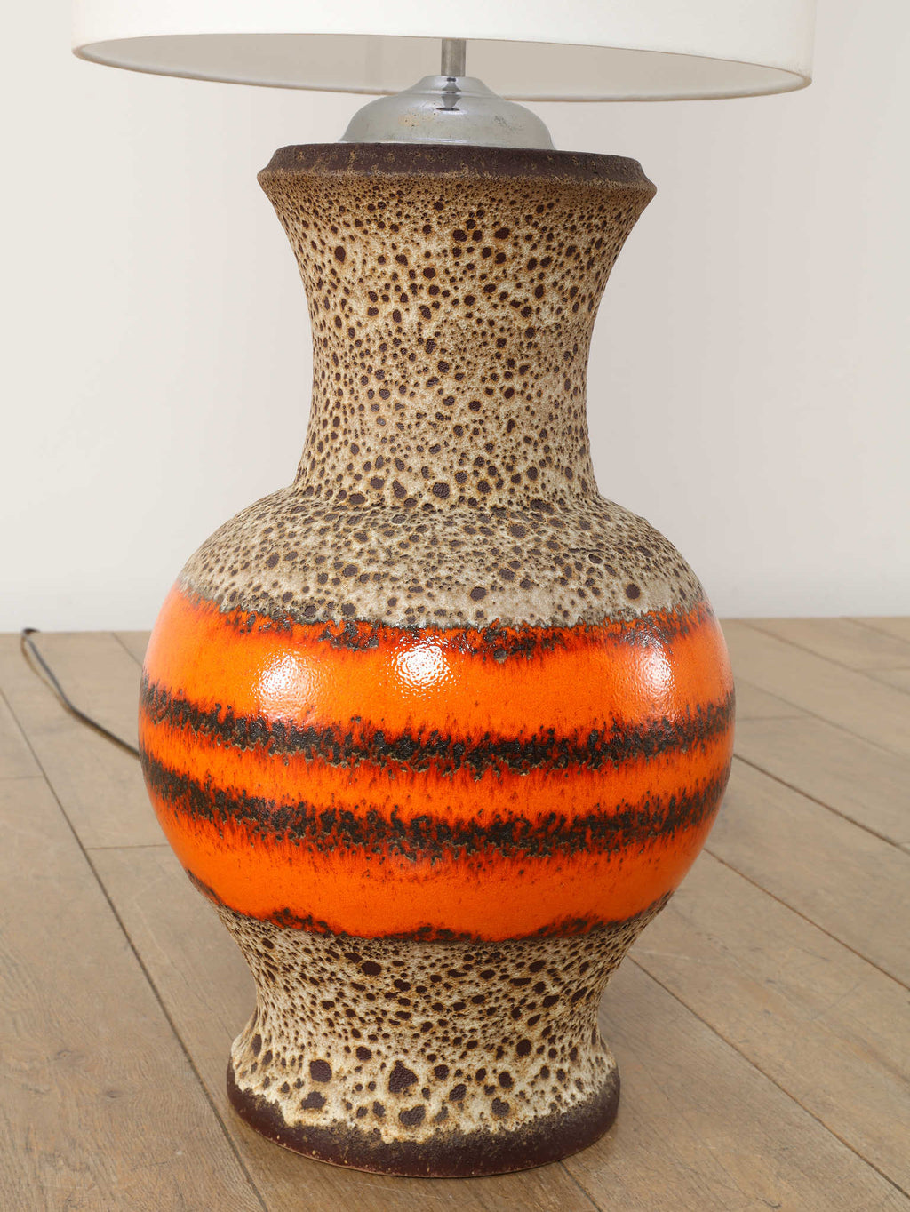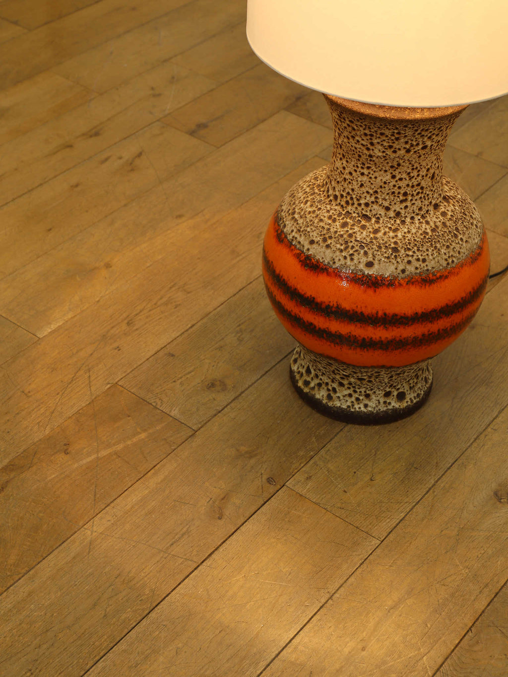 70年代の空気をそのまま閉じ込めたような、サイケデリックな柄が目を引くテーブルランプです。花びらのような大胆なパターンから放たれる温かな光は、空間をノスタルジックでムーディーな雰囲気に包み込みます。艶やかなオレンジ、そして溶岩のような質感(ファットラヴァ)のセラミックベースが見事に調和しています。日々の暮らしにアートな彩りを加えてくれる、オブジェのような照明です。圧倒的な存在感で、お部屋の主役になることでしょう。