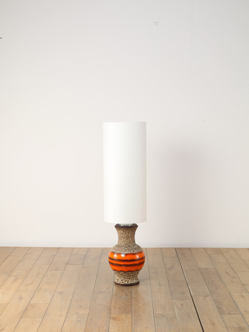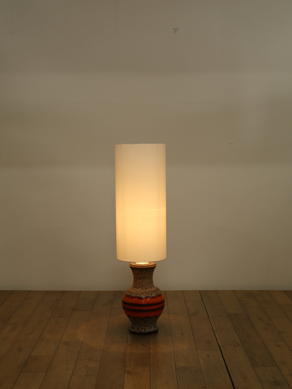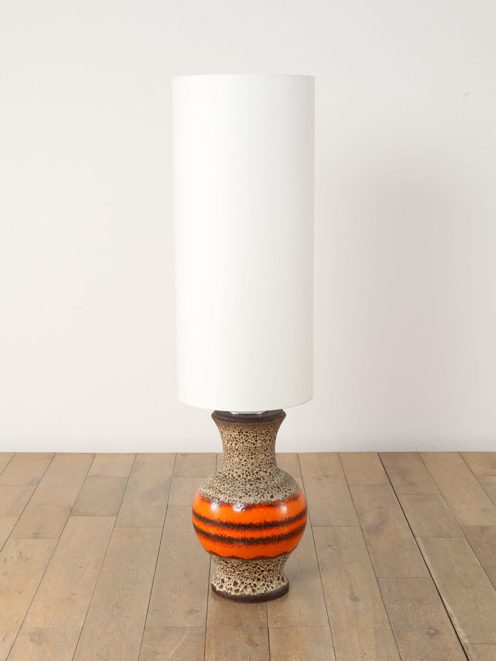 70年代の空気をそのまま閉じ込めたような、サイケデリックな柄が目を引くテーブルランプです。花びらのような大胆なパターンから放たれる温かな光は、空間をノスタルジックでムーディーな雰囲気に包み込みます。艶やかなオレンジ、そして溶岩のような質感(ファットラヴァ)のセラミックベースが見事に調和しています。日々の暮らしにアートな彩りを加えてくれる、オブジェのような照明です。圧倒的な存在感で、お部屋の主役になることでしょう。
