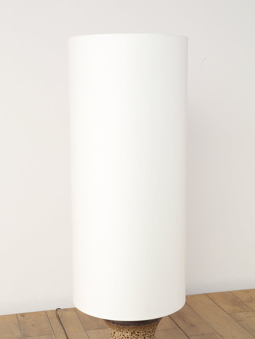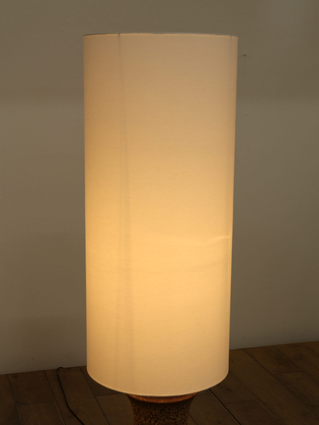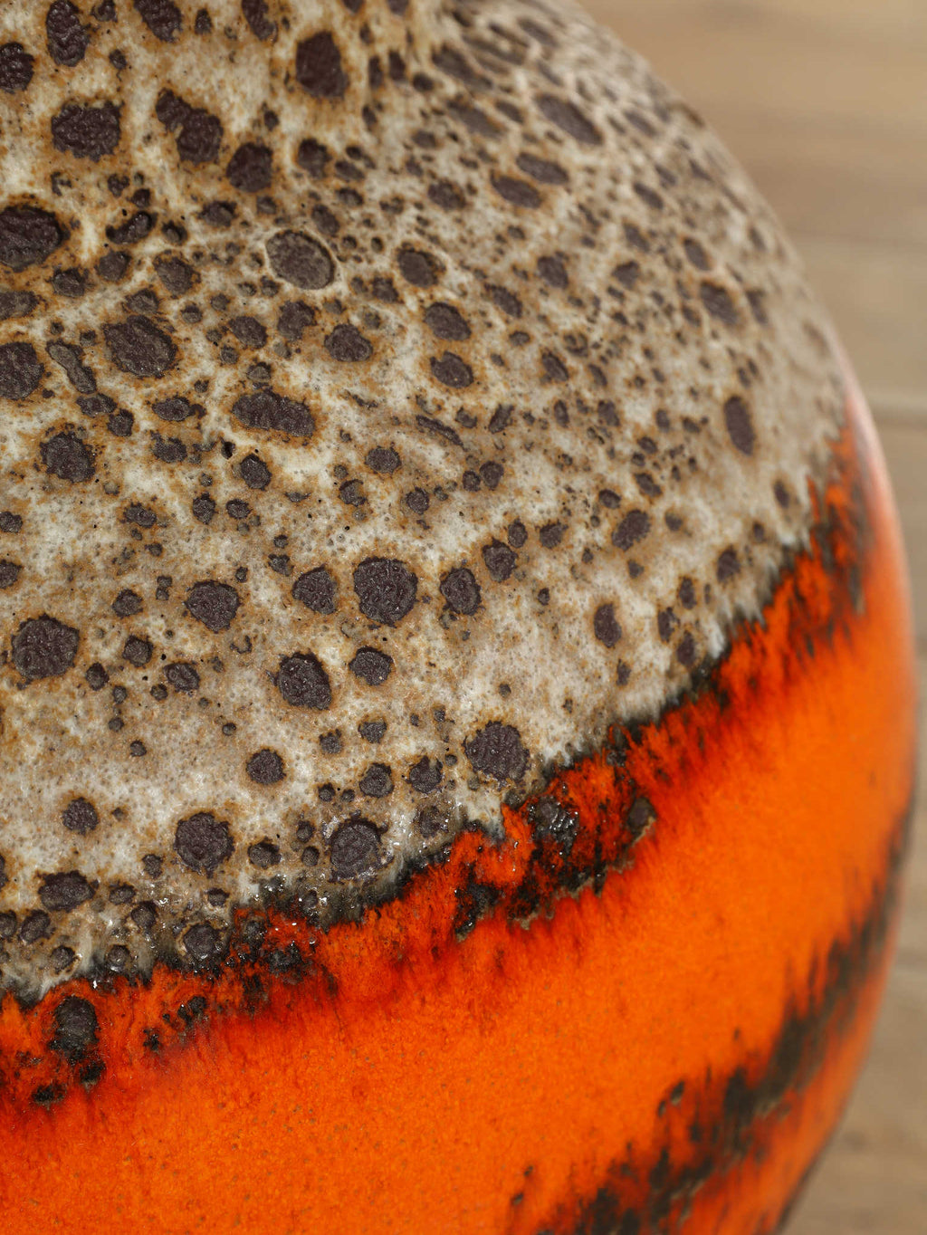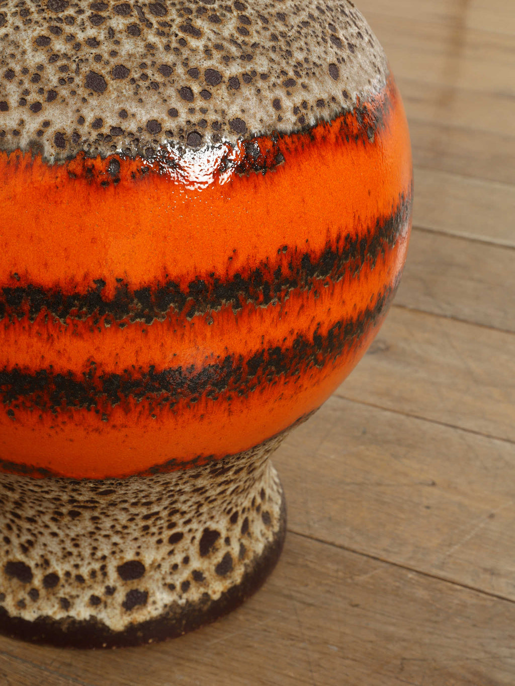 70年代の空気をそのまま閉じ込めたような、サイケデリックな柄が目を引くテーブルランプです。花びらのような大胆なパターンから放たれる温かな光は、空間をノスタルジックでムーディーな雰囲気に包み込みます。艶やかなオレンジ、そして溶岩のような質感(ファットラヴァ)のセラミックベースが見事に調和しています。日々の暮らしにアートな彩りを加えてくれる、オブジェのような照明です。圧倒的な存在感で、お部屋の主役になることでしょう。