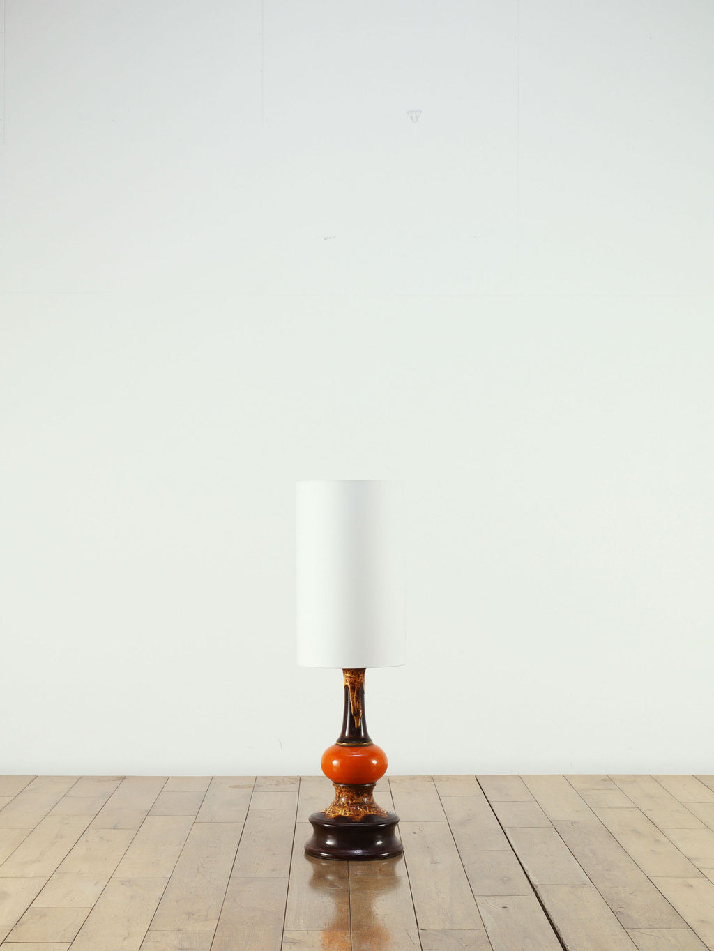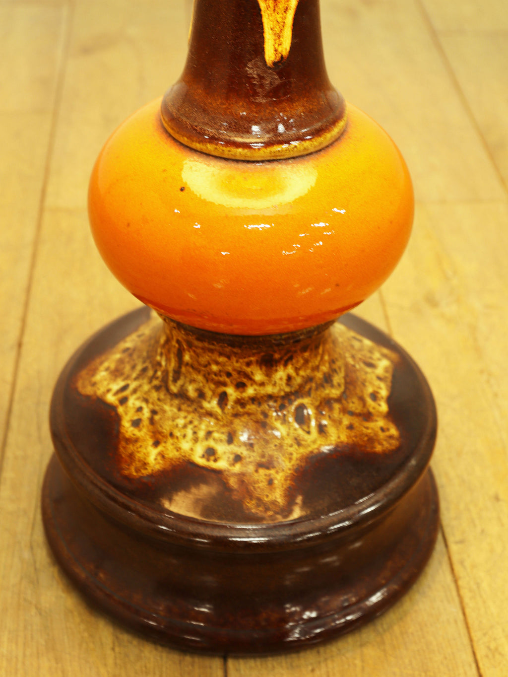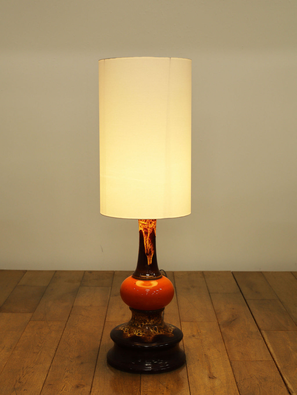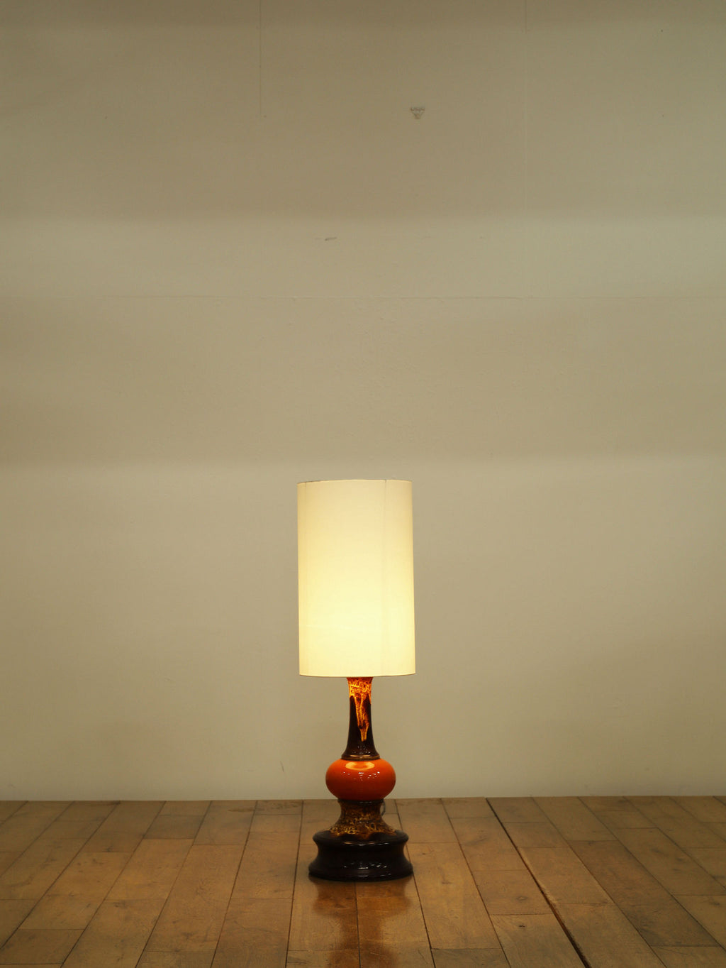 大地を思わせるアースカラーが魅力的な、1970年代(推定)のテーブルランプです。流れるような大胆なパターンのシェードと、艶やかなオレンジ、そして溶岩のような質感(ファットラヴァスタイル)のセラミックベースが見事に調和しています。置くだけでお部屋にレトロモダンな深みと温かみを加えてくれる一台です。シェードの生地からこぼれる光が、ダイナミックな模様を浮かび上がらせ、空間に安らぎと個性を与えてくれます。70年代のパワーを感じる、アートピースのようなテーブルランプで特別な存在感をお楽しみください。