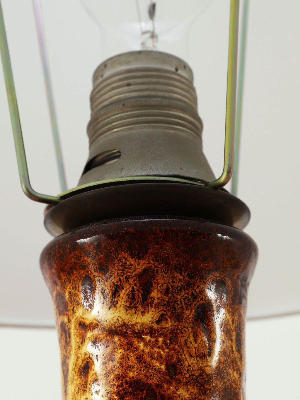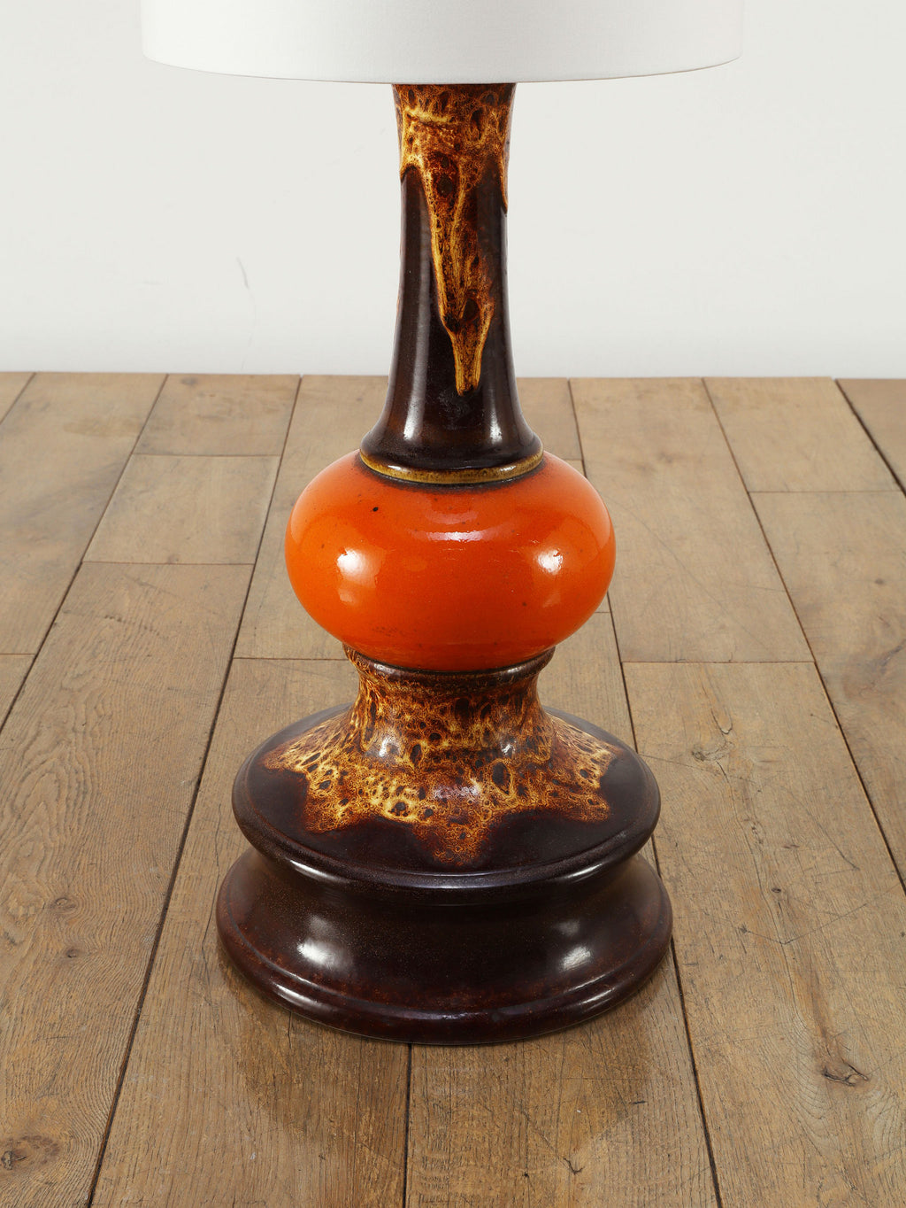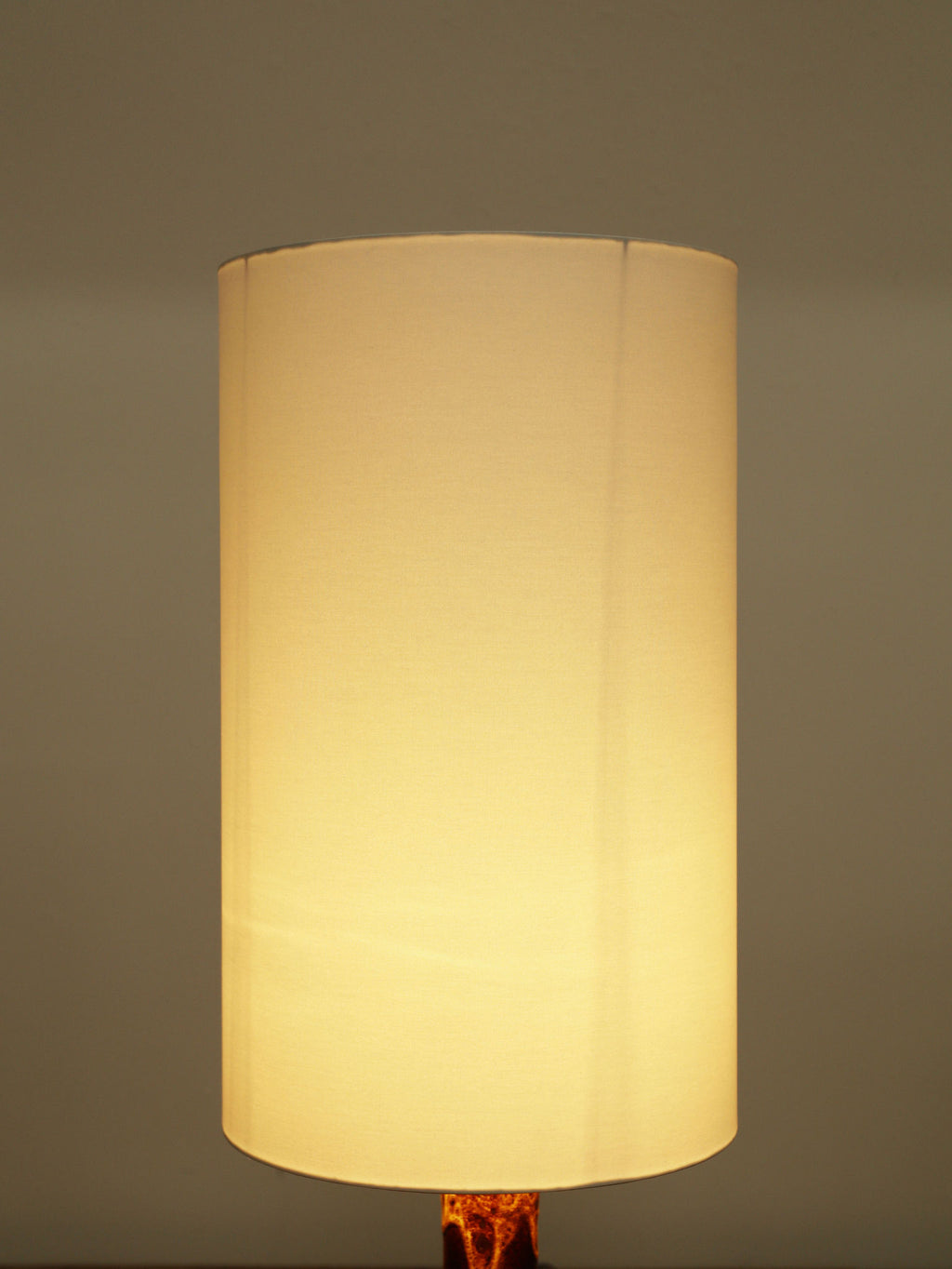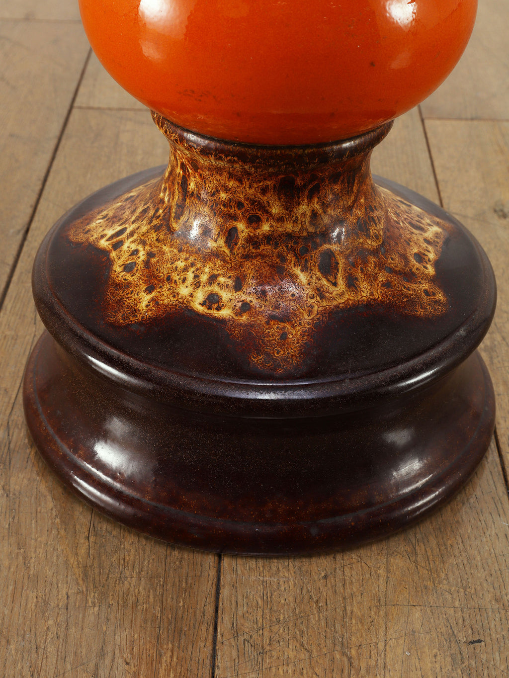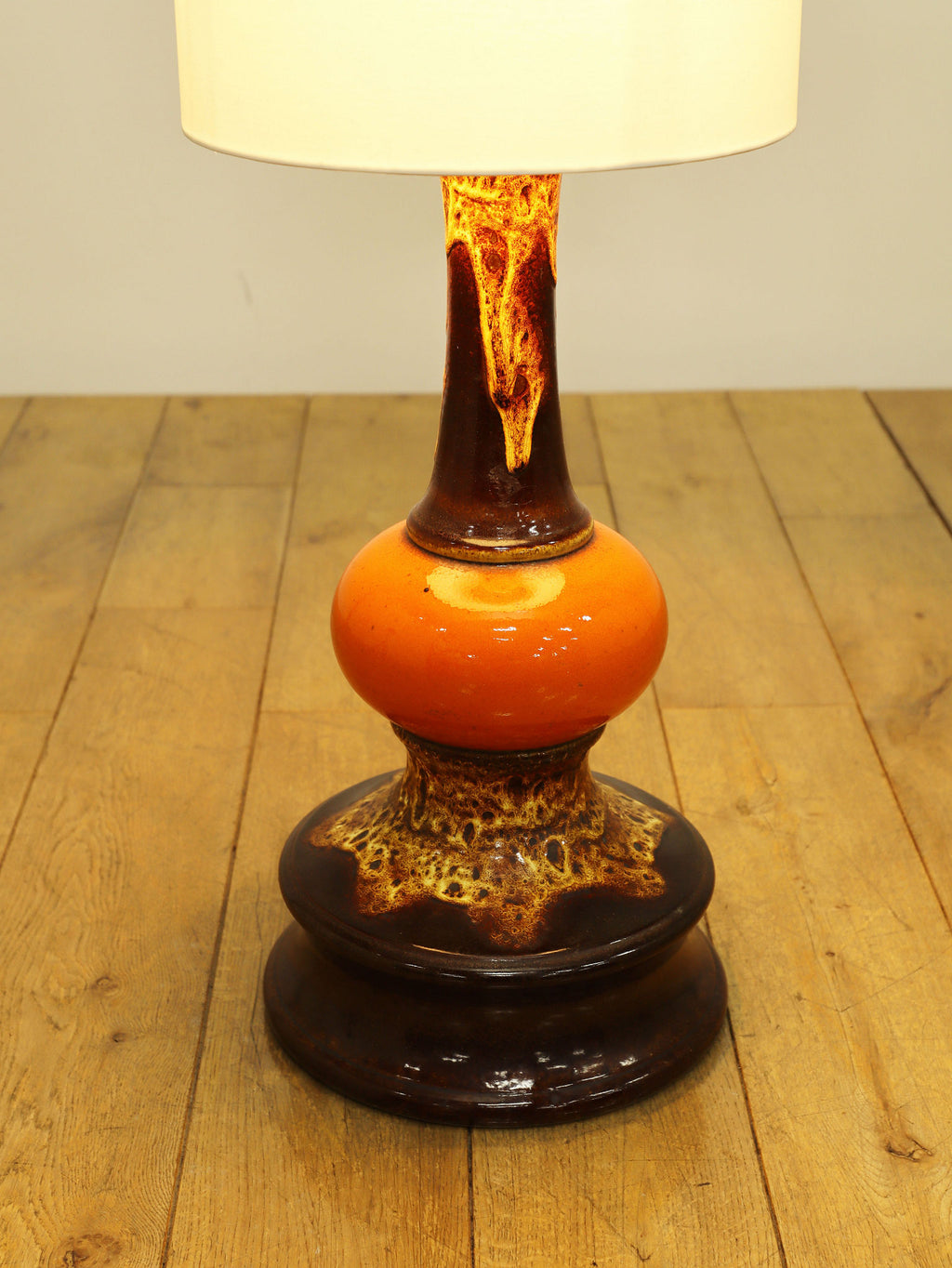 大地を思わせるアースカラーが魅力的な、1970年代(推定)のテーブルランプです。流れるような大胆なパターンのシェードと、艶やかなオレンジ、そして溶岩のような質感(ファットラヴァスタイル)のセラミックベースが見事に調和しています。置くだけでお部屋にレトロモダンな深みと温かみを加えてくれる一台です。シェードの生地からこぼれる光が、ダイナミックな模様を浮かび上がらせ、空間に安らぎと個性を与えてくれます。70年代のパワーを感じる、アートピースのようなテーブルランプで特別な存在感をお楽しみください。