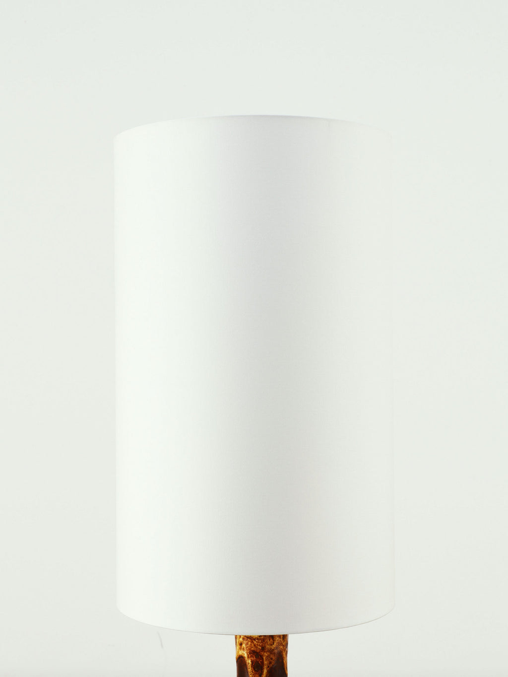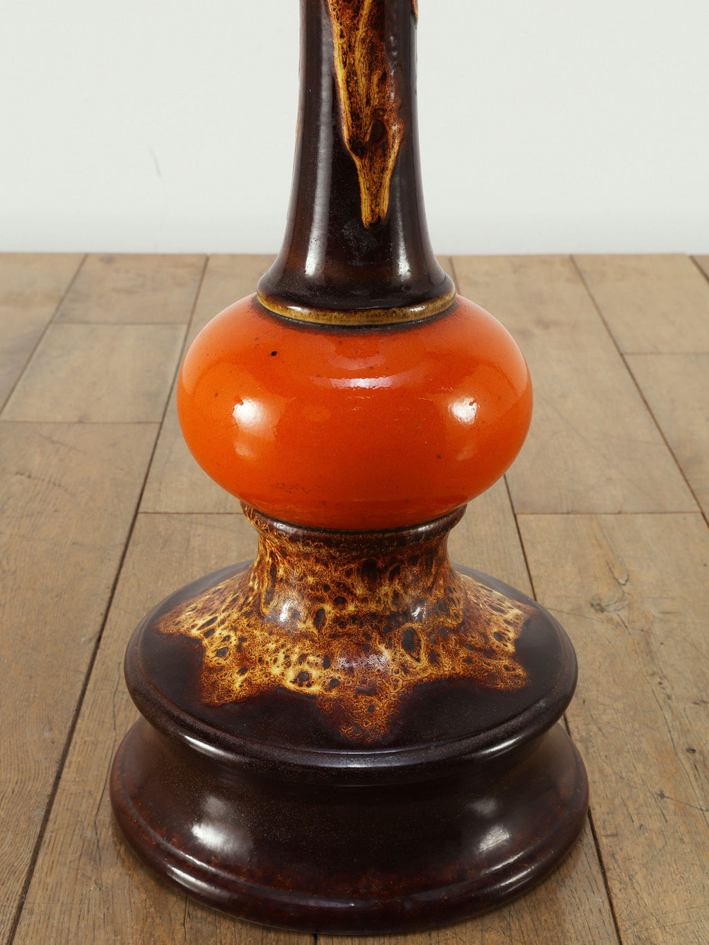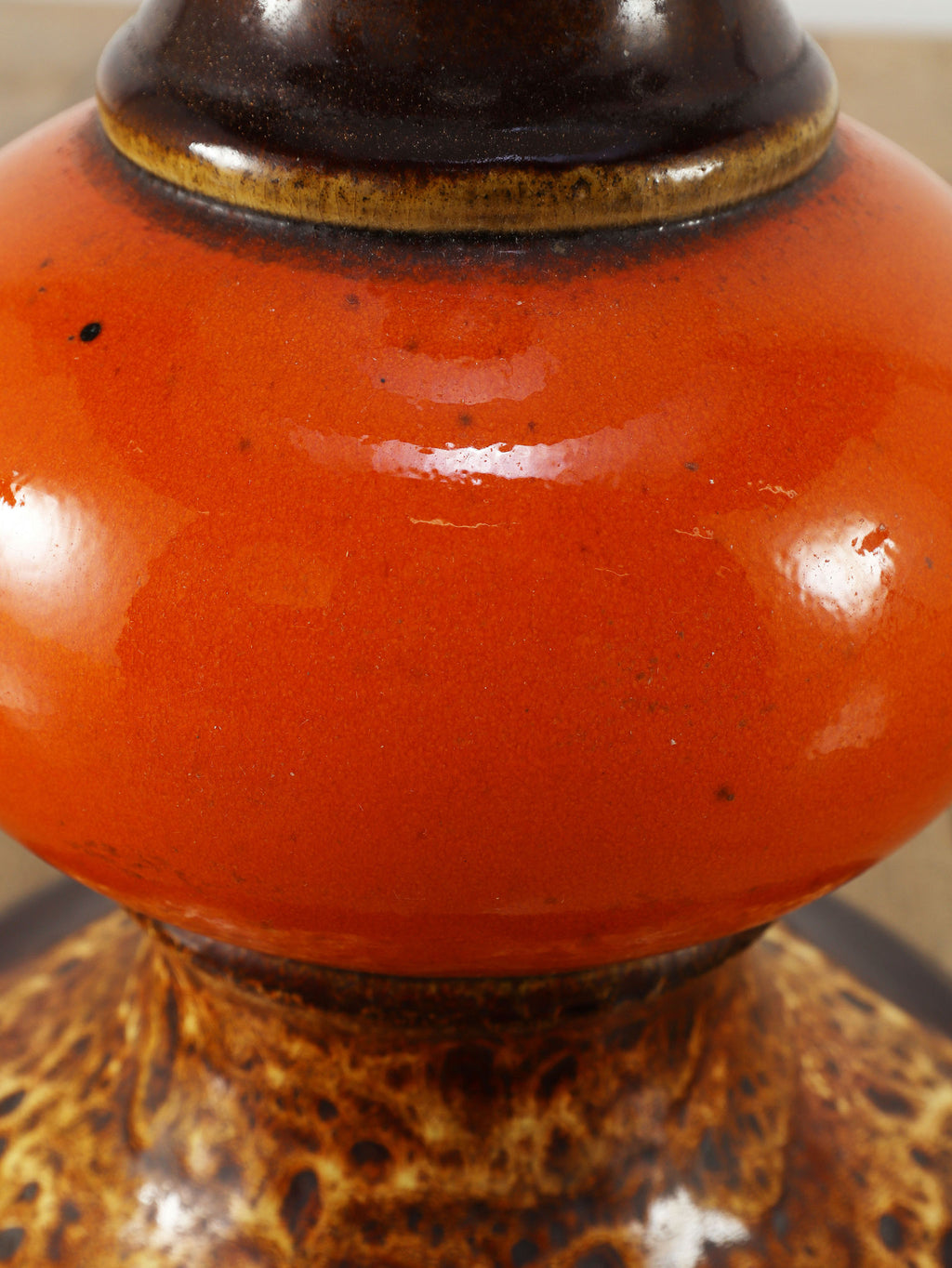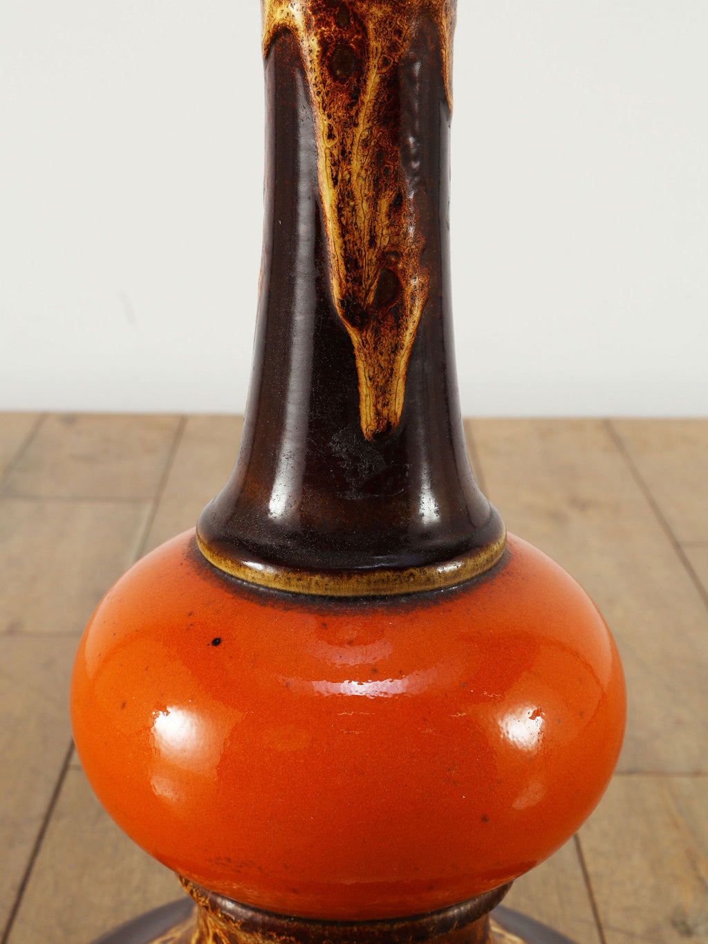 大地を思わせるアースカラーが魅力的な、1970年代(推定)のテーブルランプです。流れるような大胆なパターンのシェードと、艶やかなオレンジ、そして溶岩のような質感(ファットラヴァスタイル)のセラミックベースが見事に調和しています。置くだけでお部屋にレトロモダンな深みと温かみを加えてくれる一台です。シェードの生地からこぼれる光が、ダイナミックな模様を浮かび上がらせ、空間に安らぎと個性を与えてくれます。70年代のパワーを感じる、アートピースのようなテーブルランプで特別な存在感をお楽しみください。