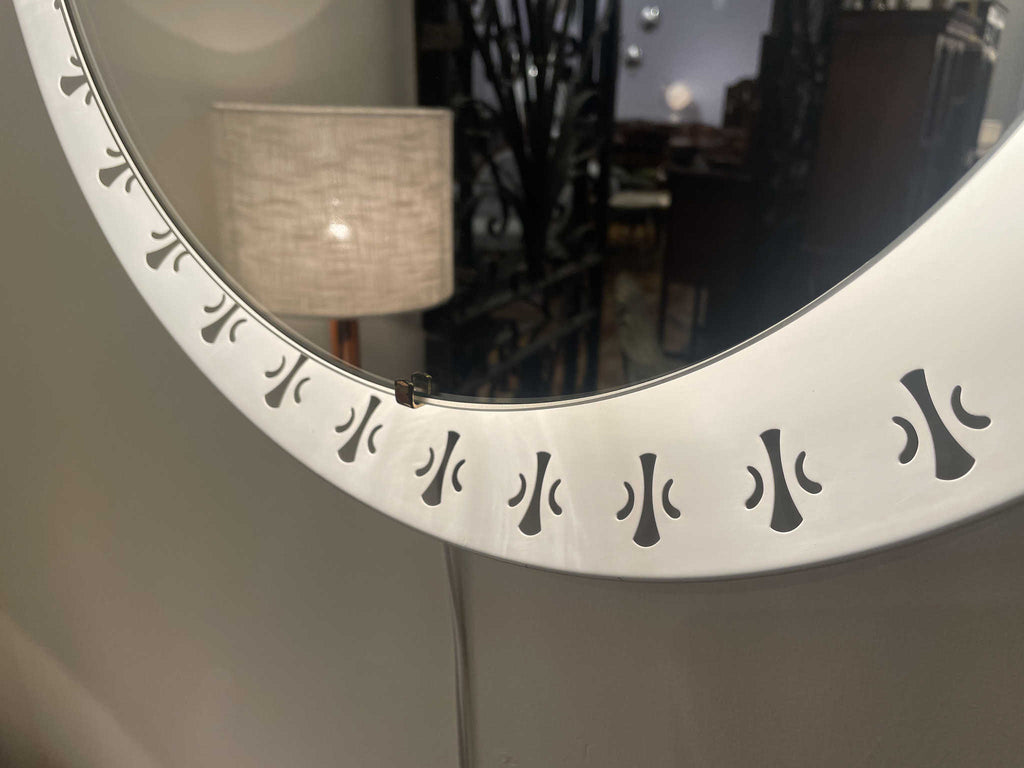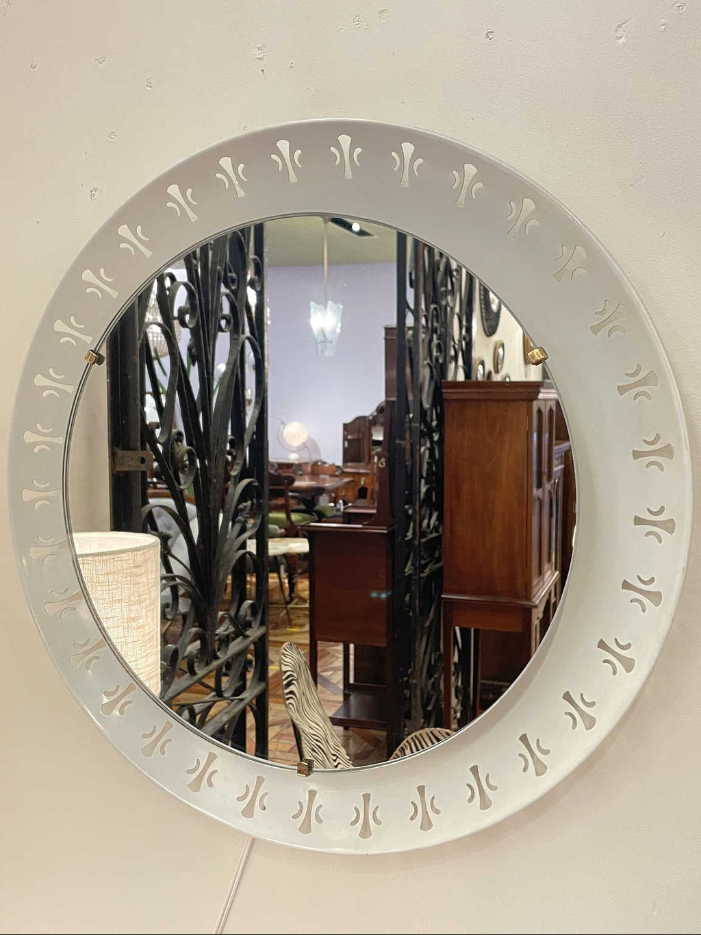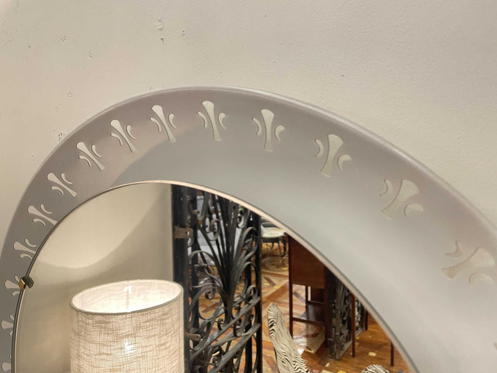 1970年代(推定)に作られたシックな気品が漂うこちらのウォールミラー。オフホワイトのフレームには、フランス王家の紋章として有名な百合の紋章を思わせるクラシカルなモチーフがリズミカルに配置されています。甘すぎないエレガントなデザインで、どんな空間にも洗練されたアクセントを加えてくれます。鏡の中に映る日常を、一枚の絵画のように見せてくれる、そんな静謐な美しさを湛えたミラーです。壁に掛けるだけで、空間の空気が澄み渡るような特別な存在感を放ちます。
