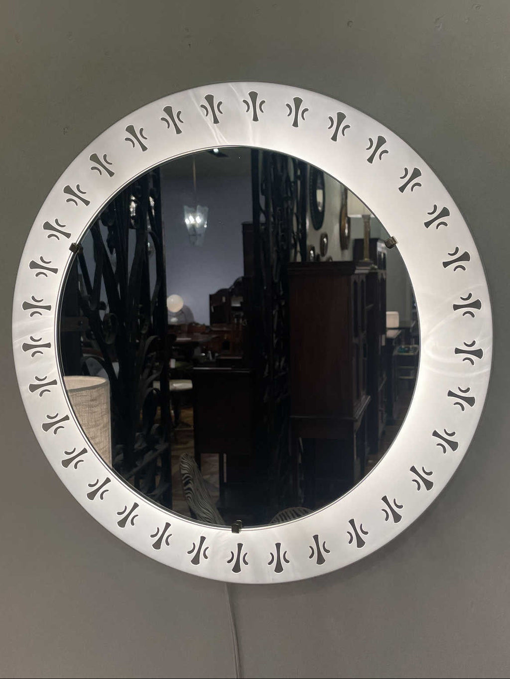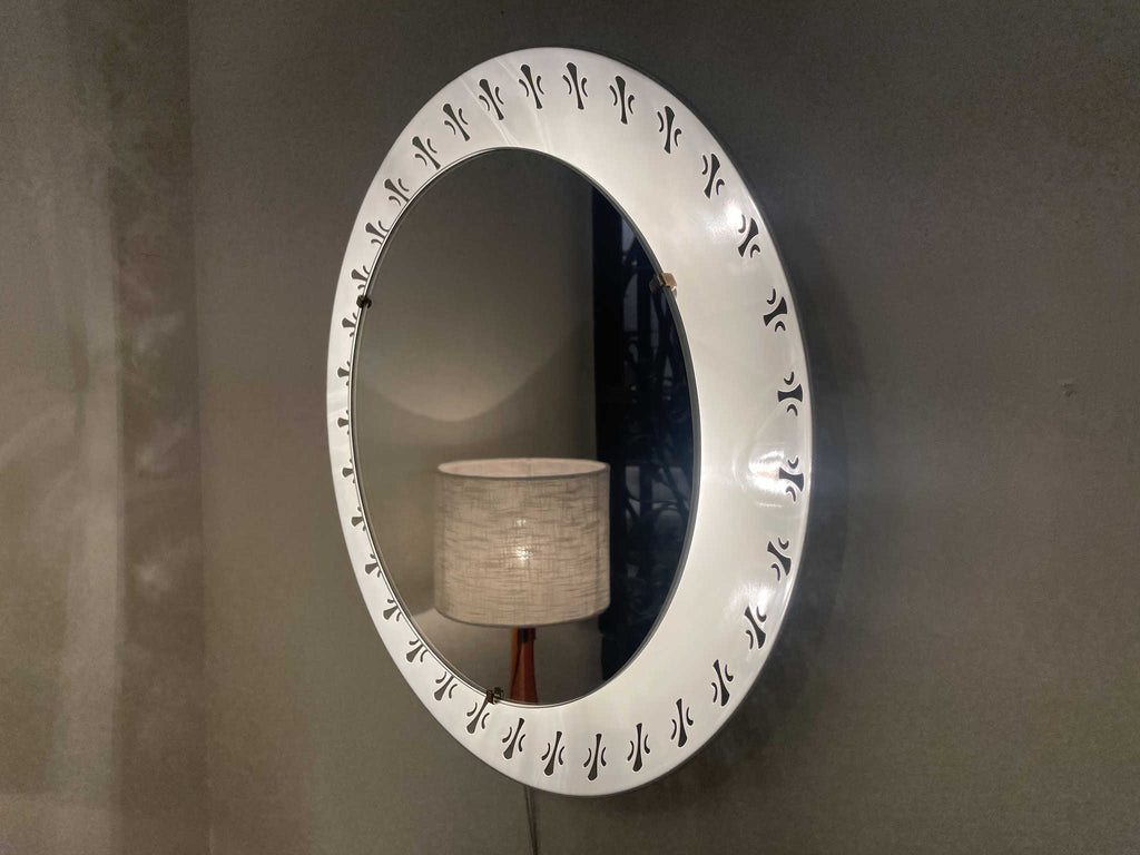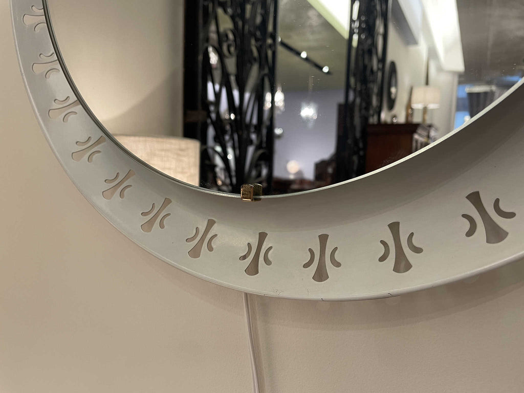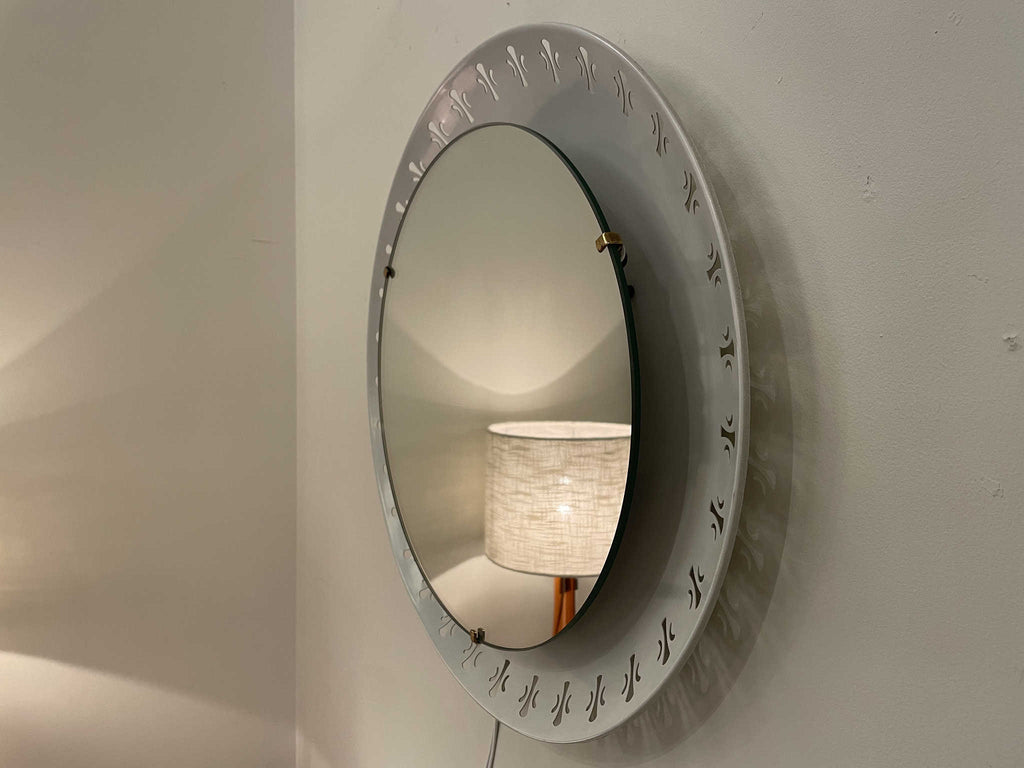 1970年代(推定)に作られたシックな気品が漂うこちらのウォールミラー。オフホワイトのフレームには、フランス王家の紋章として有名な百合の紋章を思わせるクラシカルなモチーフがリズミカルに配置されています。甘すぎないエレガントなデザインで、どんな空間にも洗練されたアクセントを加えてくれます。鏡の中に映る日常を、一枚の絵画のように見せてくれる、そんな静謐な美しさを湛えたミラーです。壁に掛けるだけで、空間の空気が澄み渡るような特別な存在感を放ちます。