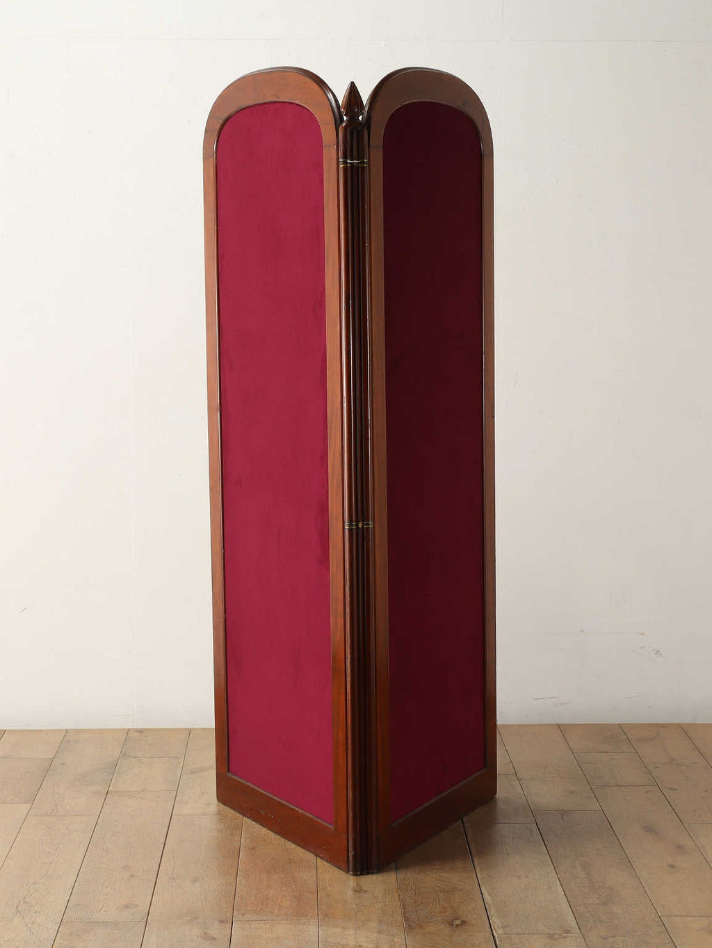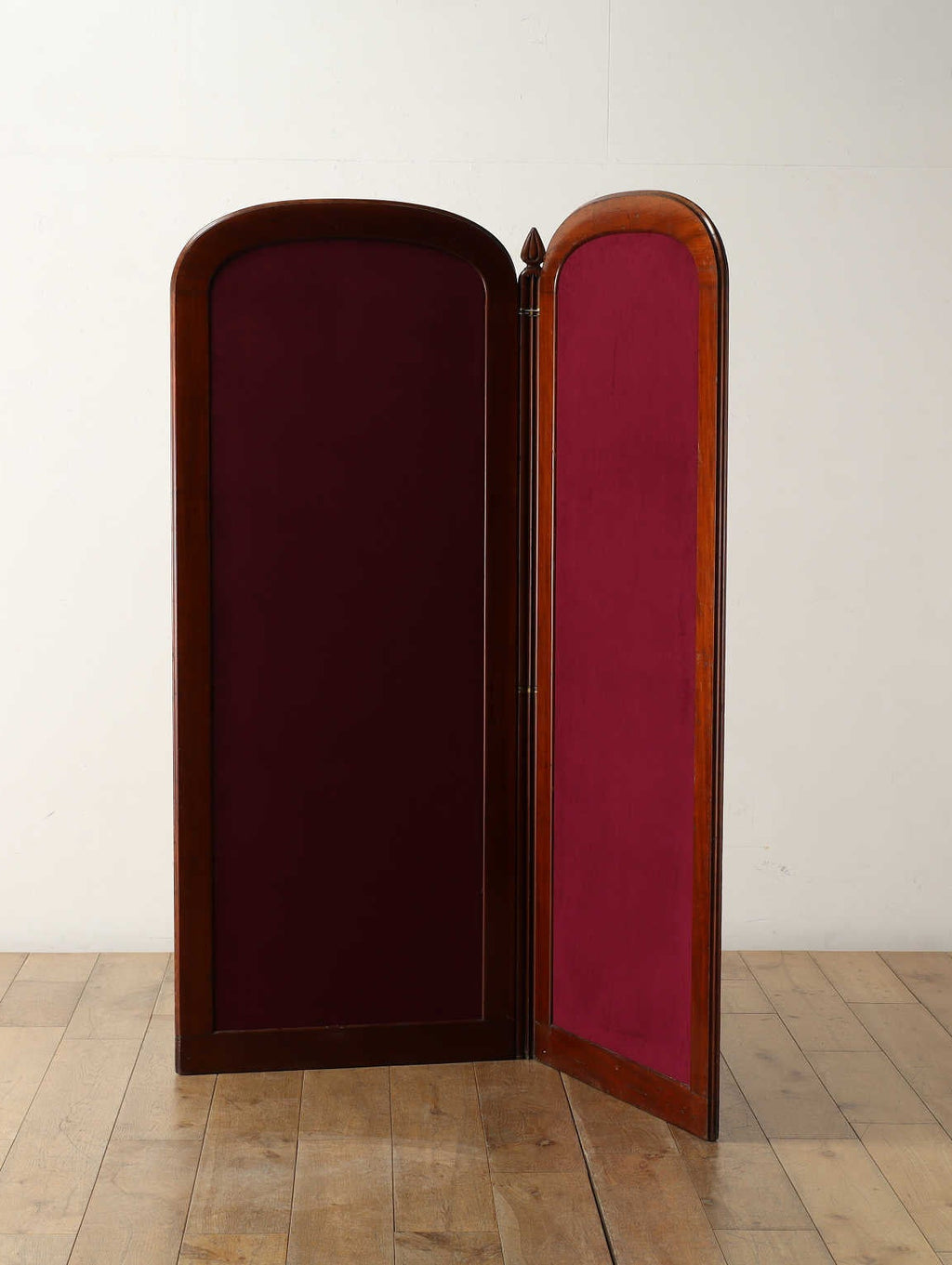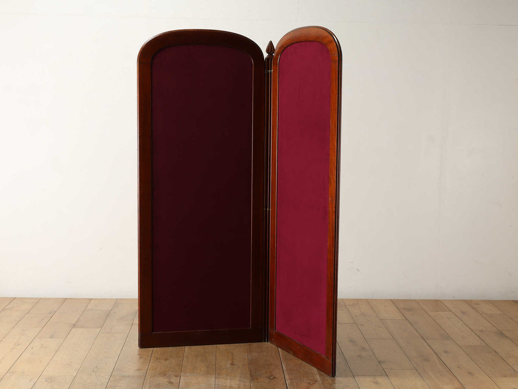 1860年代(推定)にイギリスで製作された、風格漂うマホガニー材のスクリーン。製作から100年以上の長い時を経てきたマホガニー材は、深い色艶と滑らかな手触りを持ち、アンティークならではの優美な味わいを醸し出しています。シンプルな2面の構成でありながら、曲線を描く上部のフォルムと重厚な木枠が相まって、お部屋に置くだけで空間の主役となる圧倒的な存在感を放ちます。この「時の痕跡」こそが、本品が歩んできた歴史を雄弁に物語る魅力の一部です。歴史を楽しみながら、新たなファブリックで、新しい命を吹き込みます。パーテーションとして、または装飾的な背景として、格調高い空間演出を可能にする稀有な一品です。【ファブリック】