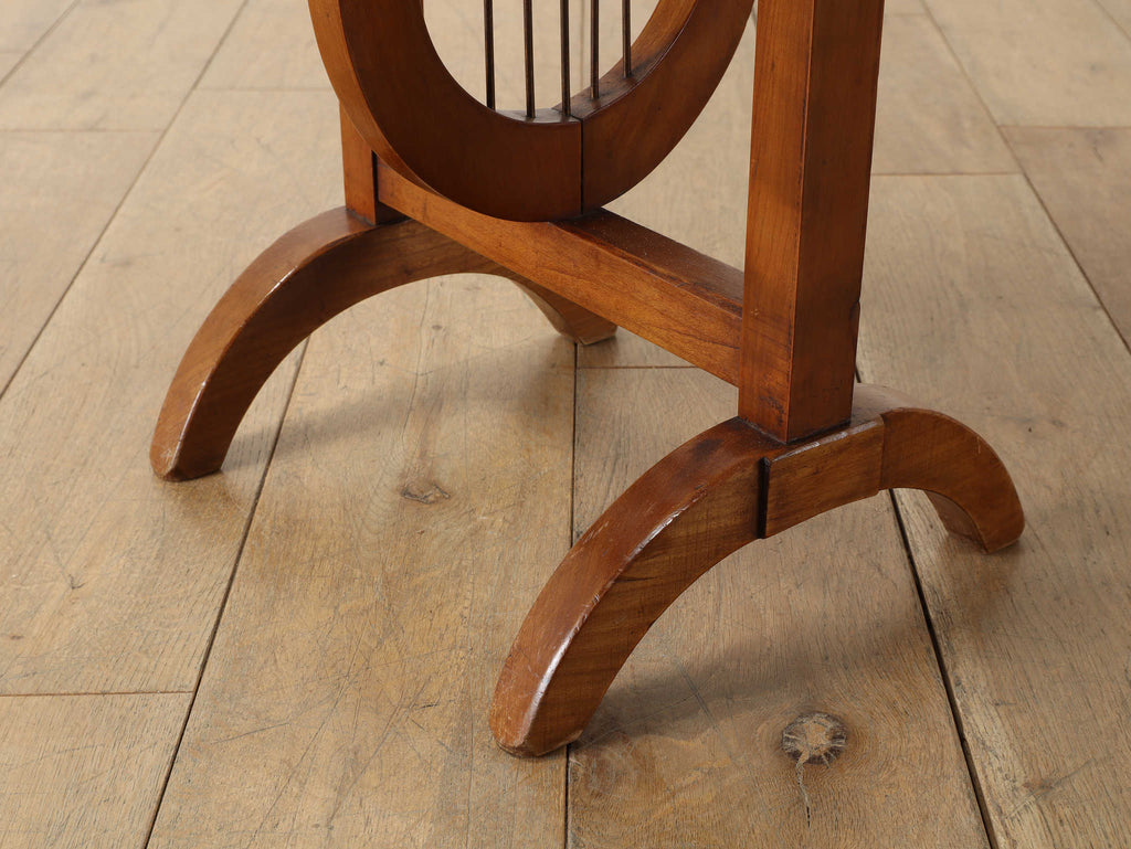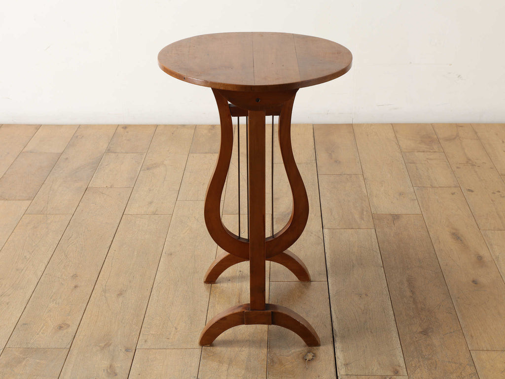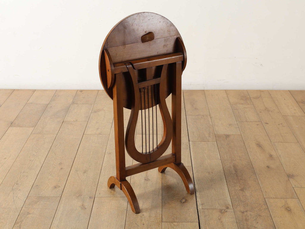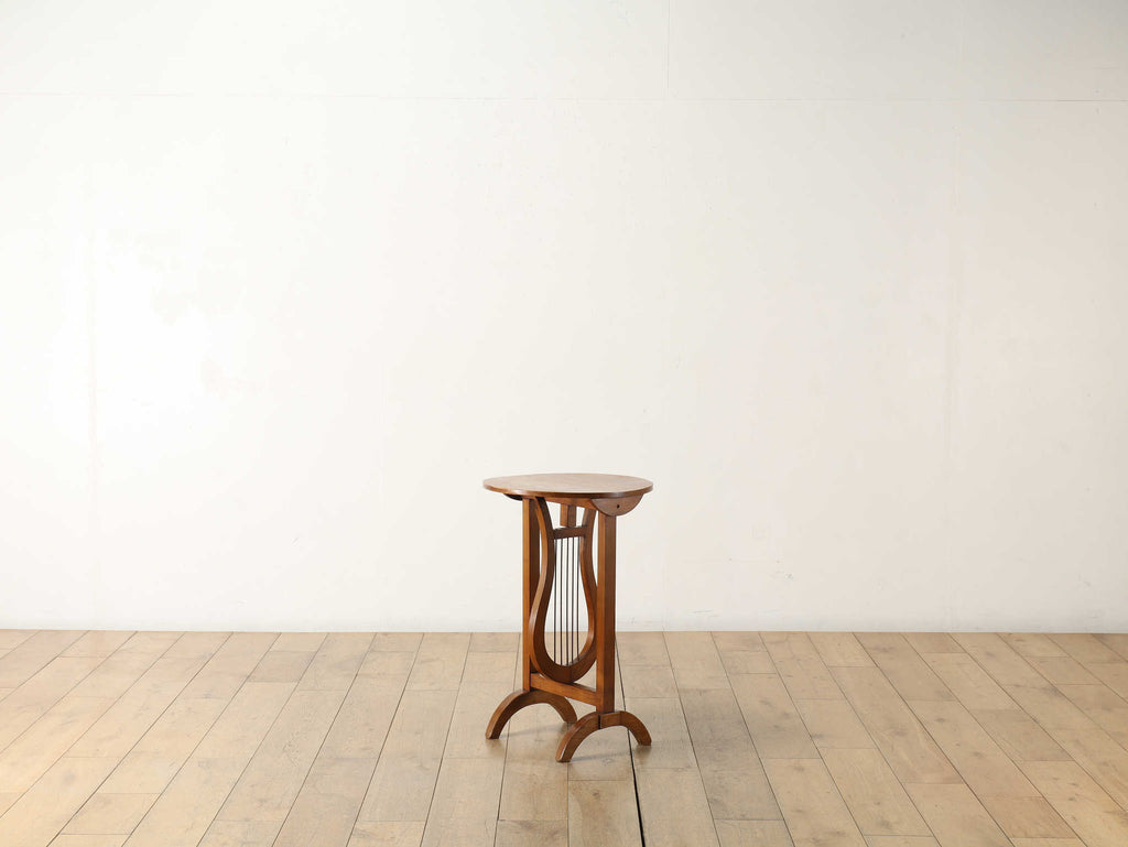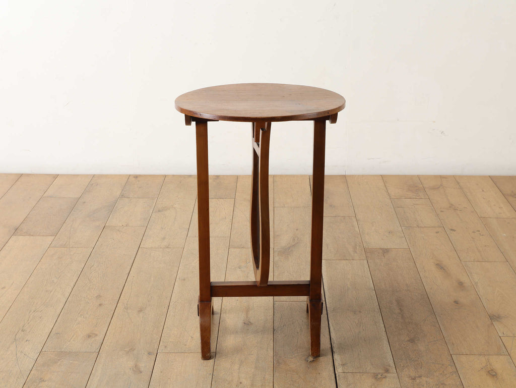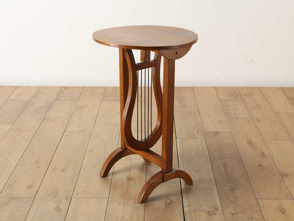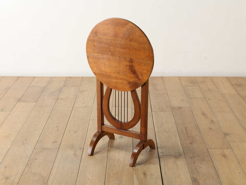 1910年代(推定)、フランスのエレガンスが凝縮されたマホガニー材のテーブル。アール・デコの洗練された空気を今に伝える、優美な逸品です。こちらのテーブルの最大の魅力は、ハープをモチーフにした脚元のデザイン性にあります。古典的な美しさとモダンな感性が融合した優美な曲線は、お部屋に格調高い芸術的なアクセントを加えます。素材には良質なマホガニー材が使われ、時を経て深みを増した艶やかな木肌は、本物のアンティークならではの表情を醸し出しています。また、特筆すべきはその実用性。天板は美しく折りたためる構造で、使わない時もハープのオブジェのような佇まいです。畳んだ姿も美しいため、空間を損なうことなく、機能性とデザイン性を両立させた一台です。エレガントな暮らしを演出するパートナーとして、心ゆくまでご愛用ください。