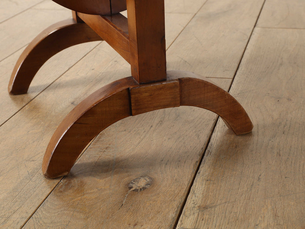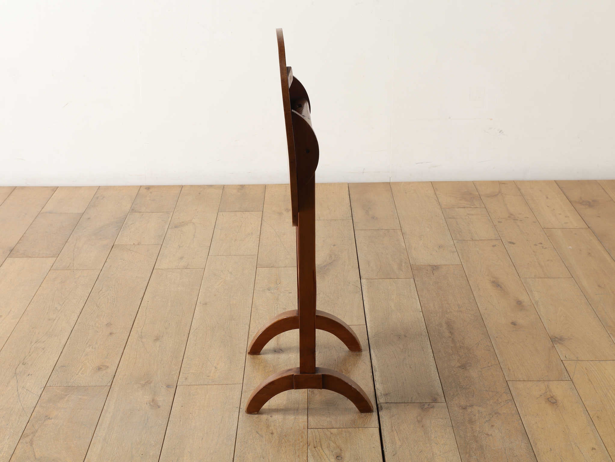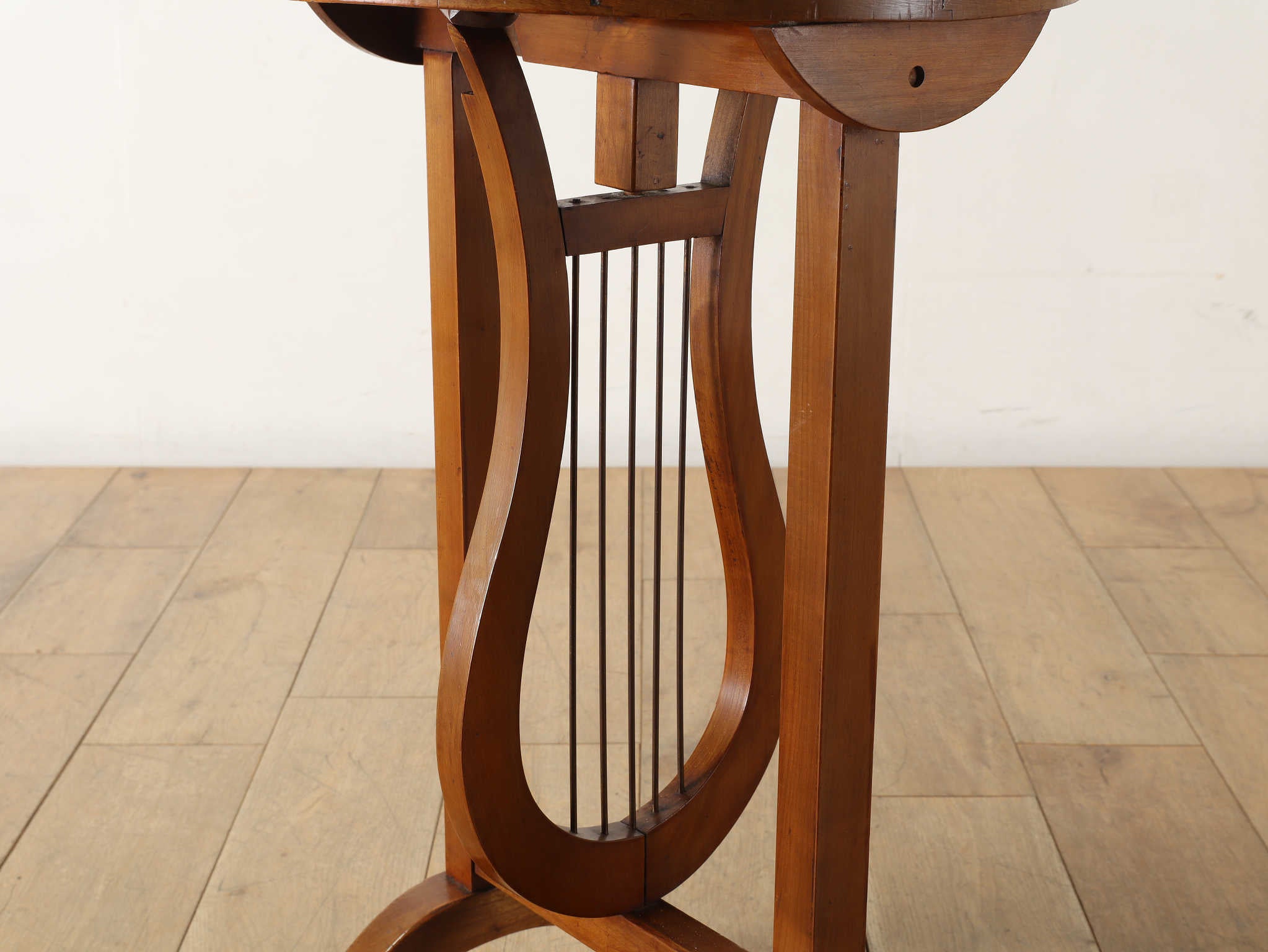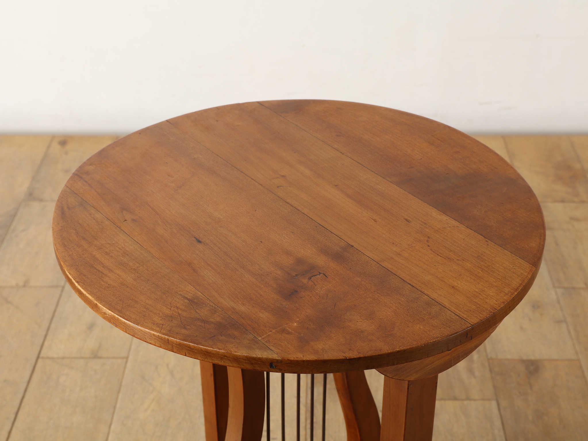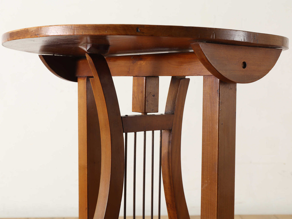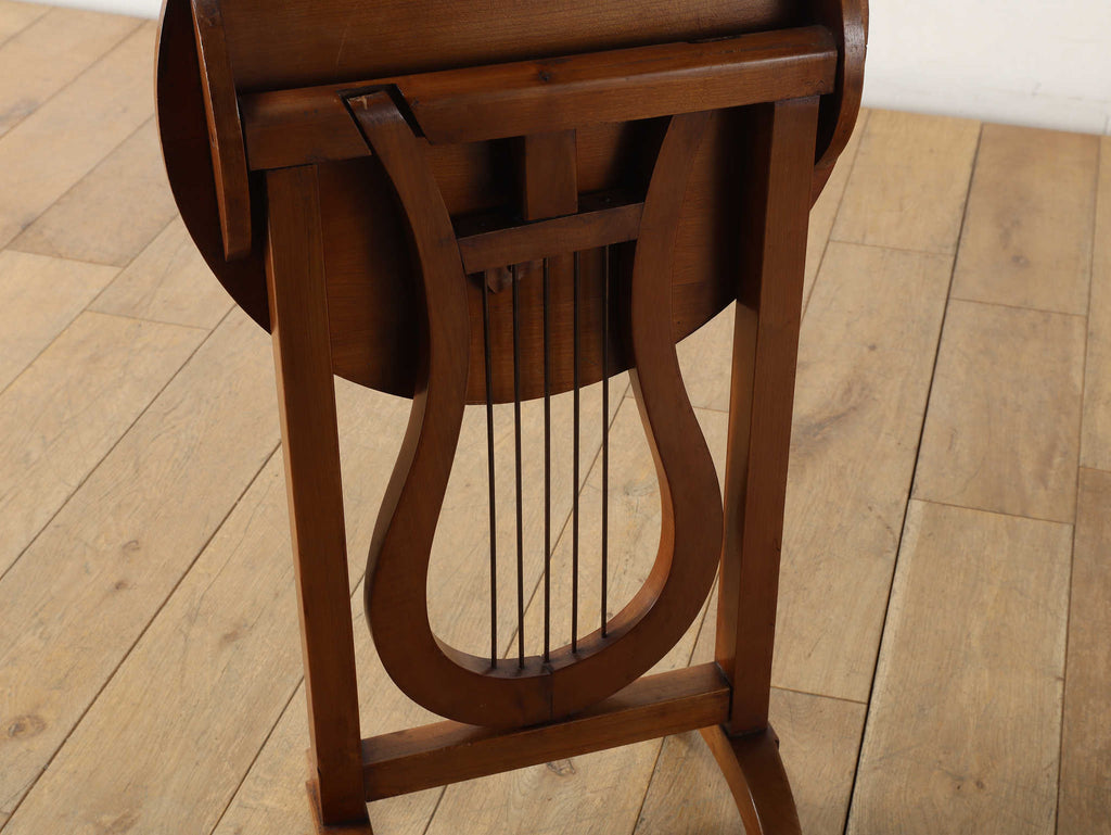 1910年代(推定)、フランスのエレガンスが凝縮されたマホガニー材のテーブル。アール・デコの洗練された空気を今に伝える、優美な逸品です。こちらのテーブルの最大の魅力は、ハープをモチーフにした脚元のデザイン性にあります。古典的な美しさとモダンな感性が融合した優美な曲線は、お部屋に格調高い芸術的なアクセントを加えます。素材には良質なマホガニー材が使われ、時を経て深みを増した艶やかな木肌は、本物のアンティークならではの表情を醸し出しています。また、特筆すべきはその実用性。天板は美しく折りたためる構造で、使わない時もハープのオブジェのような佇まいです。畳んだ姿も美しいため、空間を損なうことなく、機能性とデザイン性を両立させた一台です。エレガントな暮らしを演出するパートナーとして、心ゆくまでご愛用ください。