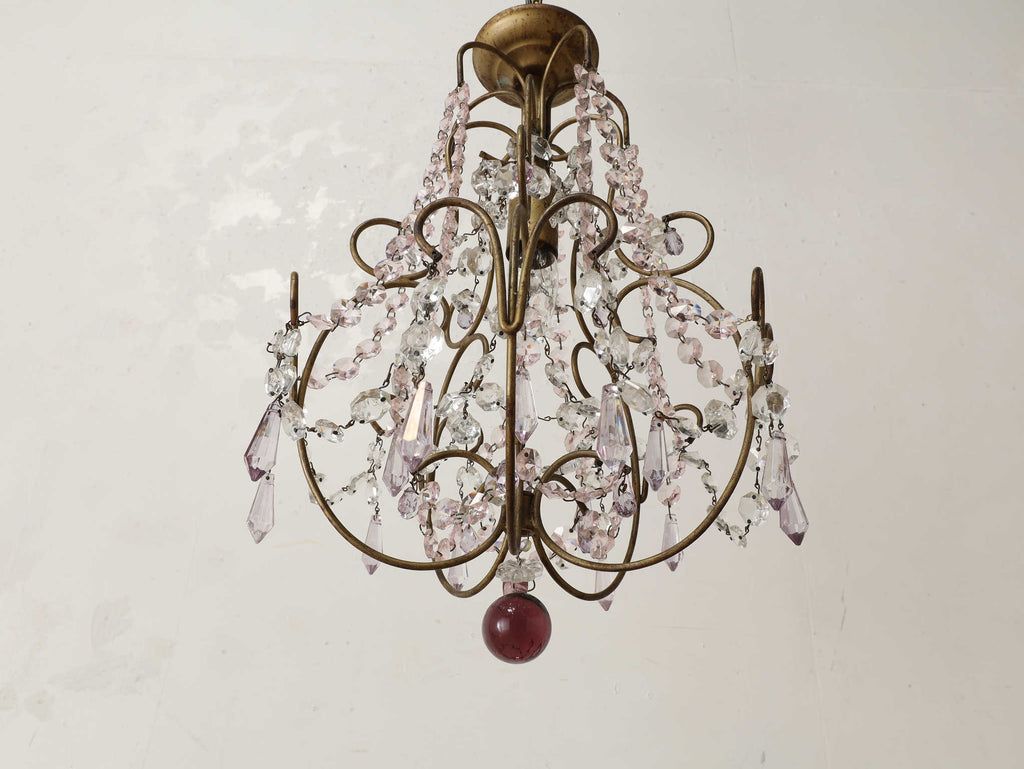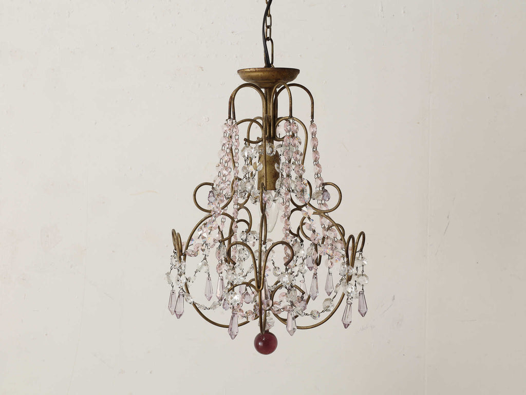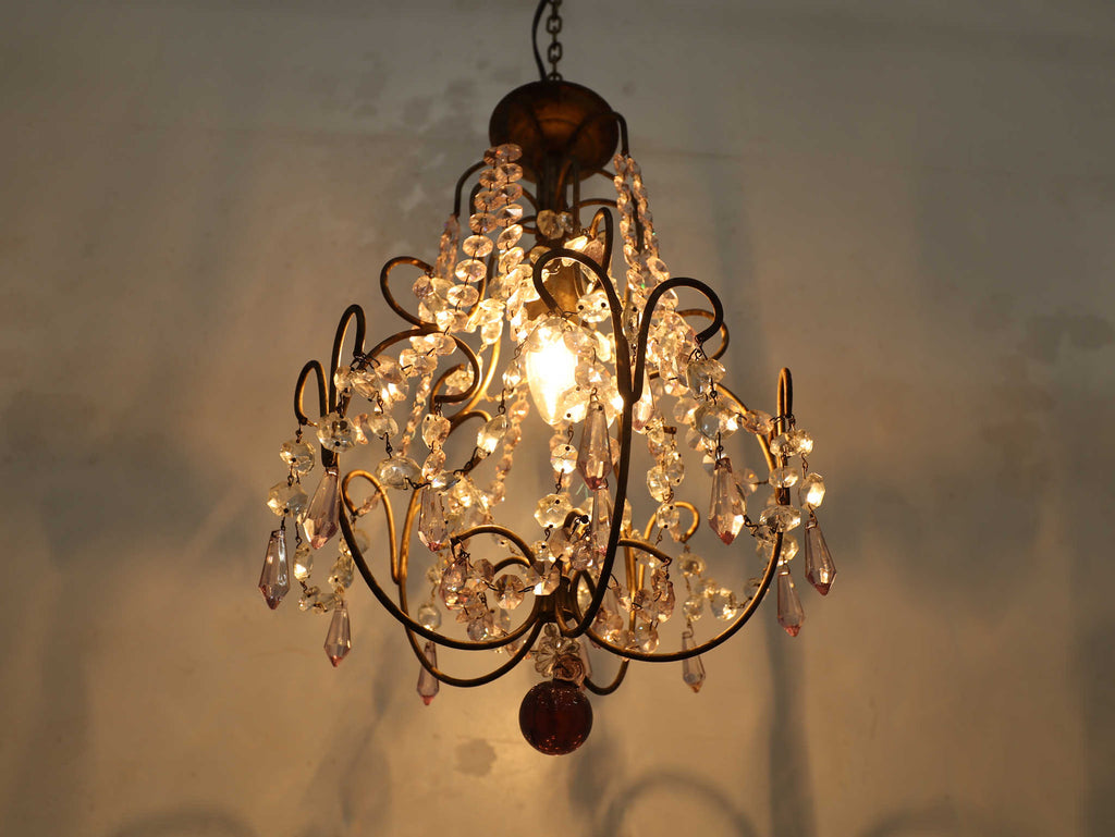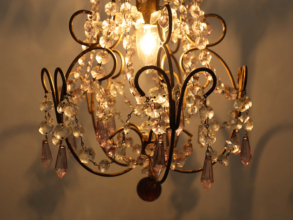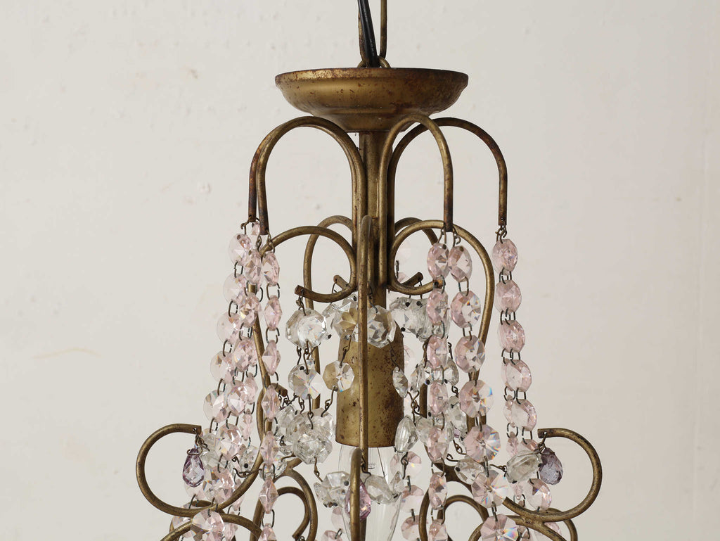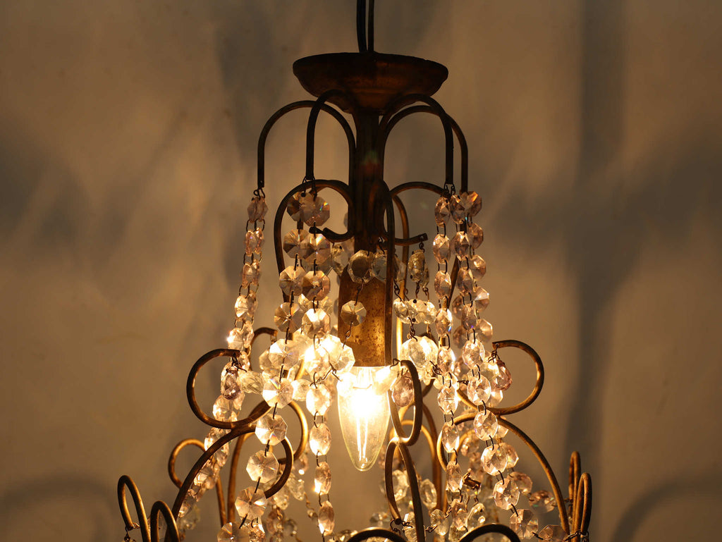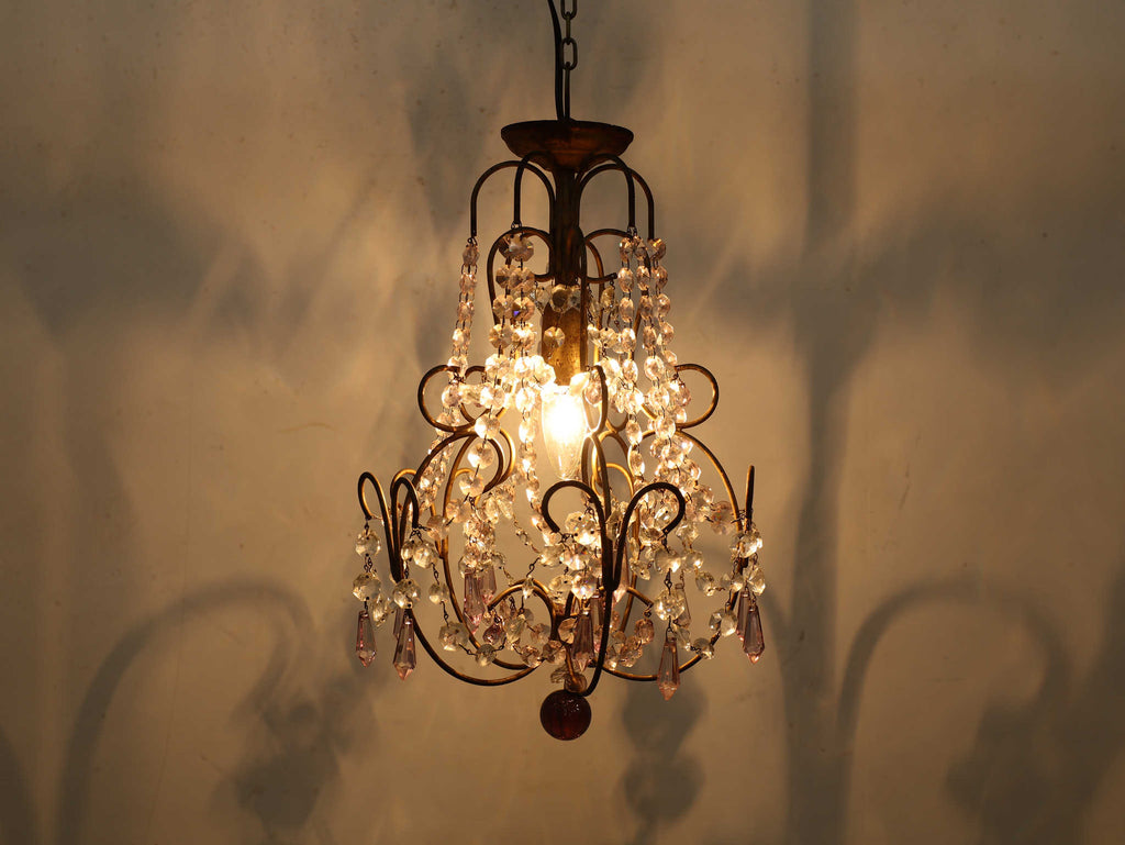 こちらは1920年代(推定)にフランスで製作された一灯タイプのシャンデリアです。華美になりすぎない、慎ましやかな美しさが魅力のアンティーク照明です。アイアンフレームが作り出す落ち着いたブロンズカラーと、そこから滴るようなクリアなガラスパーツのコントラストが特徴です。パーツ一つ一つが光を優しく捉え、煌々と照らす照明というよりも、空間に柔らかな「明かりの雰囲気」を添えるオブジェのような存在感を放ちます。コンパクトな一灯タイプのため、玄関ホールや廊下、または寝室やサニタリールームなど、小さな空間に主張しすぎない華やかさを加えたい時に最適です。フランスの古き良き時代の空気を運び、日常をドラマティックに彩ってくれるでしょう。点灯した瞬間の、ガラスがきらめく幻想的な美しさをお楽しみください。