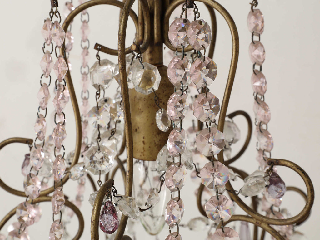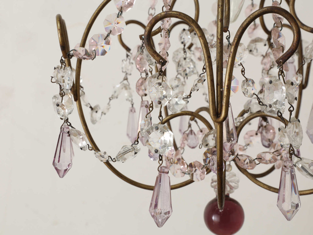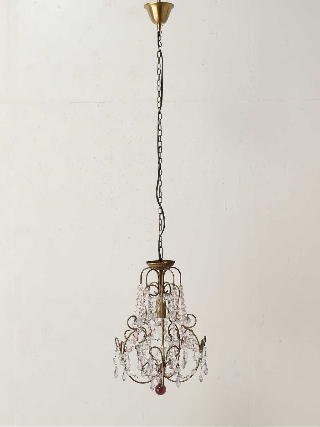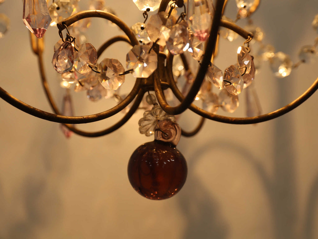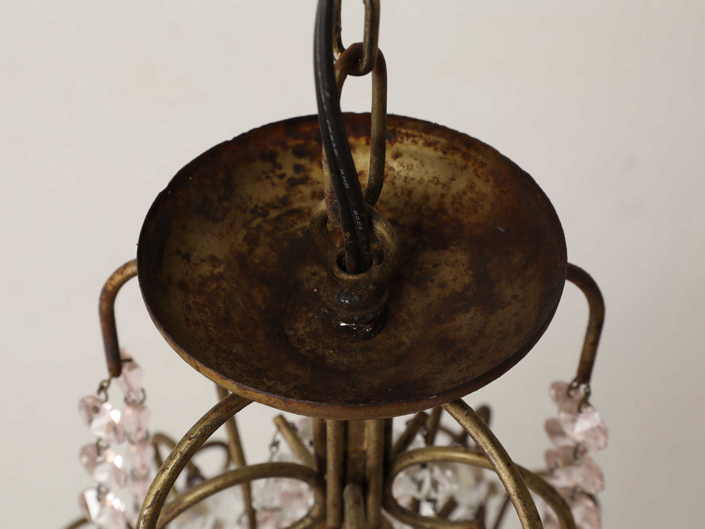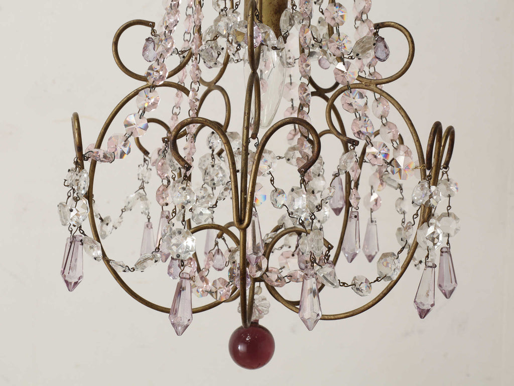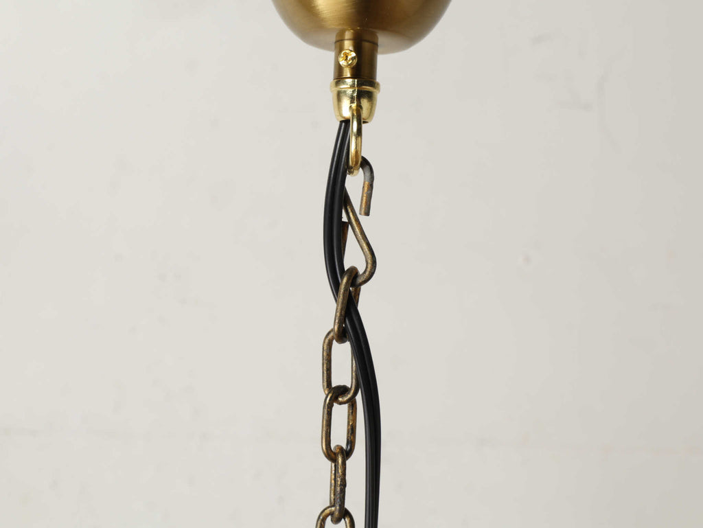 こちらは1920年代(推定)にフランスで製作された一灯タイプのシャンデリアです。華美になりすぎない、慎ましやかな美しさが魅力のアンティーク照明です。アイアンフレームが作り出す落ち着いたブロンズカラーと、そこから滴るようなクリアなガラスパーツのコントラストが特徴です。パーツ一つ一つが光を優しく捉え、煌々と照らす照明というよりも、空間に柔らかな「明かりの雰囲気」を添えるオブジェのような存在感を放ちます。コンパクトな一灯タイプのため、玄関ホールや廊下、または寝室やサニタリールームなど、小さな空間に主張しすぎない華やかさを加えたい時に最適です。フランスの古き良き時代の空気を運び、日常をドラマティックに彩ってくれるでしょう。点灯した瞬間の、ガラスがきらめく幻想的な美しさをお楽しみください。