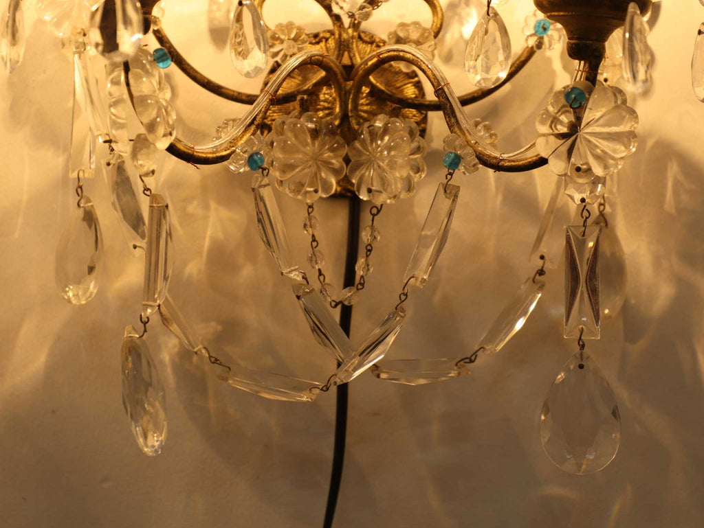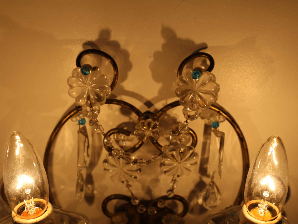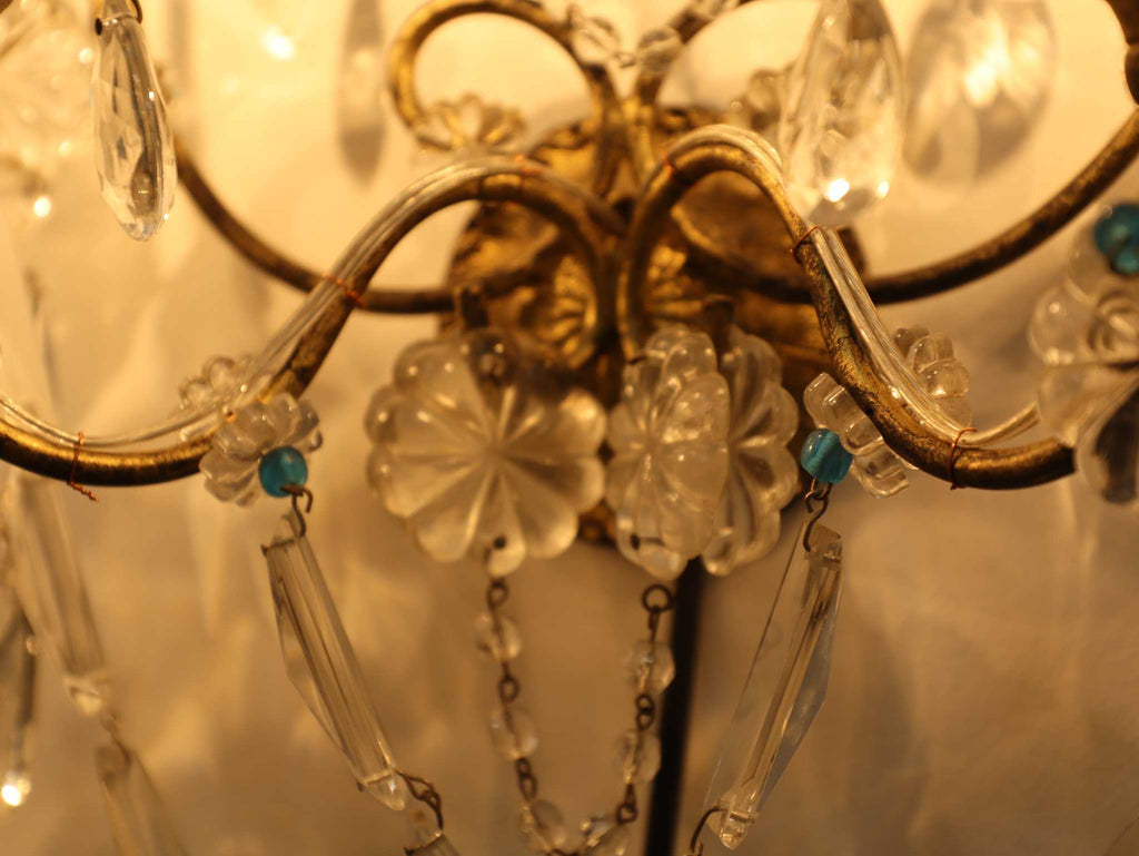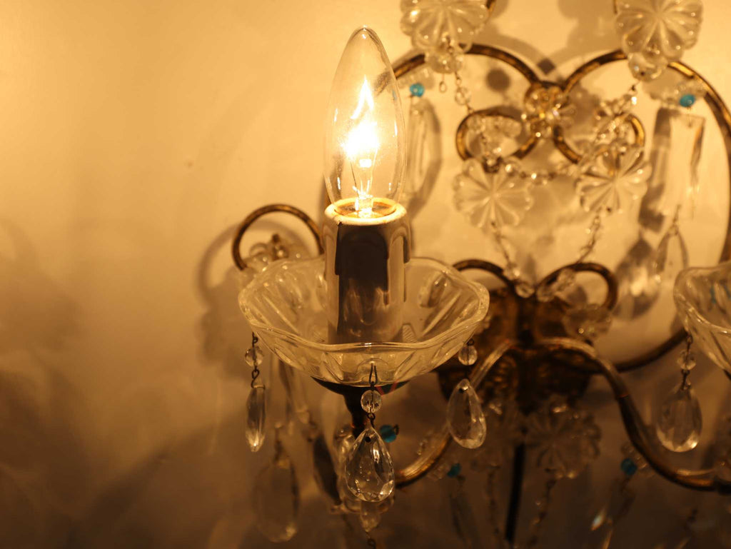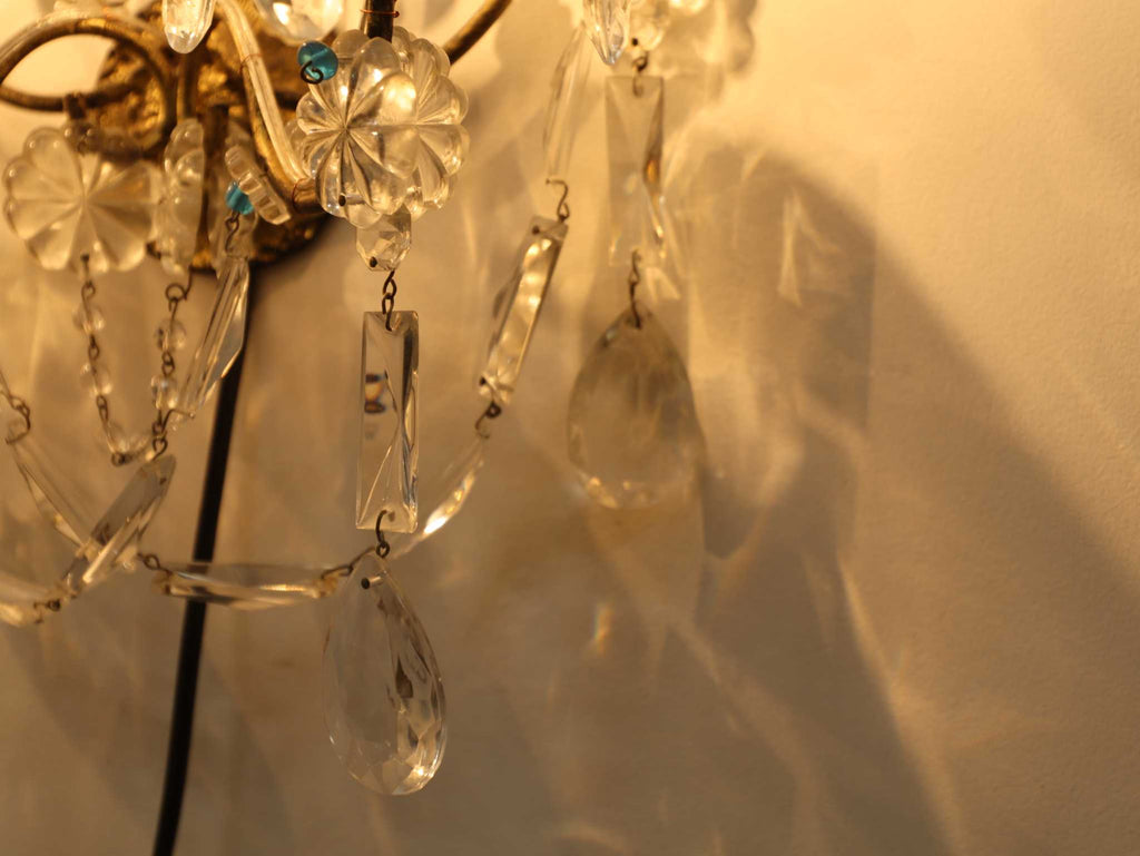 多数のクリスタルガラスの装飾が施されており、非常に華やかで優雅な雰囲気を醸し出しています。カットされたクリアなクリスタルガラスは、光を反射して煌めきを感じさせます。天井から吊るすシャンデリアとはまた異なり、壁に取り付けて使用する照明器具であるウォールランプは、空間に奥行きと上品な間接照明を提供するインテリアアイテムのひとつです。
