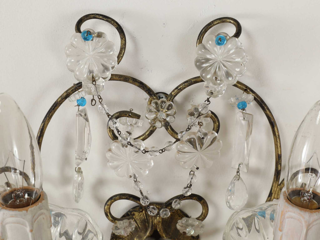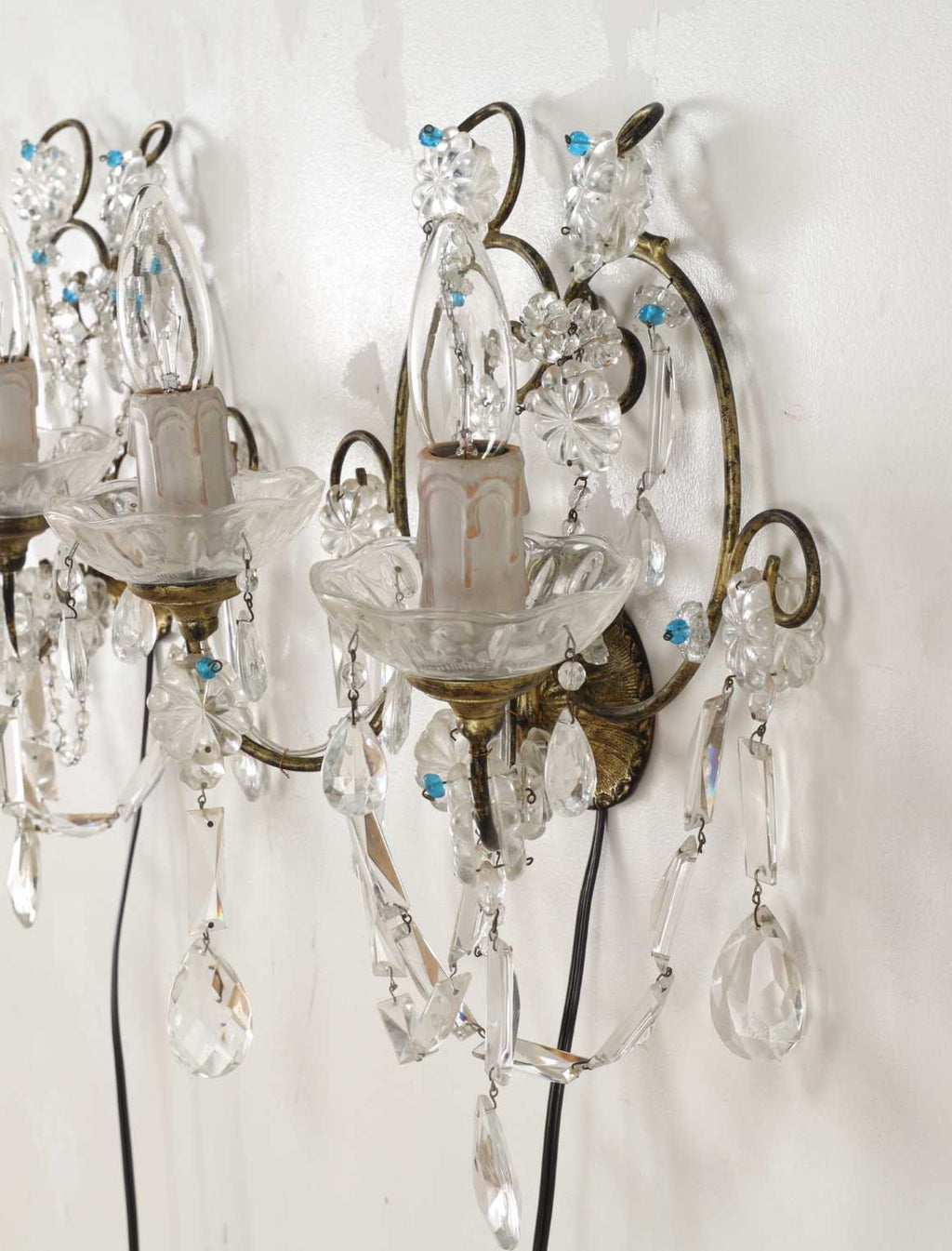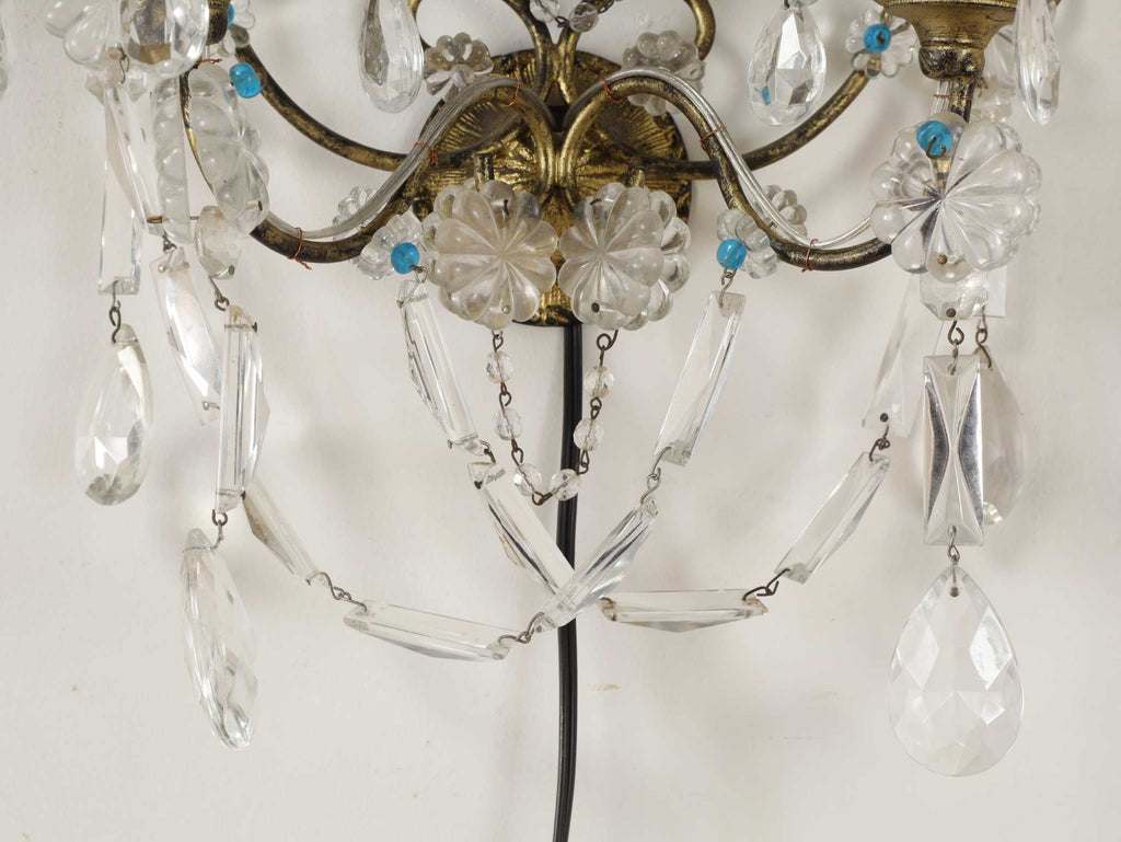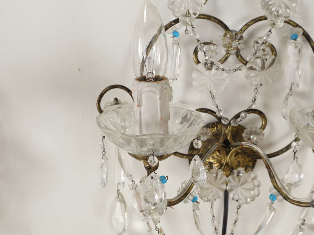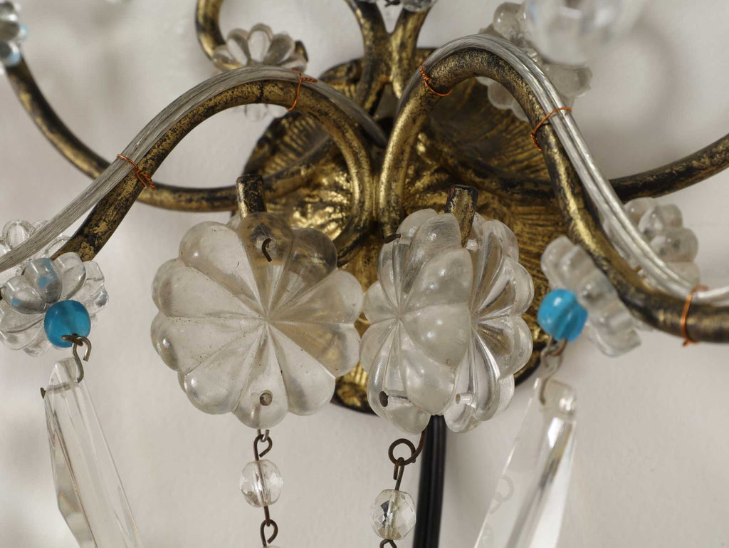 多数のクリスタルガラスの装飾が施されており、非常に華やかで優雅な雰囲気を醸し出しています。カットされたクリアなクリスタルガラスは、光を反射して煌めきを感じさせます。天井から吊るすシャンデリアとはまた異なり、壁に取り付けて使用する照明器具であるウォールランプは、空間に奥行きと上品な間接照明を提供するインテリアアイテムのひとつです。