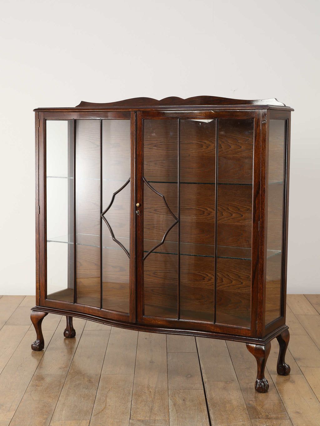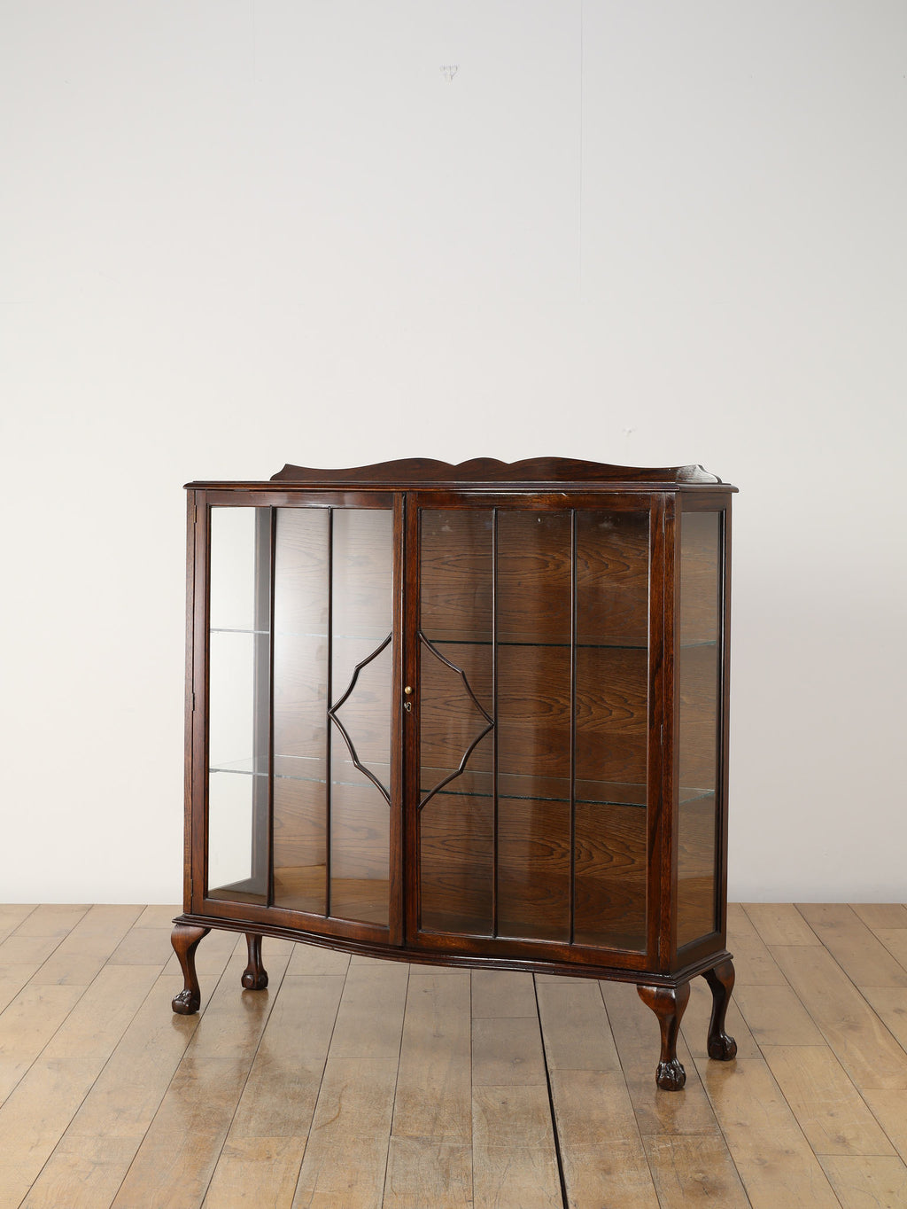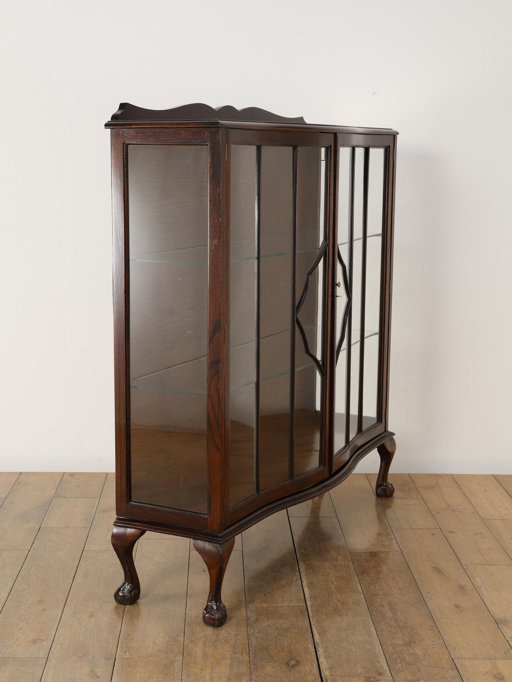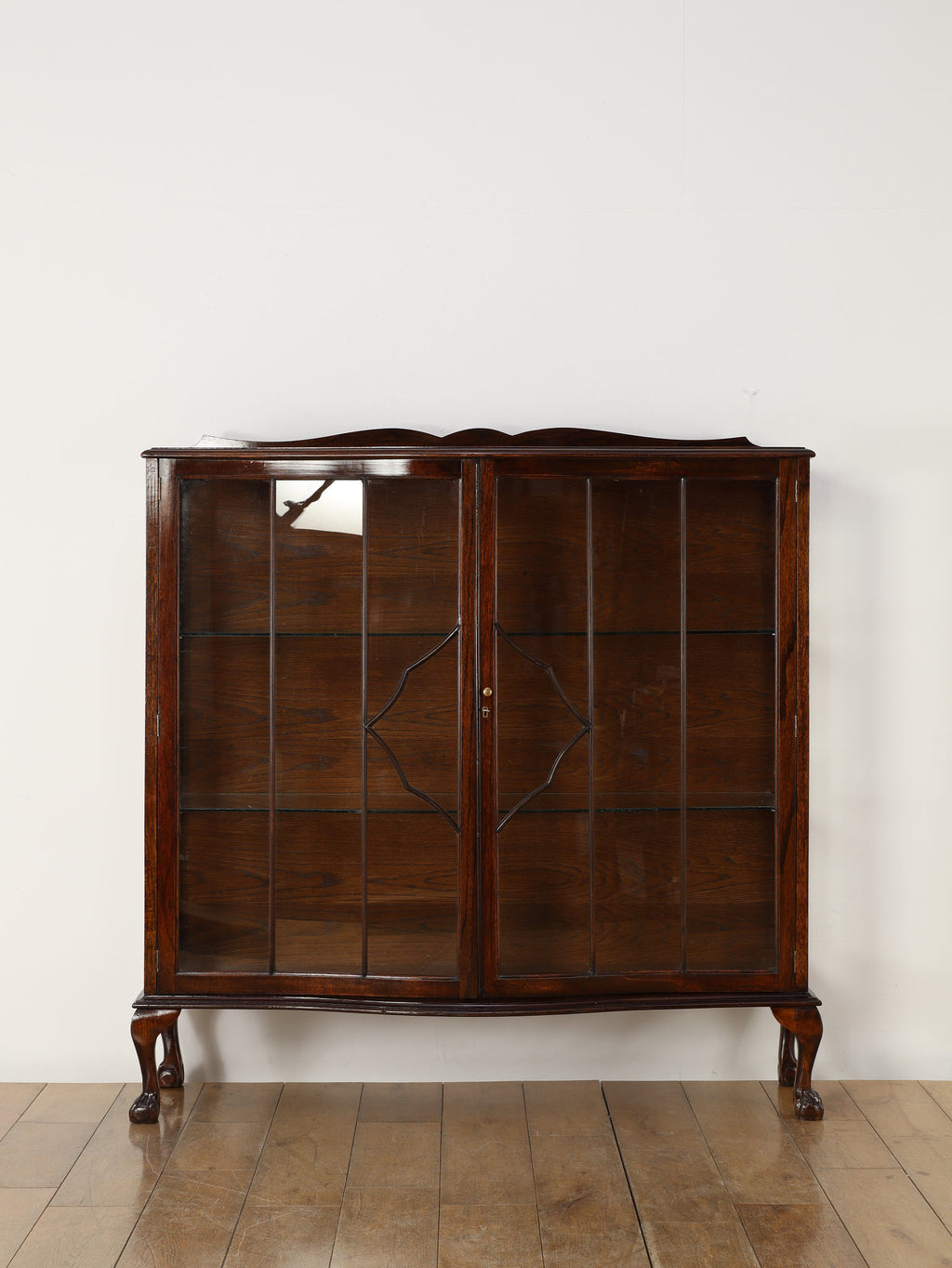 1920年代(推定)にイギリスで製作されたアンティーク。美しいガラス扉、そして内部のガラス棚の造りは、本だけでなく食器やコレクションを飾るのに最適なキャビネットです。脚が優雅なS字カーブを描く猫脚のデザインになっており、華麗な風合いを醸し出します。派手な装飾が無く、よりすっきりとした仕上がりで、古き良き時代の背景が感じられる逸品です。