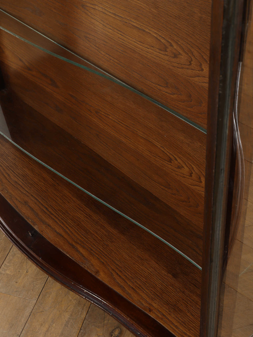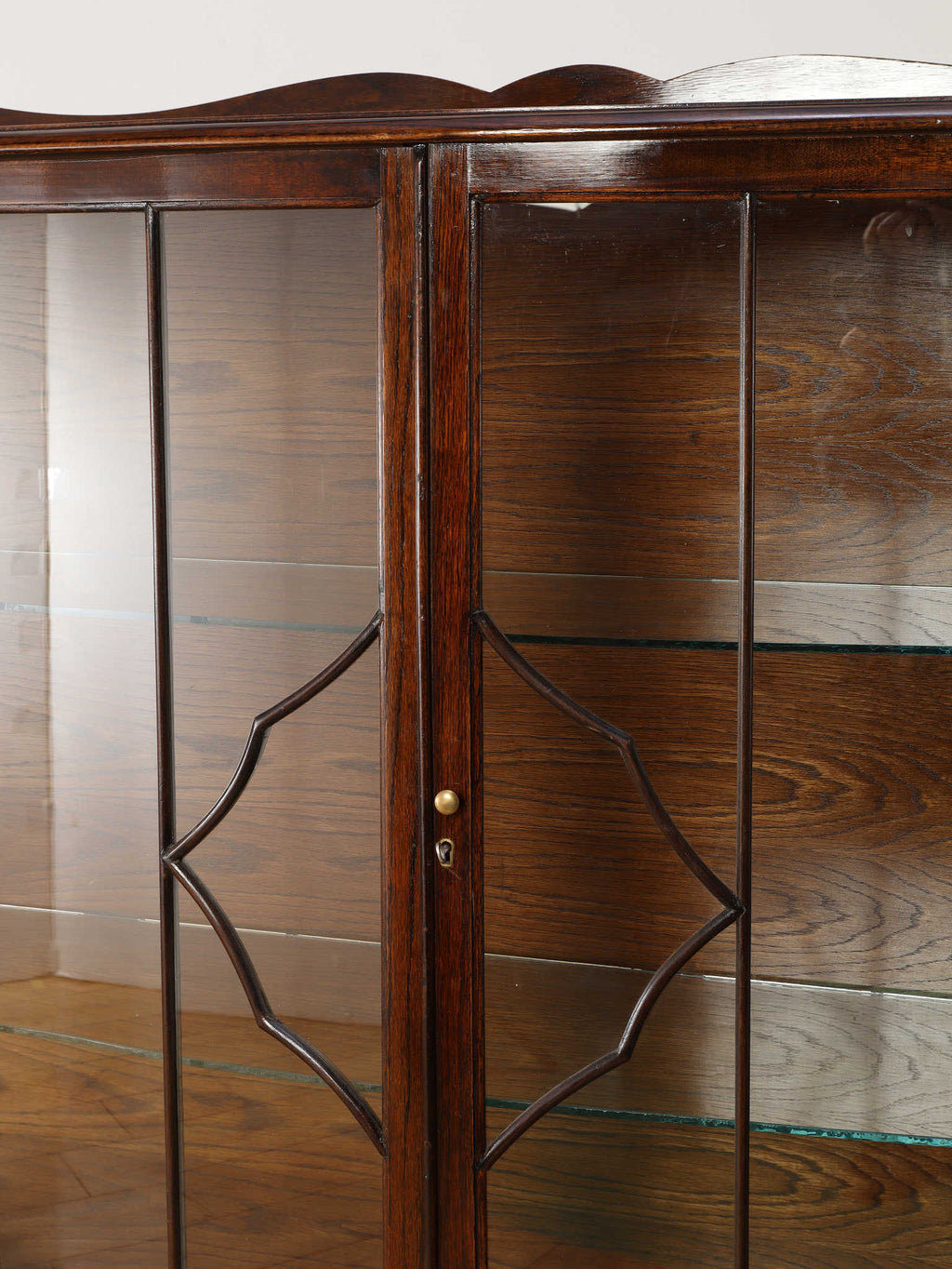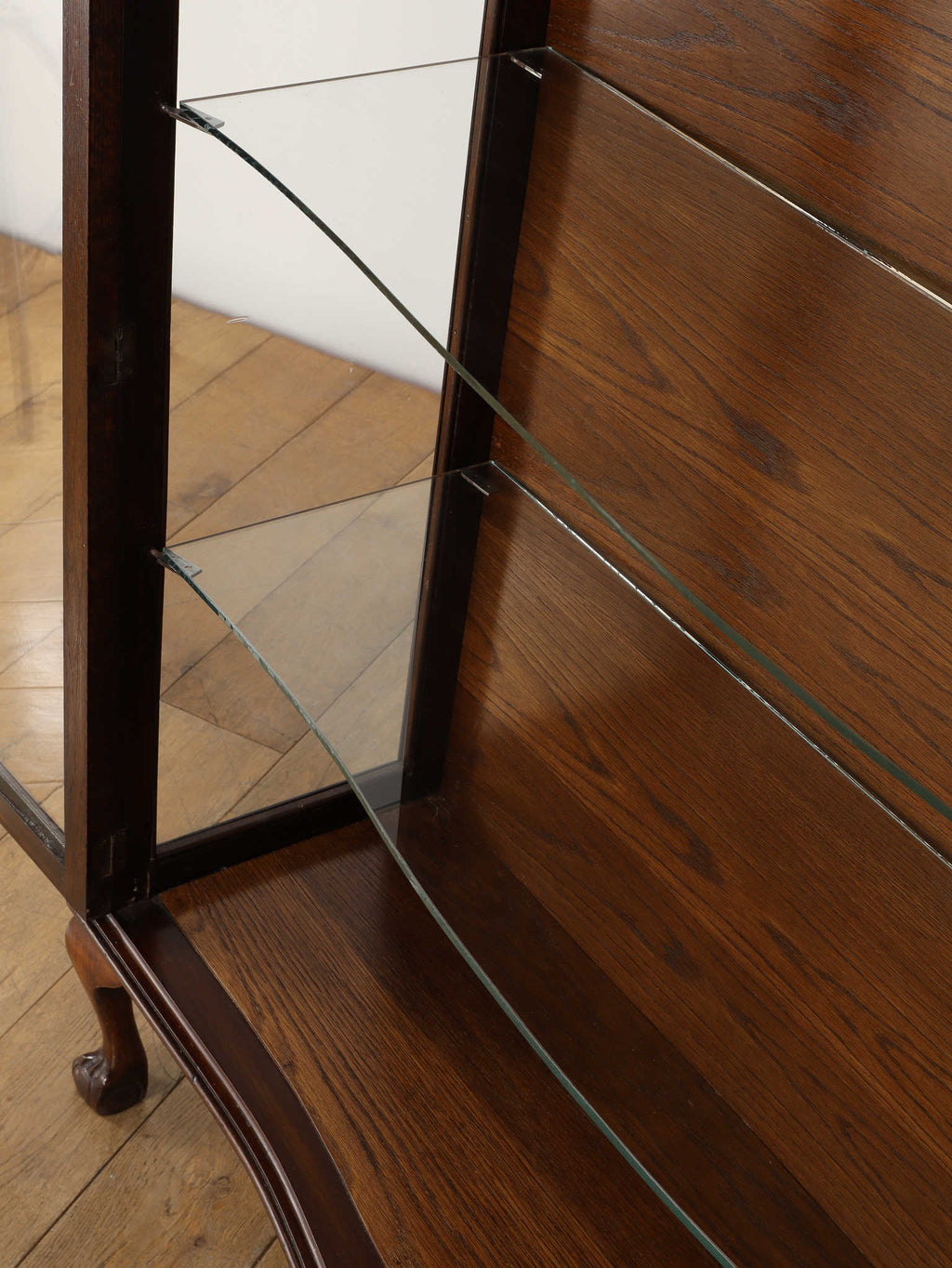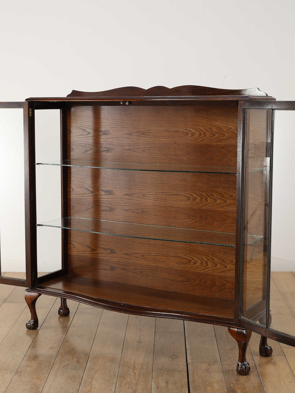 1920年代(推定)にイギリスで製作されたアンティーク。美しいガラス扉、そして内部のガラス棚の造りは、本だけでなく食器やコレクションを飾るのに最適なキャビネットです。脚が優雅なS字カーブを描く猫脚のデザインになっており、華麗な風合いを醸し出します。派手な装飾が無く、よりすっきりとした仕上がりで、古き良き時代の背景が感じられる逸品です。