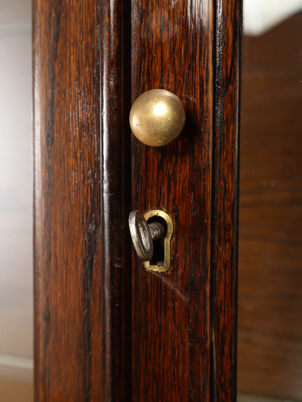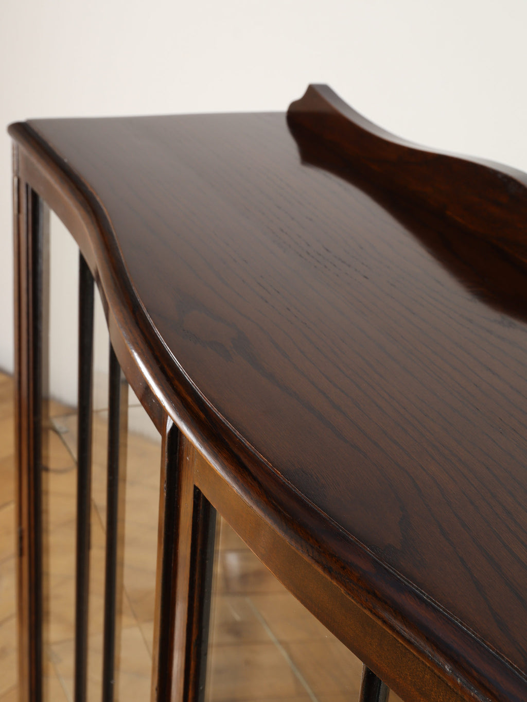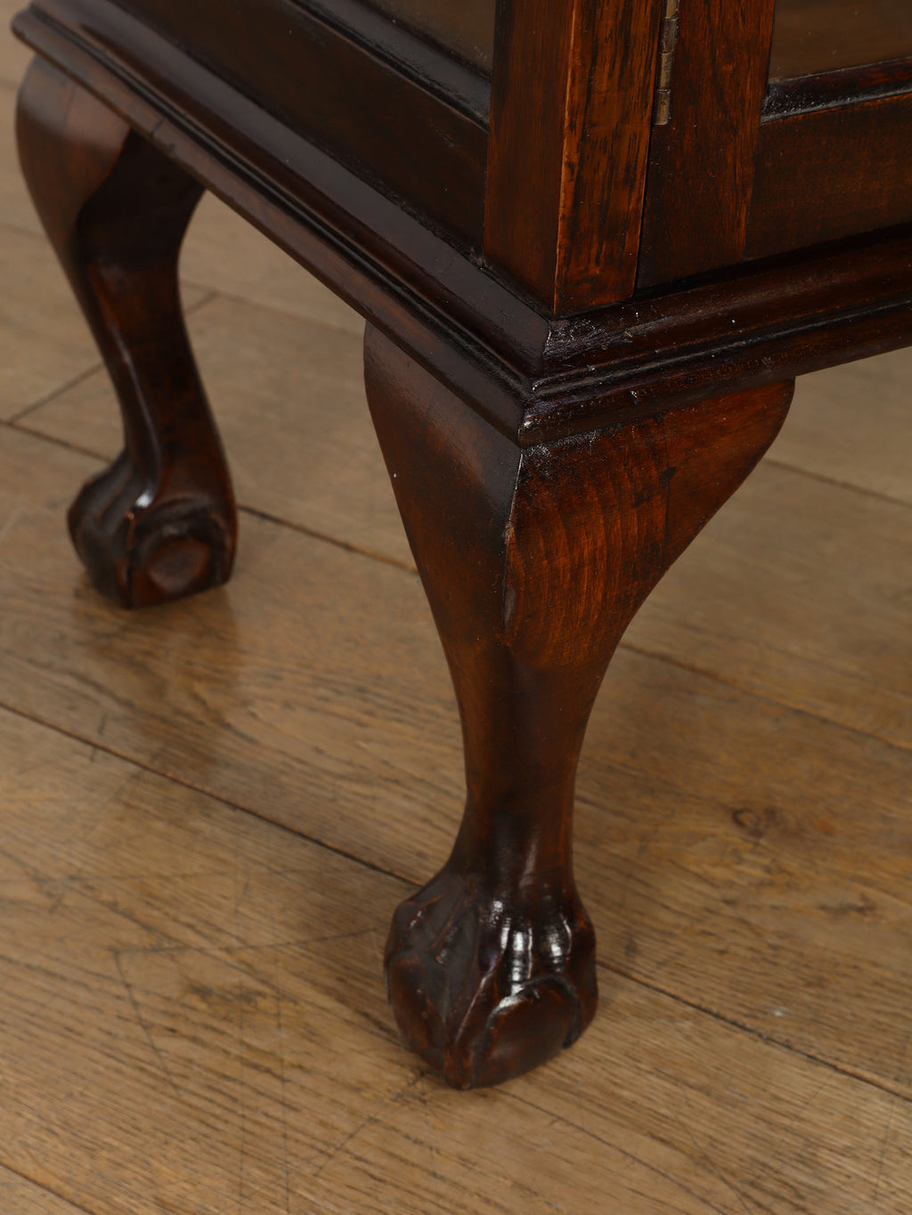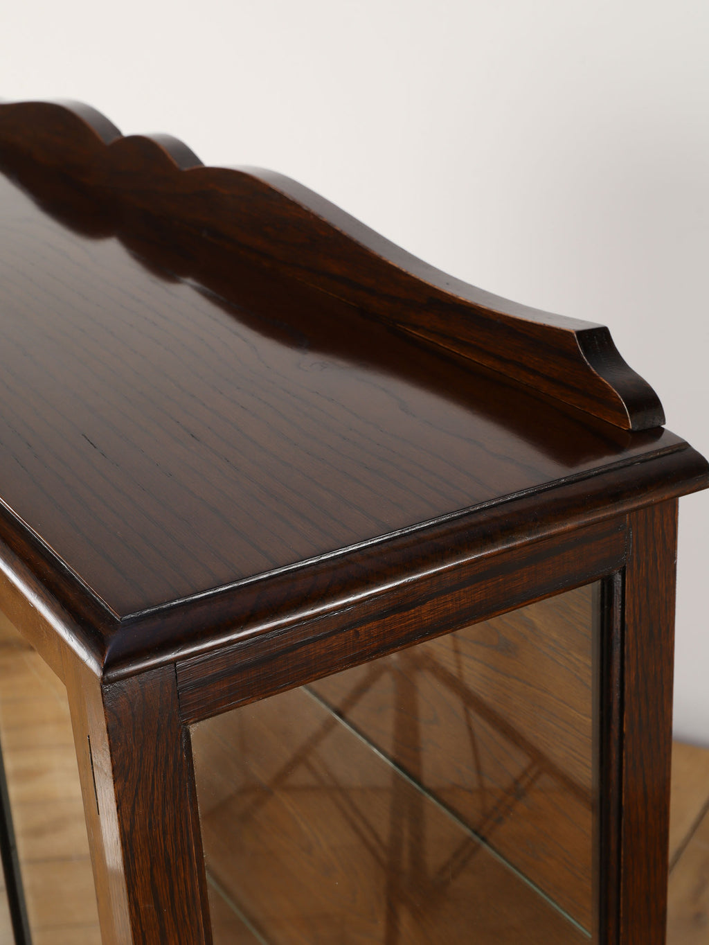 1920年代(推定)にイギリスで製作されたアンティーク。美しいガラス扉、そして内部のガラス棚の造りは、本だけでなく食器やコレクションを飾るのに最適なキャビネットです。脚が優雅なS字カーブを描く猫脚のデザインになっており、華麗な風合いを醸し出します。派手な装飾が無く、よりすっきりとした仕上がりで、古き良き時代の背景が感じられる逸品です。