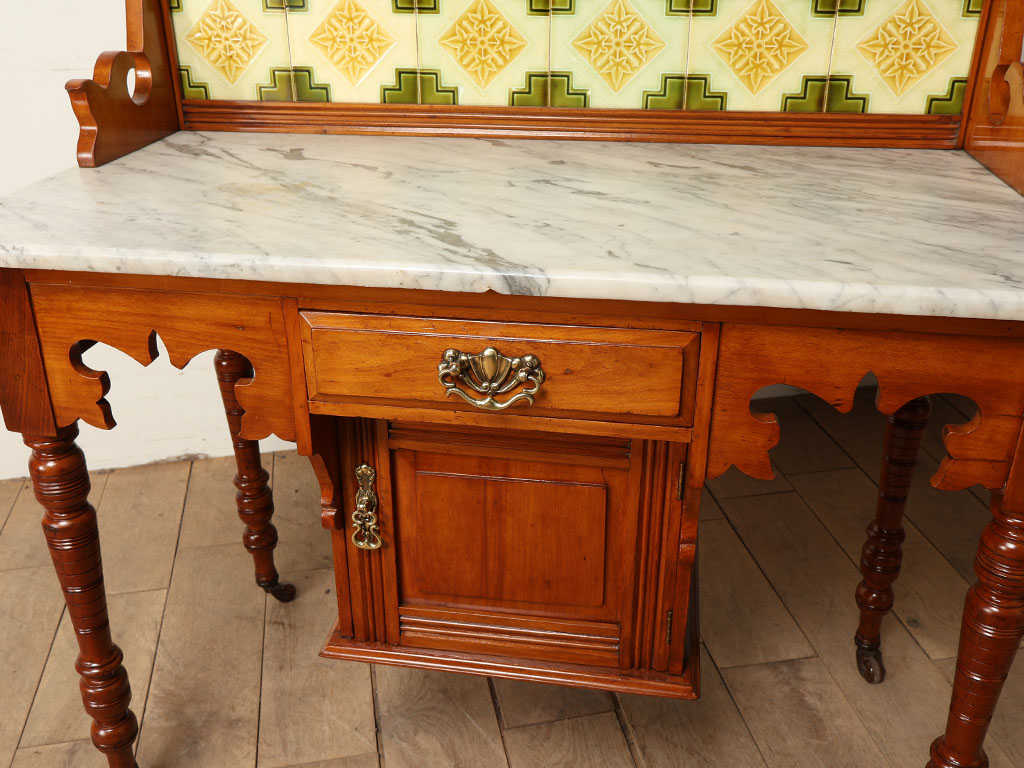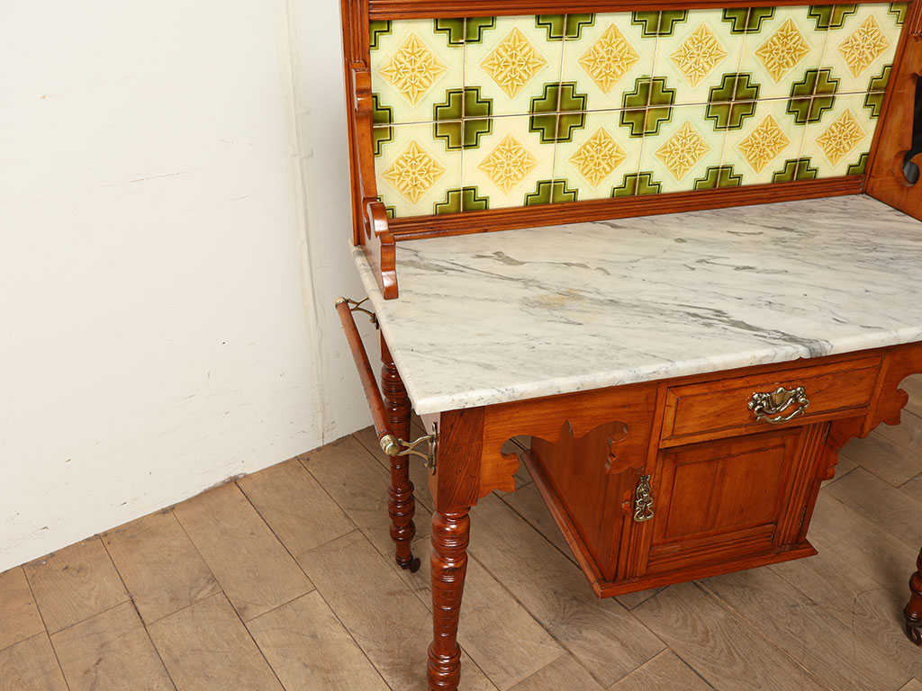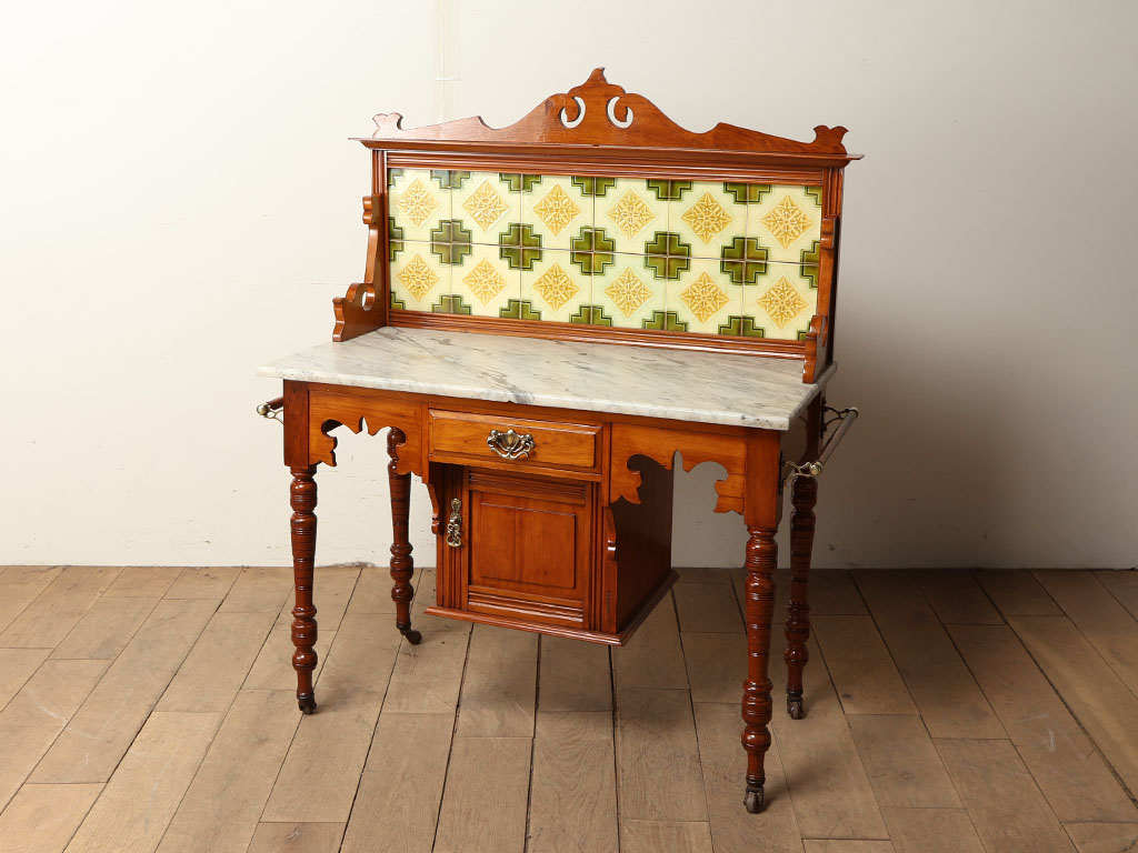 1910年代(推定)のイギリスで製作された、気品溢れるウォッシュスタンドです。最大の特徴はサテンウッド、マーブル(大理石)、そしてタイルという、異素材が合わさった魅力的な存在感にあります。背面に並ぶのは繊細な幾何学模様が描かれた美しいタイル。古くからの伝統を感じさせる色使いが、壁面を華やかに彩ります。また、天板には存在感のある大理石が贅沢にあしらわれ、天然石ならではの質感と優雅な模様が素材感にメリハリをつける良いアクセントになります。これらを支えるのは、上品な光沢を放つサテンウッドの魅力的な質感です。明るく柔らかな木肌が全体を優しくまとめ上げ、アンティークならではの格式高い風格を漂わせます。現代では贅沢なコンソールテーブルとして日常に彩りを添えてくれることでしょう。