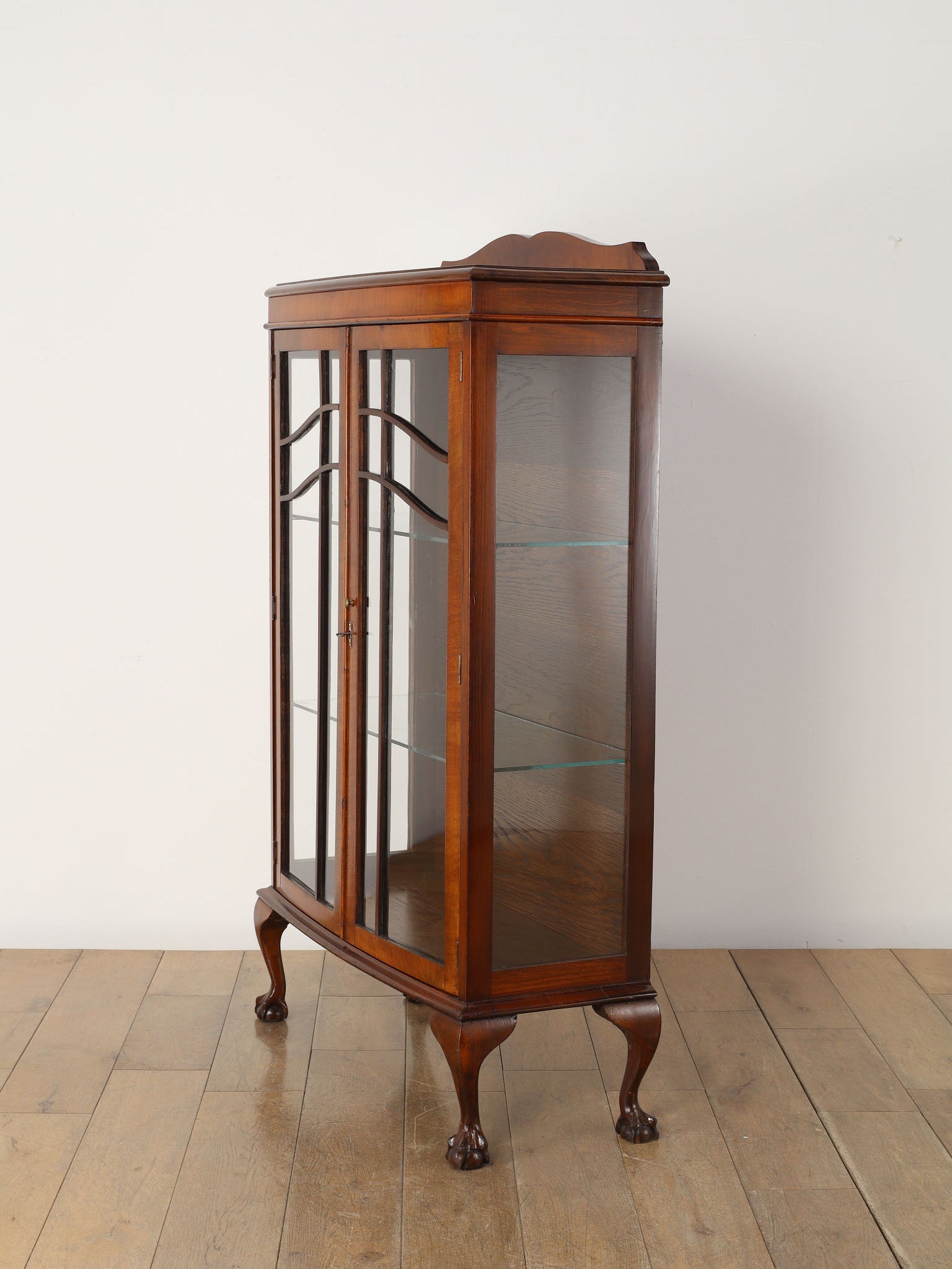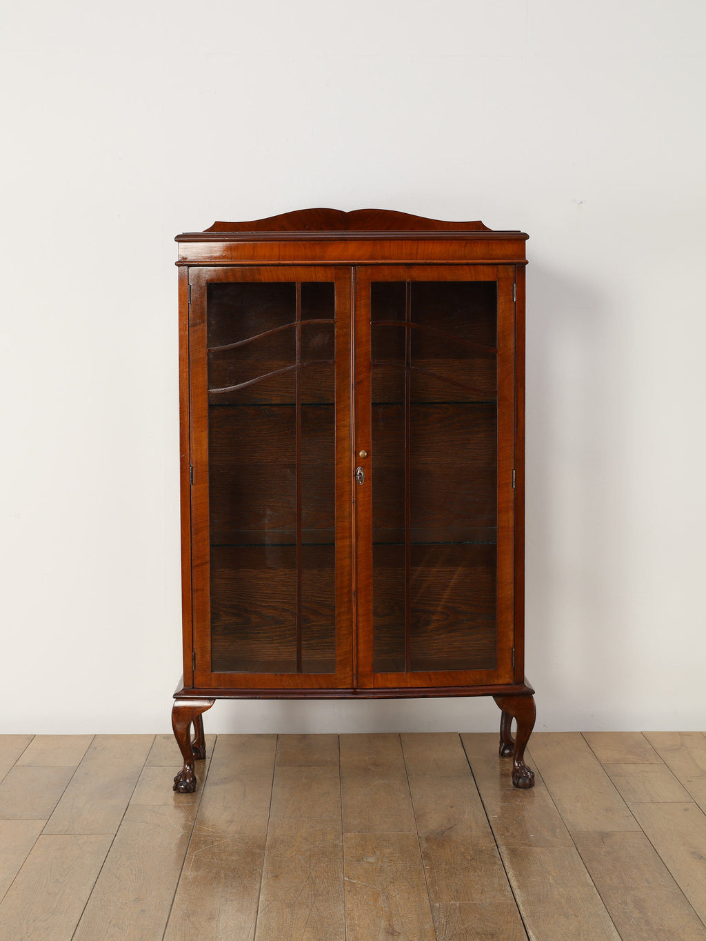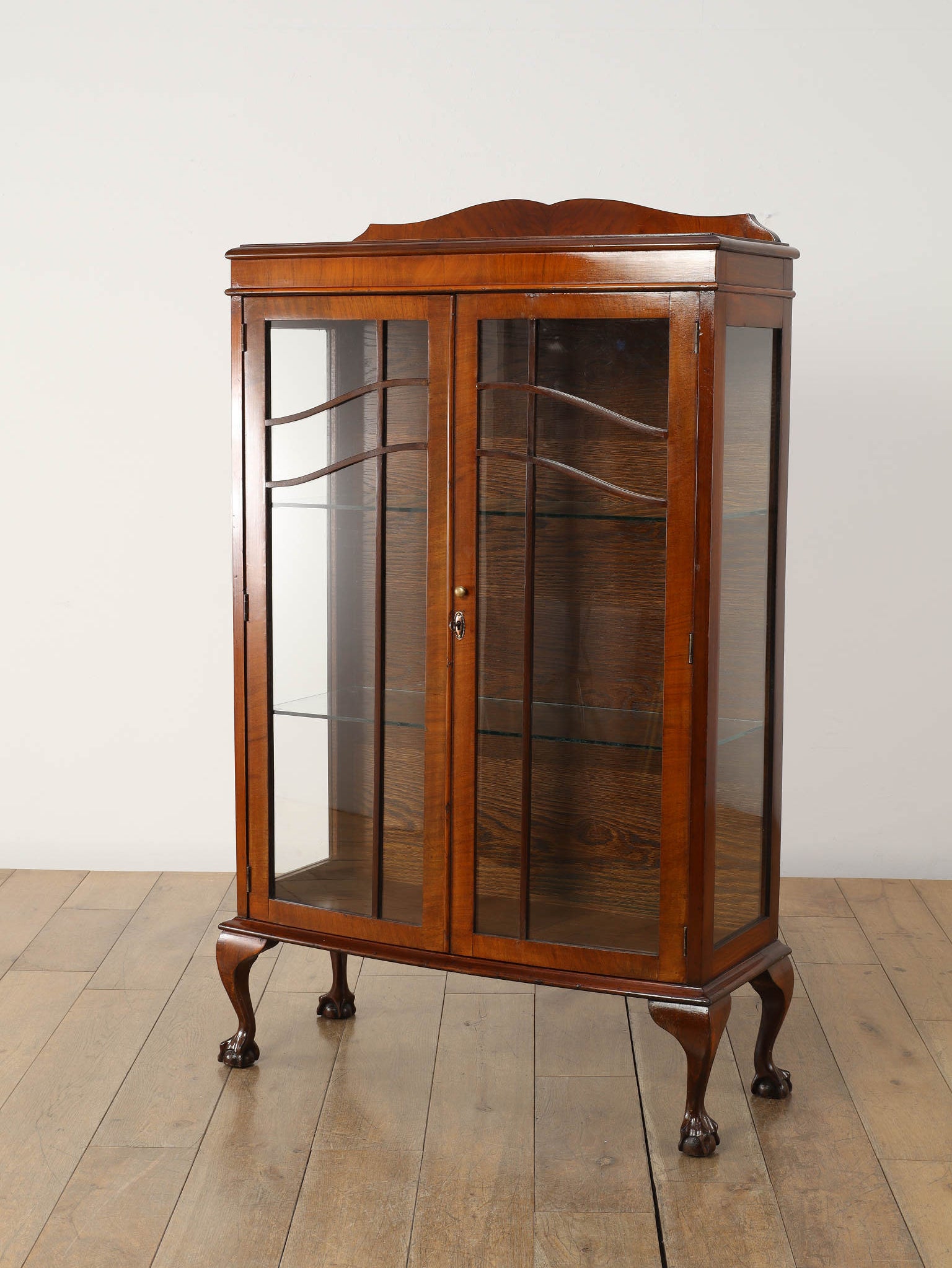 1930年代(推定)、英国アンティークのチャイナキャビネット。ボーンチャイナ(白磁器)を収納していた事に由来し、英国のキャビネットはこのような名前で呼ばれる事が多くあります。左右の側板はガラスによって仕上げられ、中に収納したものがより美しく見える効果があります。様々なデザイン、サイズが存在し、ものを飾る文化が色濃い英国アンティークならではの家具と言えます。ウォルナットの軽やかな印象が映えるこちらの個体は、猛禽類が珠を握っているボウル&クロウと呼ばれる幸福のシンボルが脚部に彫り込まれ、エレガントさと英国クラシックの格式をお楽しみ頂ける一台です。
