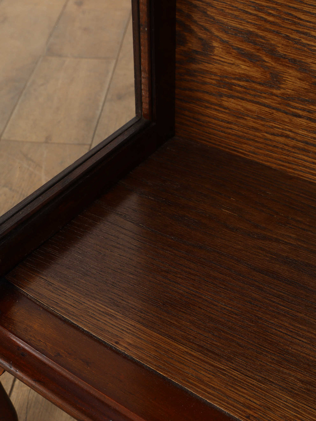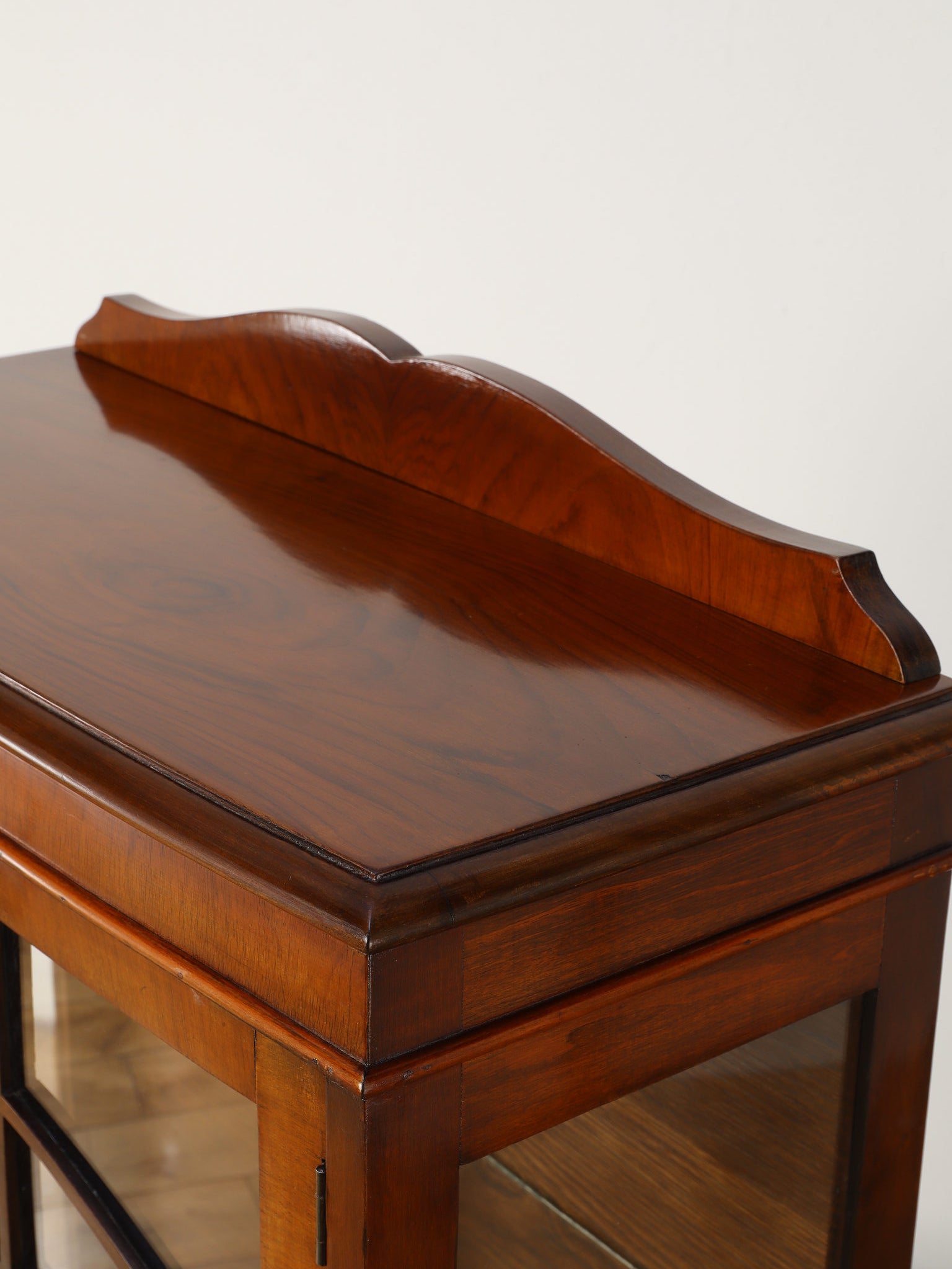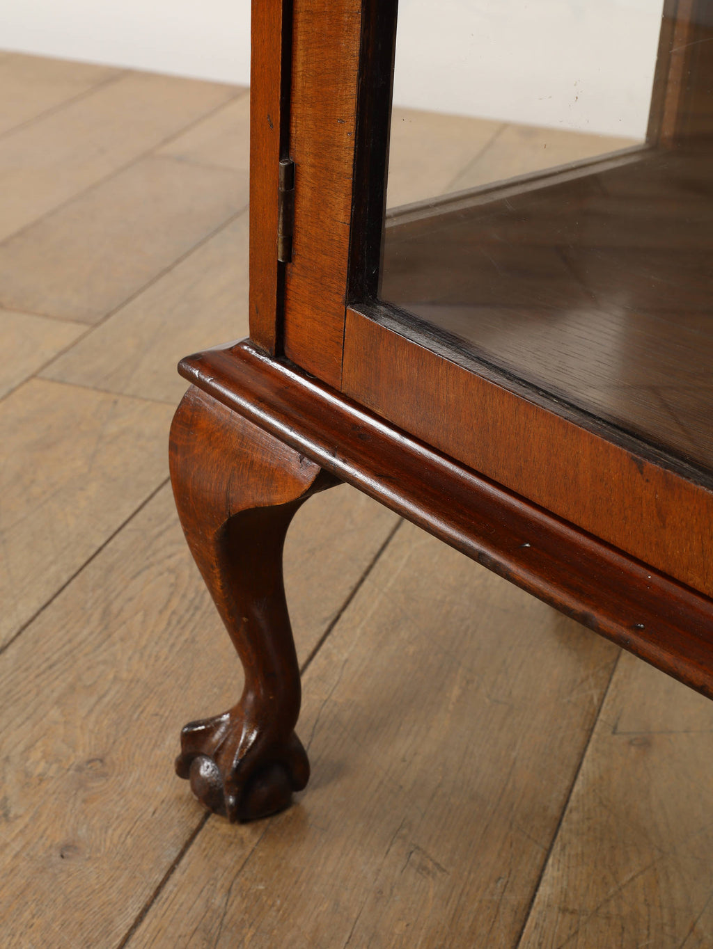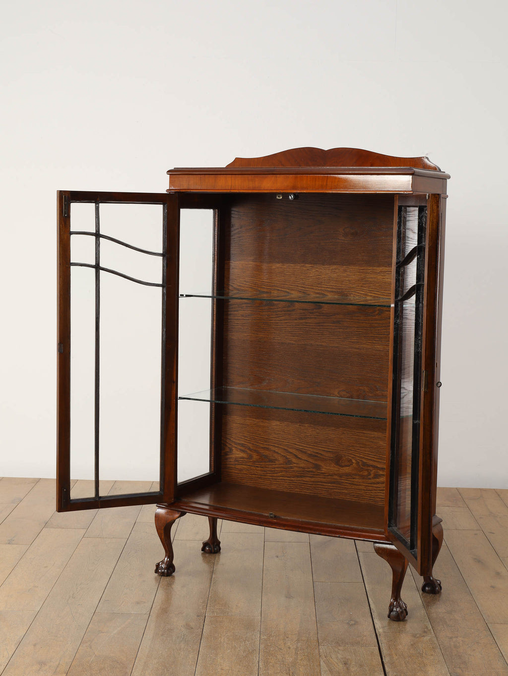 1930年代(推定)、英国アンティークのチャイナキャビネット。ボーンチャイナ(白磁器)を収納していた事に由来し、英国のキャビネットはこのような名前で呼ばれる事が多くあります。左右の側板はガラスによって仕上げられ、中に収納したものがより美しく見える効果があります。様々なデザイン、サイズが存在し、ものを飾る文化が色濃い英国アンティークならではの家具と言えます。ウォルナットの軽やかな印象が映えるこちらの個体は、猛禽類が珠を握っているボウル&クロウと呼ばれる幸福のシンボルが脚部に彫り込まれ、エレガントさと英国クラシックの格式をお楽しみ頂ける一台です。