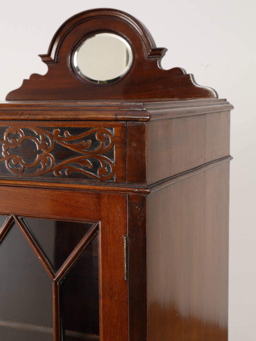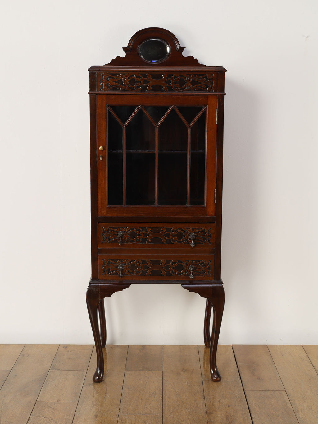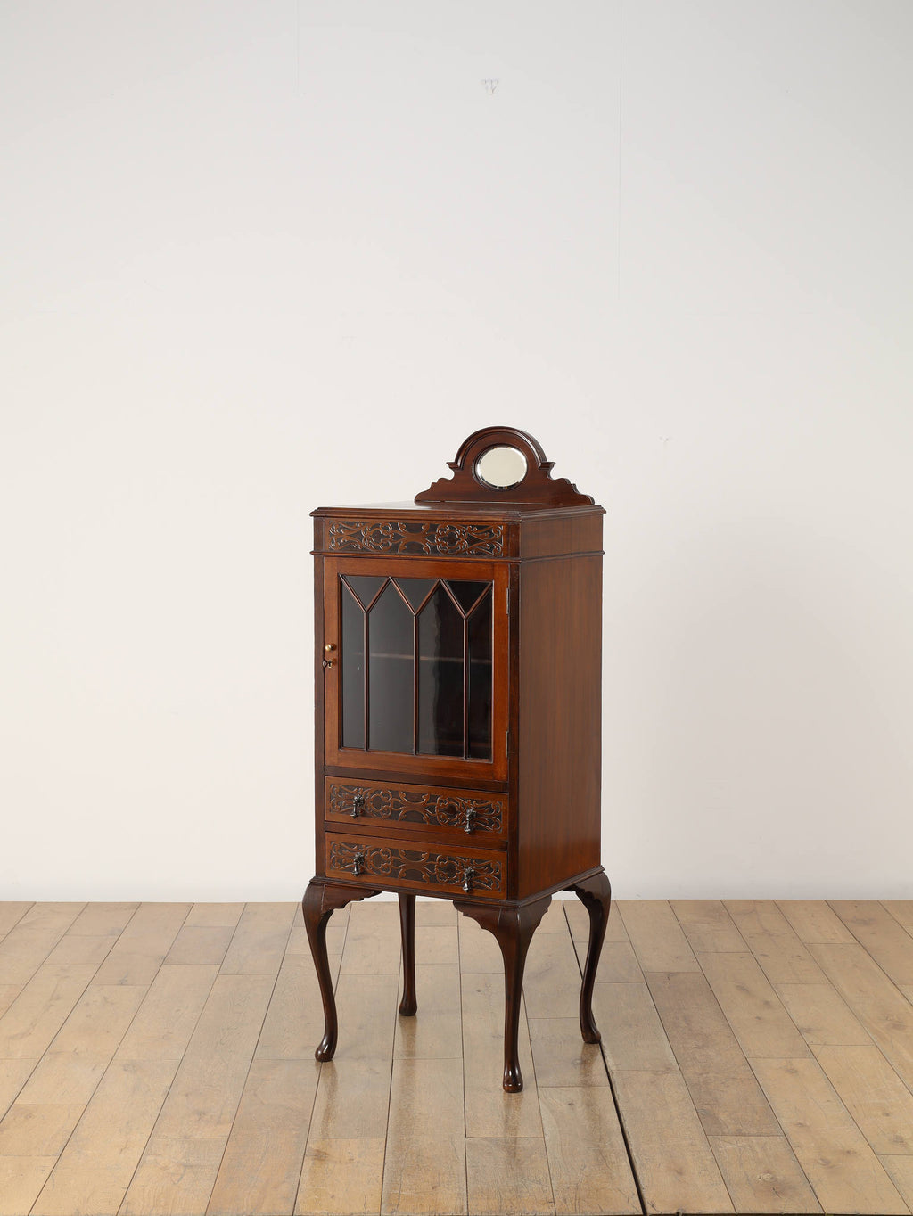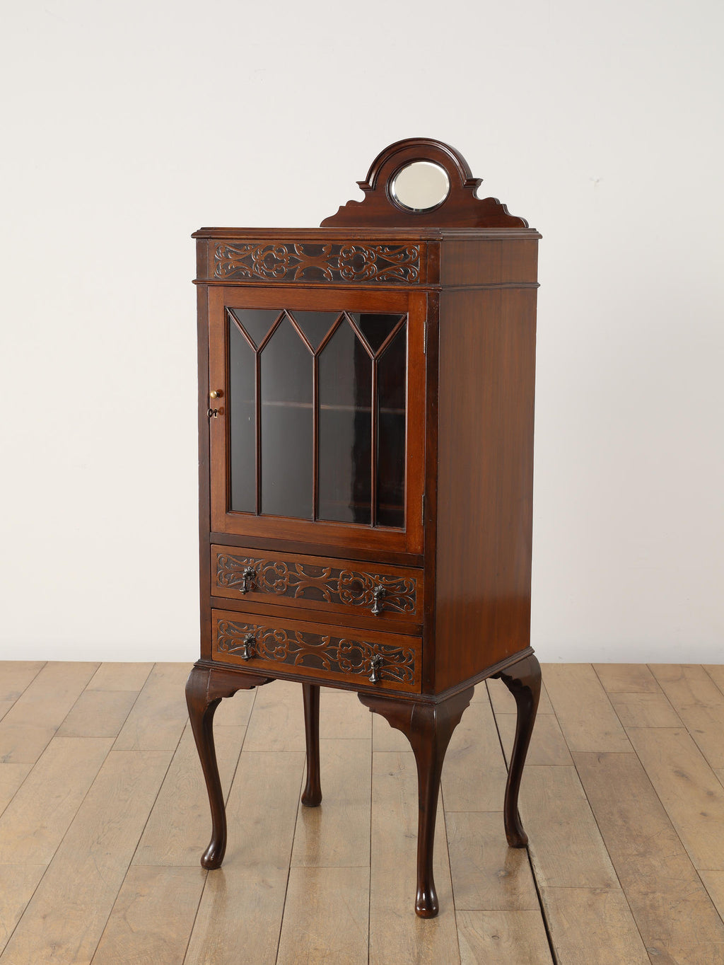 1890年代(推定)に製造されたヴィクトリアンディスプレイブックケースです。エレガントな曲線を描く猫脚と、細部まで施された美しい象嵌細工が目を引く、ヴィクトリアンスタイルのブックケースです。素材には、艶やかな表情と深みのある色合いが特徴のマホガニー材が使用されており、優雅な雰囲気を醸し出しています。上部には、装飾的な鏡が備えられたトップ。ガラス扉の内部は、お気に入りの洋書や美術品、コレクションを飾るのに最適です。また、下部には引き出しが2杯あり、小物の収納にも便利です。高さがありながら、横幅と奥行きを抑えたスリムな設計で、空間に圧迫感を与えません。玄関先やリビングの一角など、限られたスペースにも取り入れやすいサイズ感です。英国貴族の邸宅のような、華やかで格調高い空間を演出してくれるでしょう。