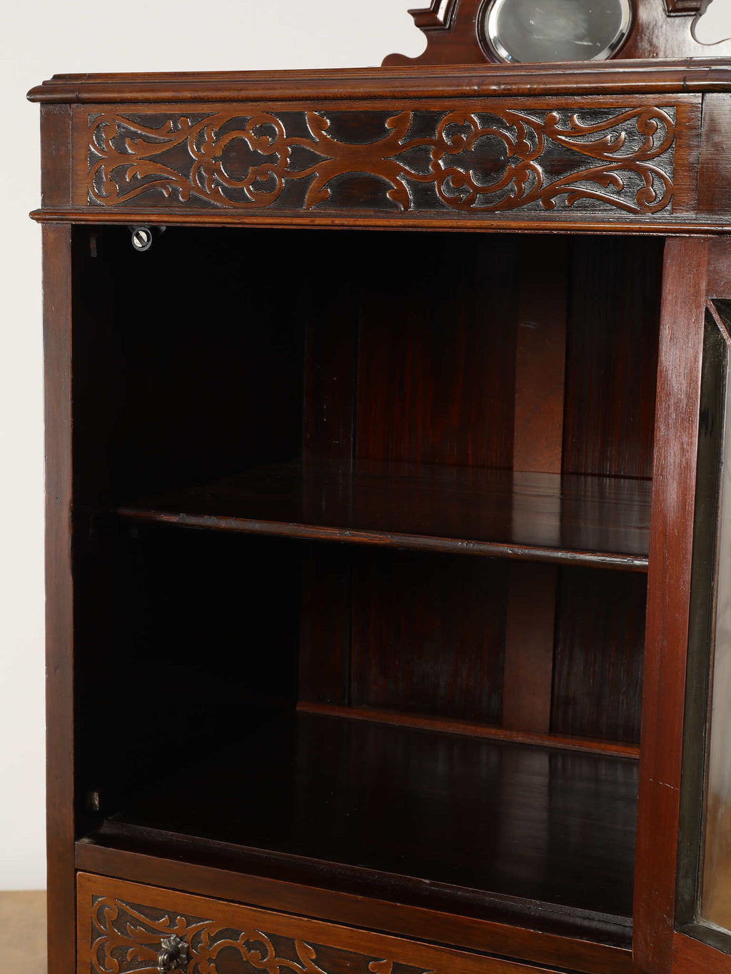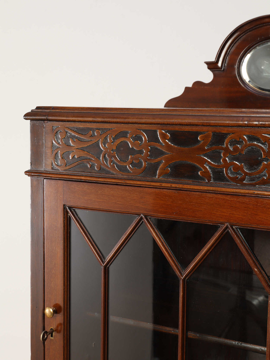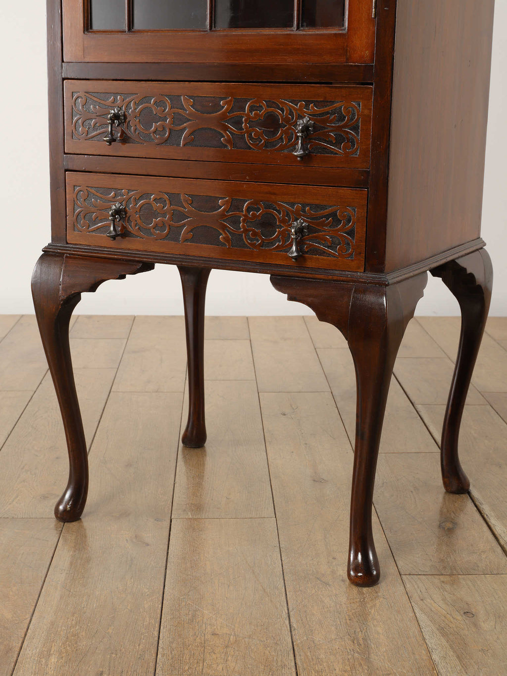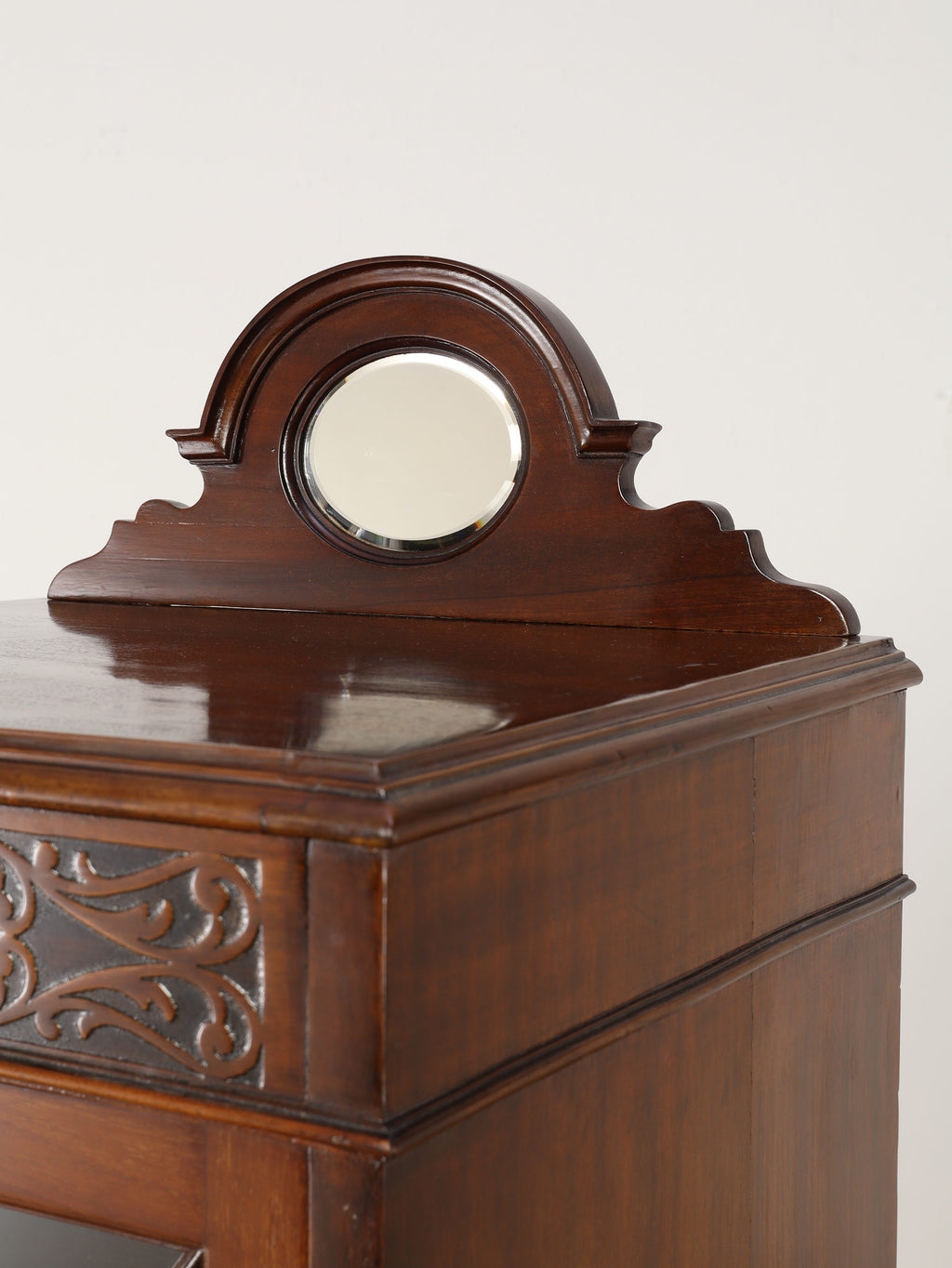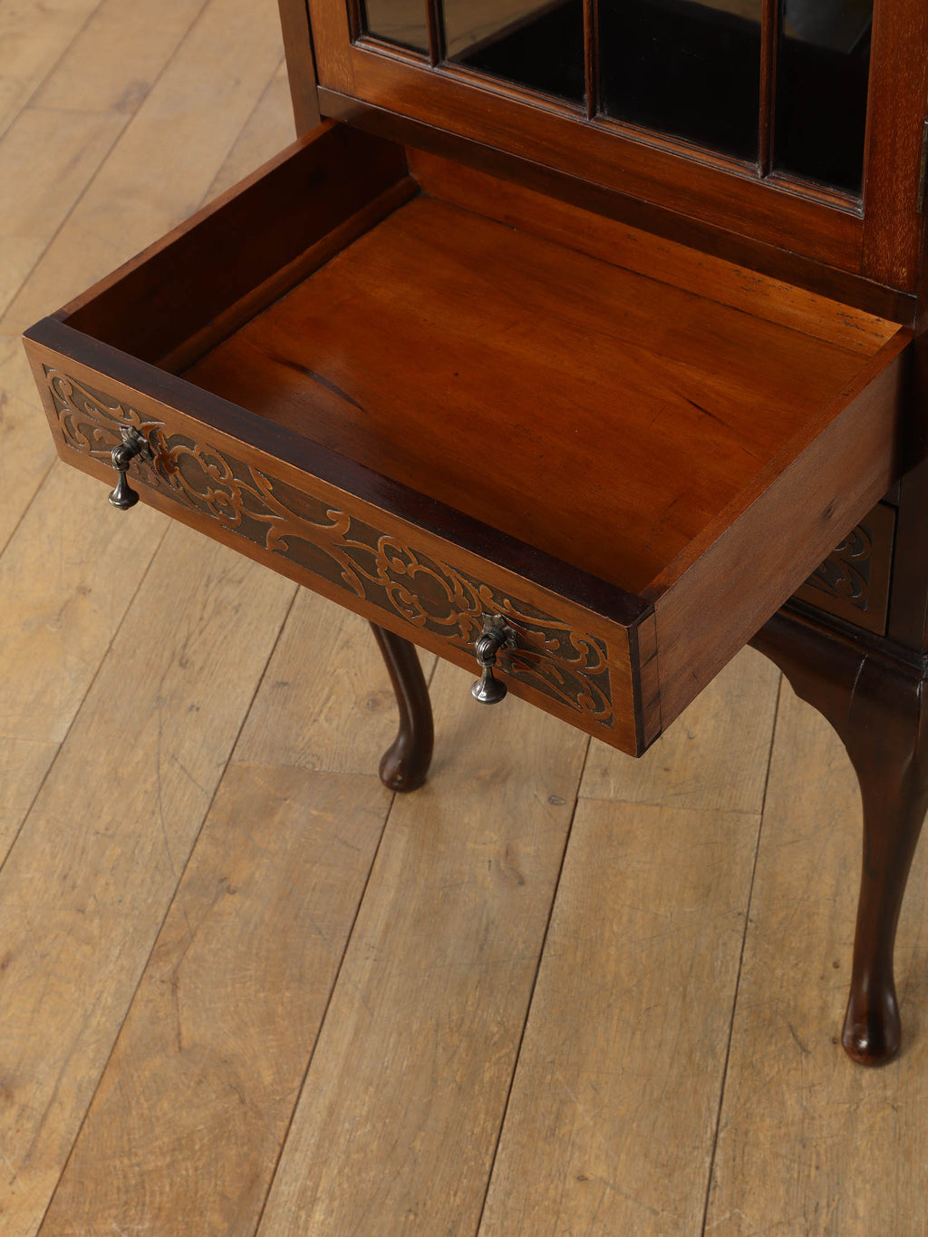 1890年代(推定)に製造されたヴィクトリアンディスプレイブックケースです。エレガントな曲線を描く猫脚と、細部まで施された美しい象嵌細工が目を引く、ヴィクトリアンスタイルのブックケースです。素材には、艶やかな表情と深みのある色合いが特徴のマホガニー材が使用されており、優雅な雰囲気を醸し出しています。上部には、装飾的な鏡が備えられたトップ。ガラス扉の内部は、お気に入りの洋書や美術品、コレクションを飾るのに最適です。また、下部には引き出しが2杯あり、小物の収納にも便利です。高さがありながら、横幅と奥行きを抑えたスリムな設計で、空間に圧迫感を与えません。玄関先やリビングの一角など、限られたスペースにも取り入れやすいサイズ感です。英国貴族の邸宅のような、華やかで格調高い空間を演出してくれるでしょう。