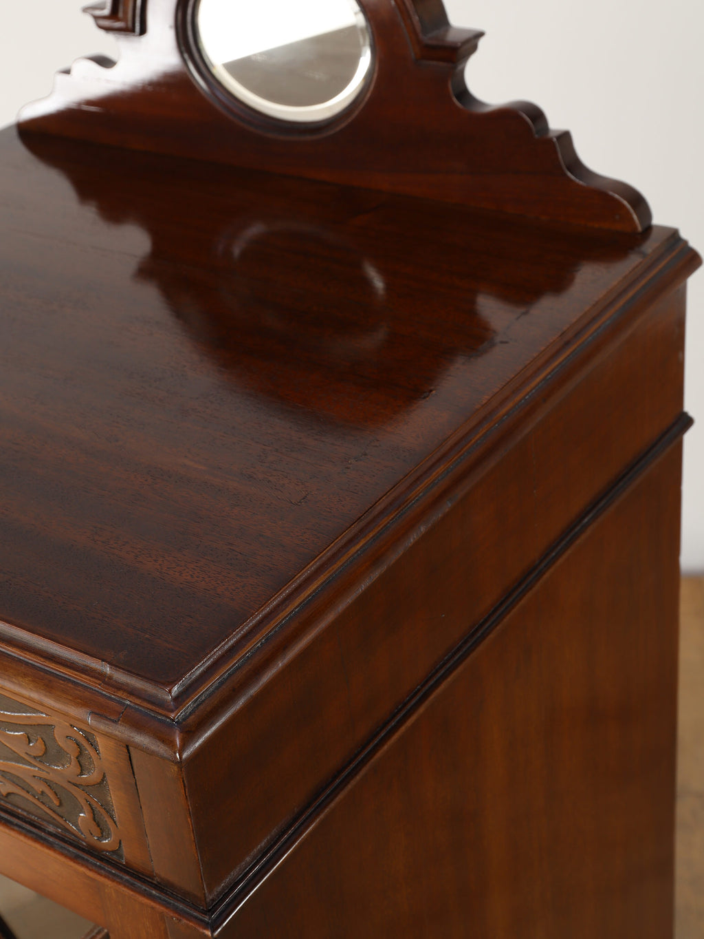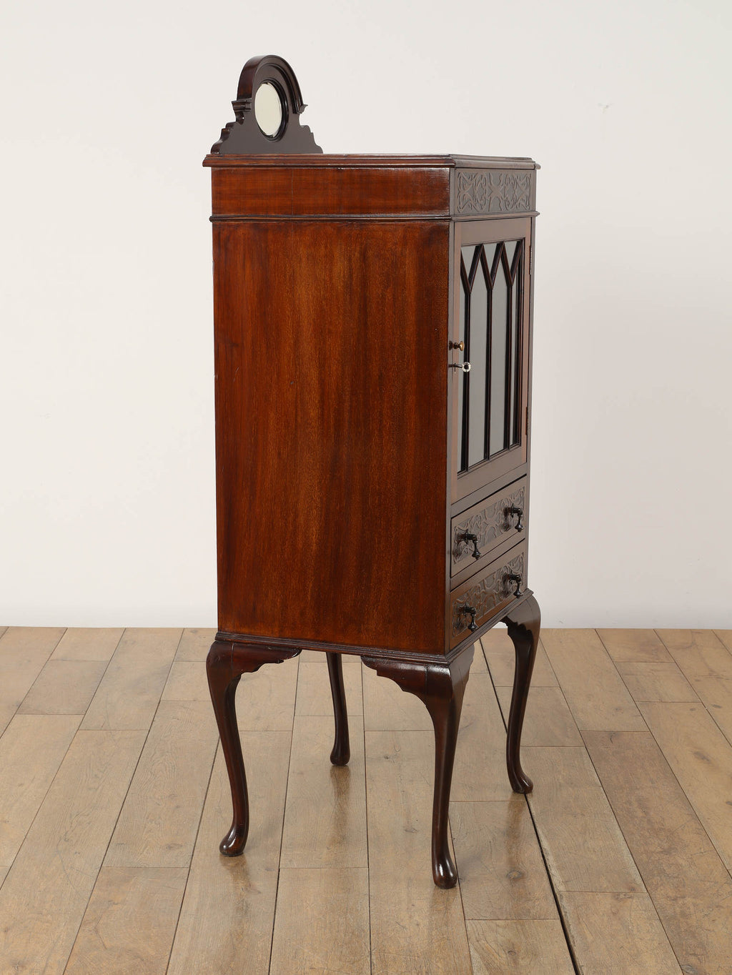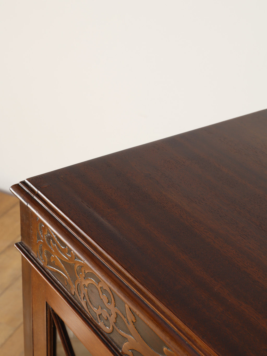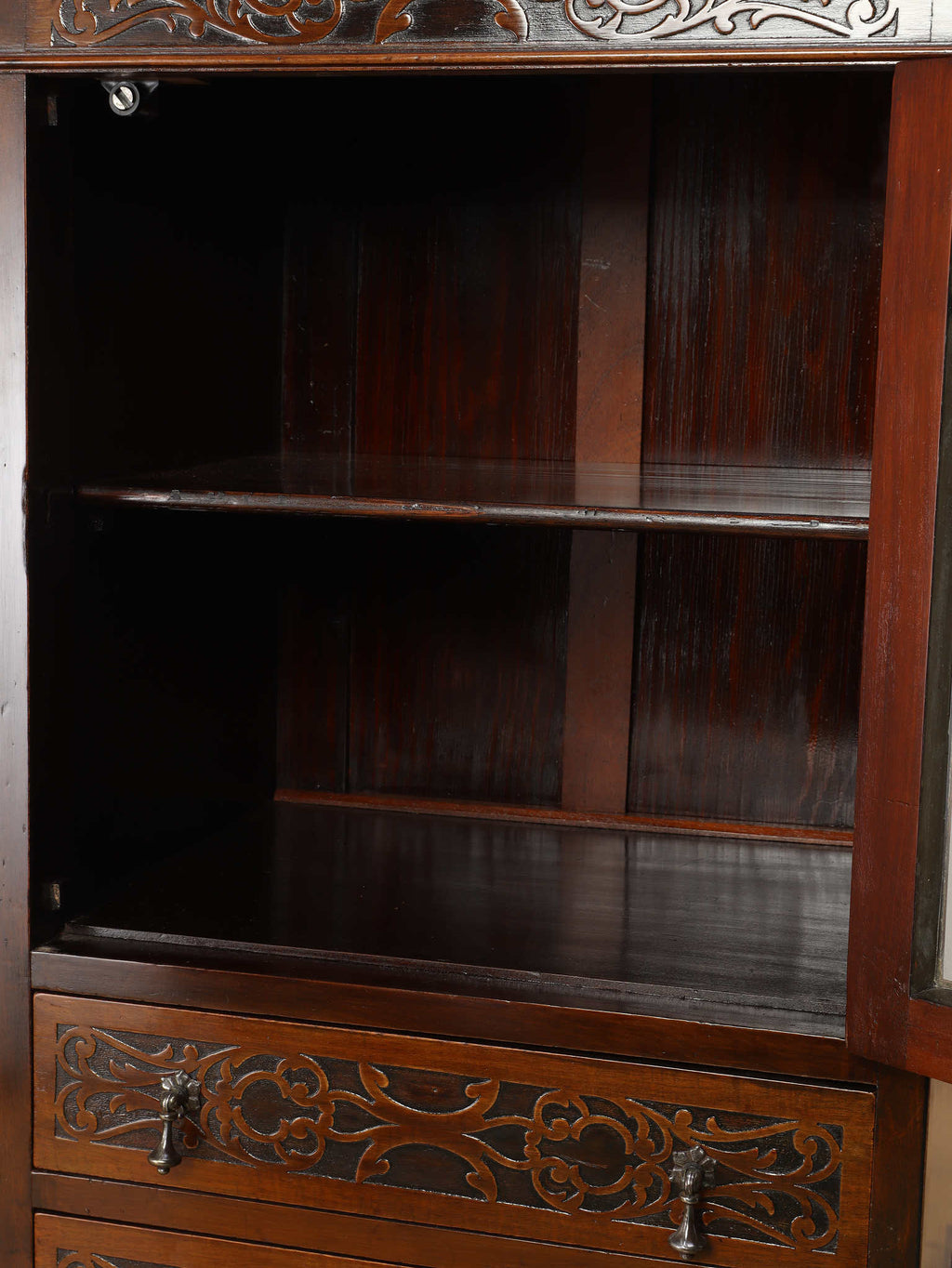 1890年代(推定)に製造されたヴィクトリアンディスプレイブックケースです。エレガントな曲線を描く猫脚と、細部まで施された美しい象嵌細工が目を引く、ヴィクトリアンスタイルのブックケースです。素材には、艶やかな表情と深みのある色合いが特徴のマホガニー材が使用されており、優雅な雰囲気を醸し出しています。上部には、装飾的な鏡が備えられたトップ。ガラス扉の内部は、お気に入りの洋書や美術品、コレクションを飾るのに最適です。また、下部には引き出しが2杯あり、小物の収納にも便利です。高さがありながら、横幅と奥行きを抑えたスリムな設計で、空間に圧迫感を与えません。玄関先やリビングの一角など、限られたスペースにも取り入れやすいサイズ感です。英国貴族の邸宅のような、華やかで格調高い空間を演出してくれるでしょう。