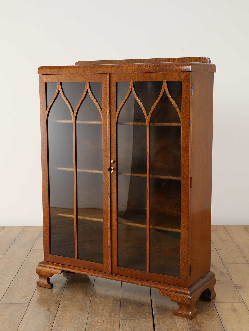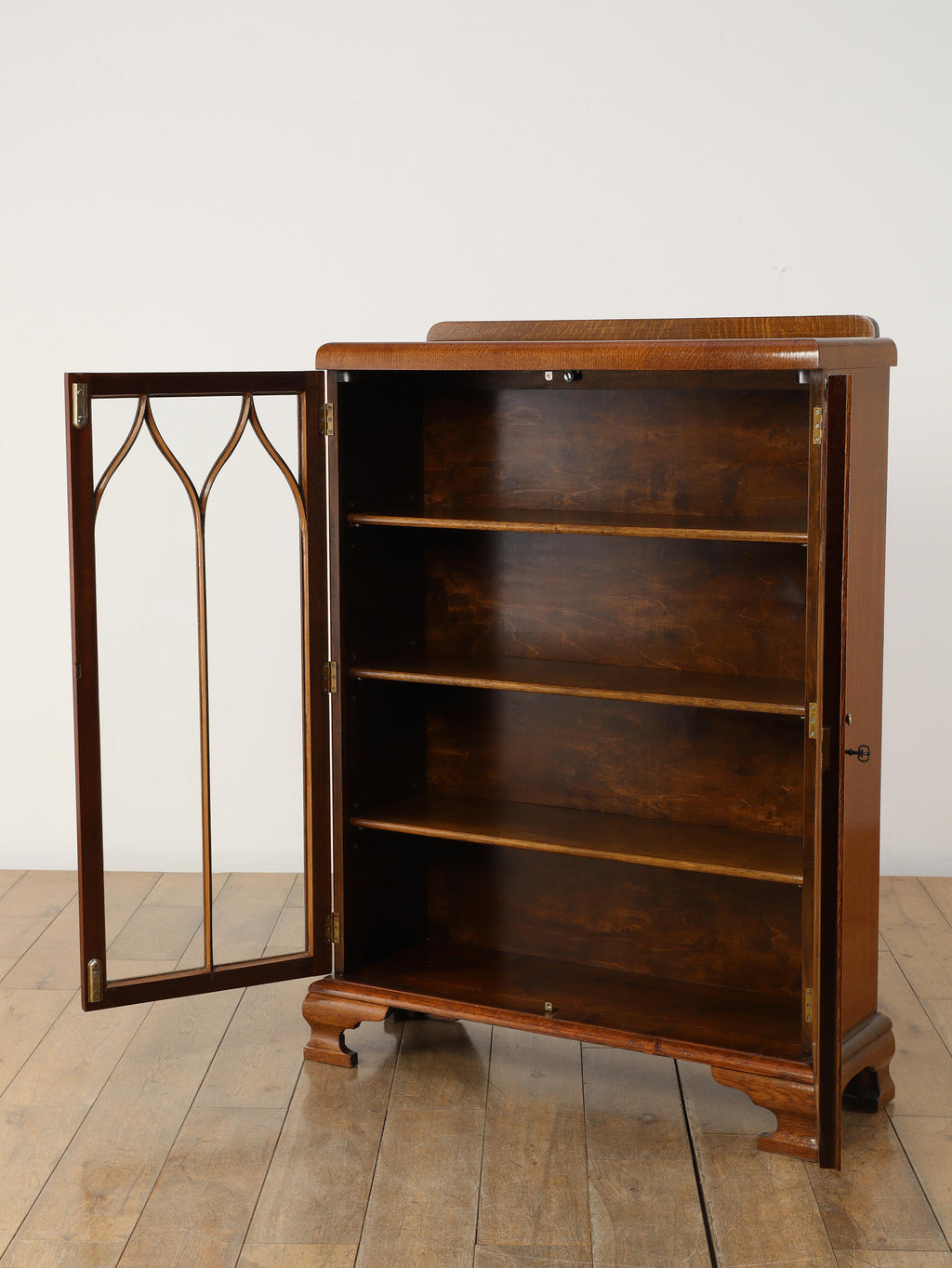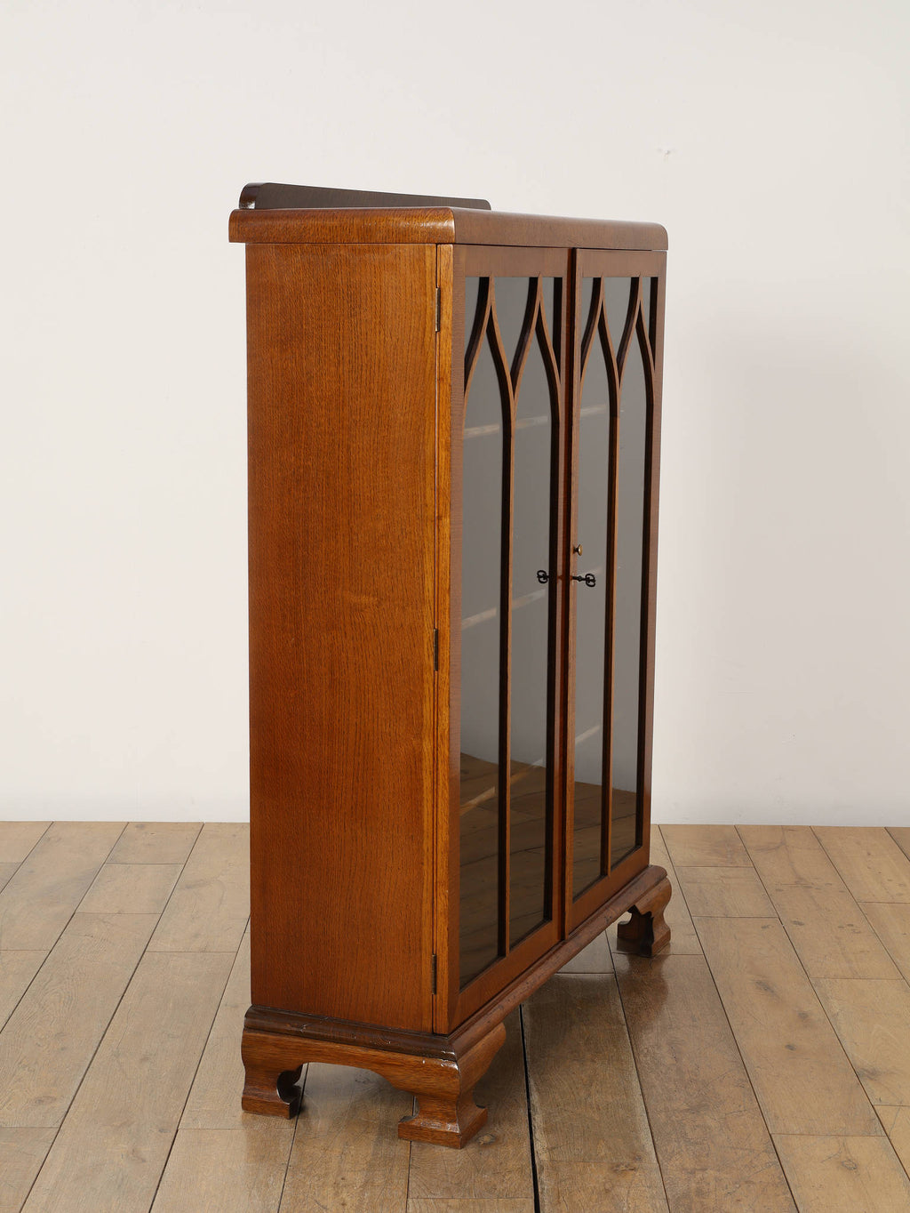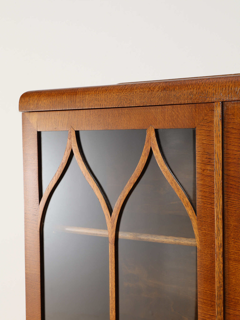 力強い木目が生きるオーク材に、アーチを描くガラスを組み合わせた端正な佇まいが魅力です。扉の縦ラインがすっきりとした印象を与えつつ、上部の曲線装飾が柔らかい表情を添え、クラシックな英国様式を穏やかに感じられるデザインに仕上がっています。内部の棚は本の収納はもちろん、器やオブジェのディスプレイにも適し、光を程よく透過しながら美しく見せてくれます。リビングや書斎に置くことで、空間に重厚さと温かみをもたらし、静かな品格を演出する一台です。