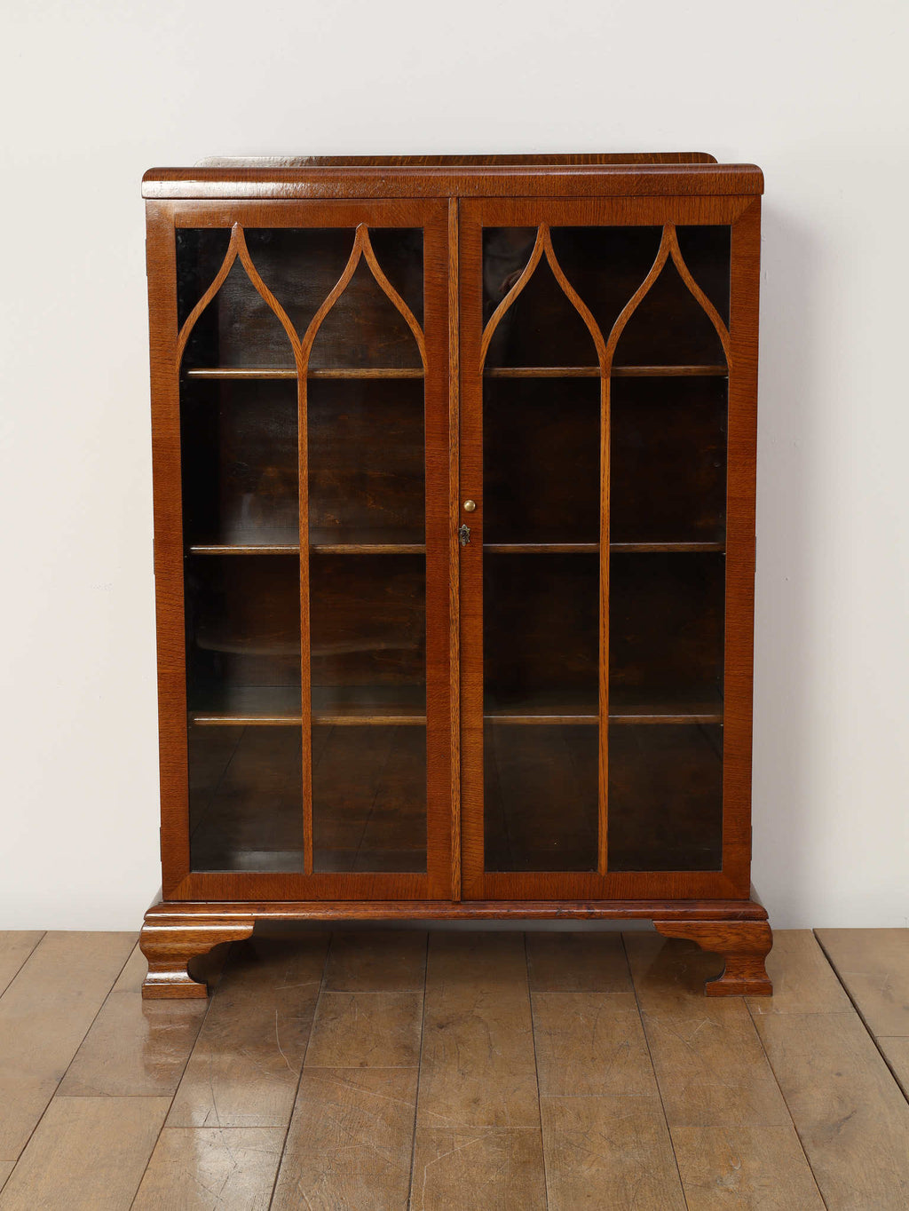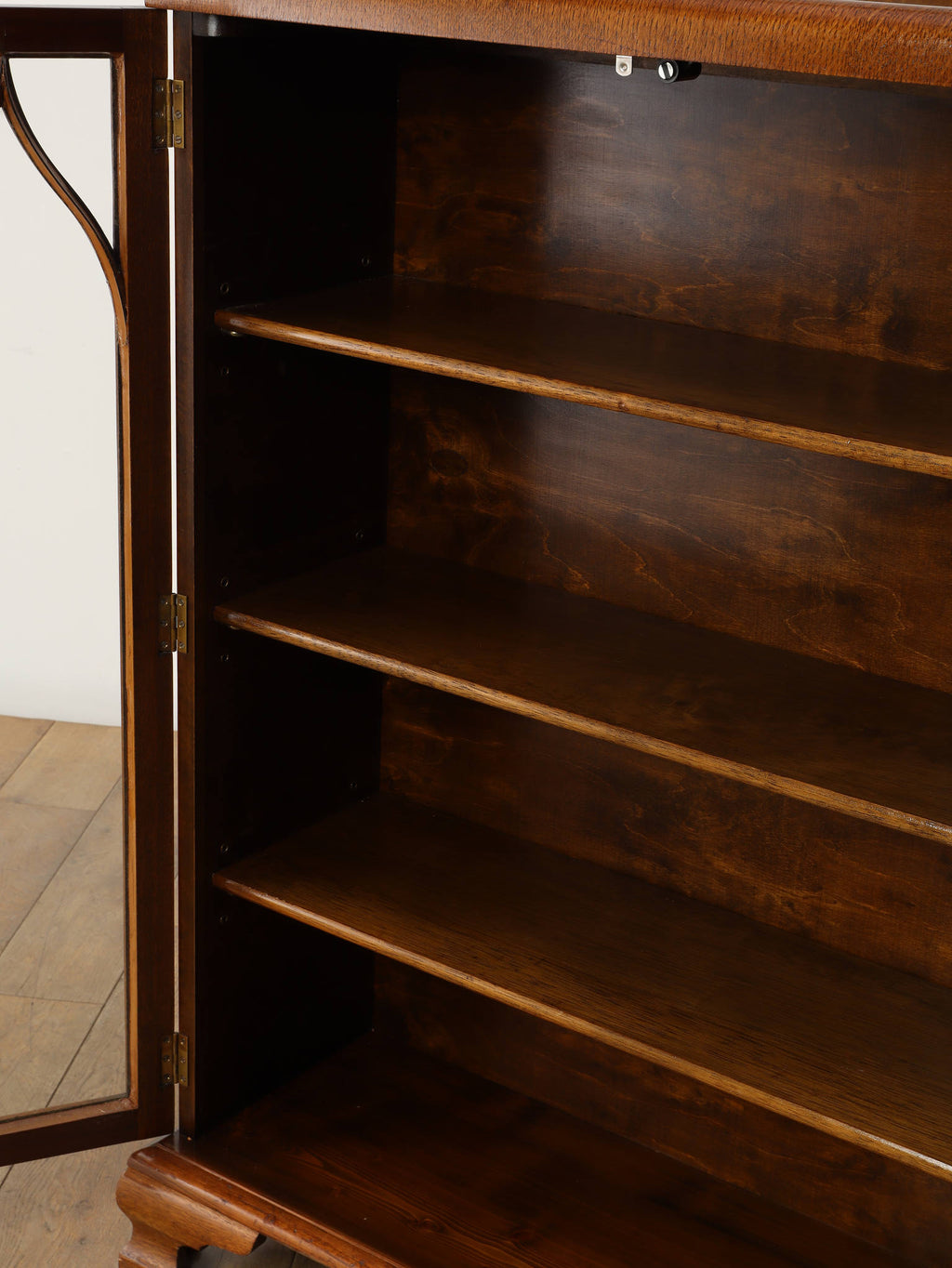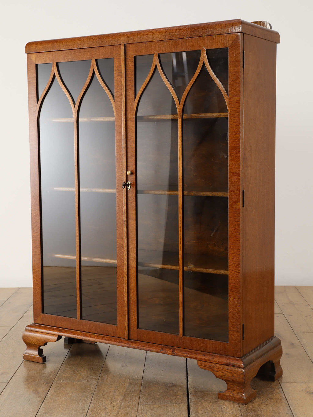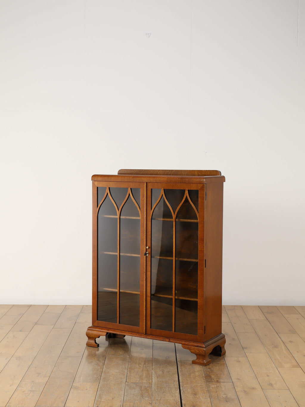 力強い木目が生きるオーク材に、アーチを描くガラスを組み合わせた端正な佇まいが魅力です。扉の縦ラインがすっきりとした印象を与えつつ、上部の曲線装飾が柔らかい表情を添え、クラシックな英国様式を穏やかに感じられるデザインに仕上がっています。内部の棚は本の収納はもちろん、器やオブジェのディスプレイにも適し、光を程よく透過しながら美しく見せてくれます。リビングや書斎に置くことで、空間に重厚さと温かみをもたらし、静かな品格を演出する一台です。