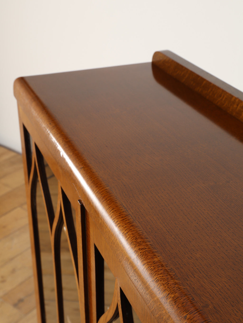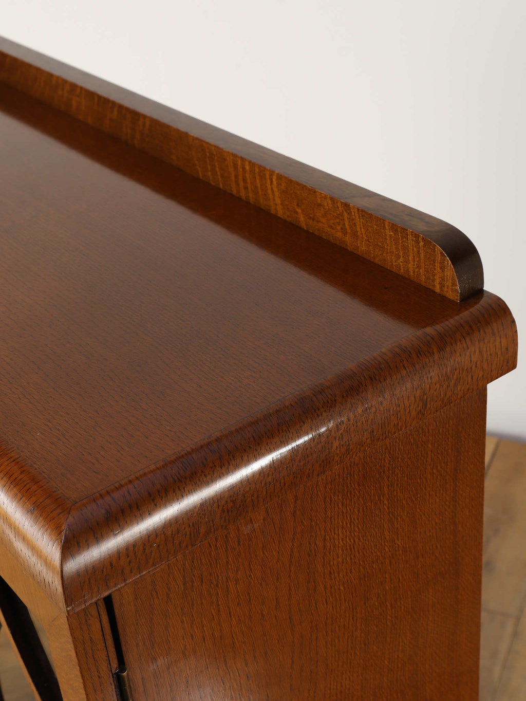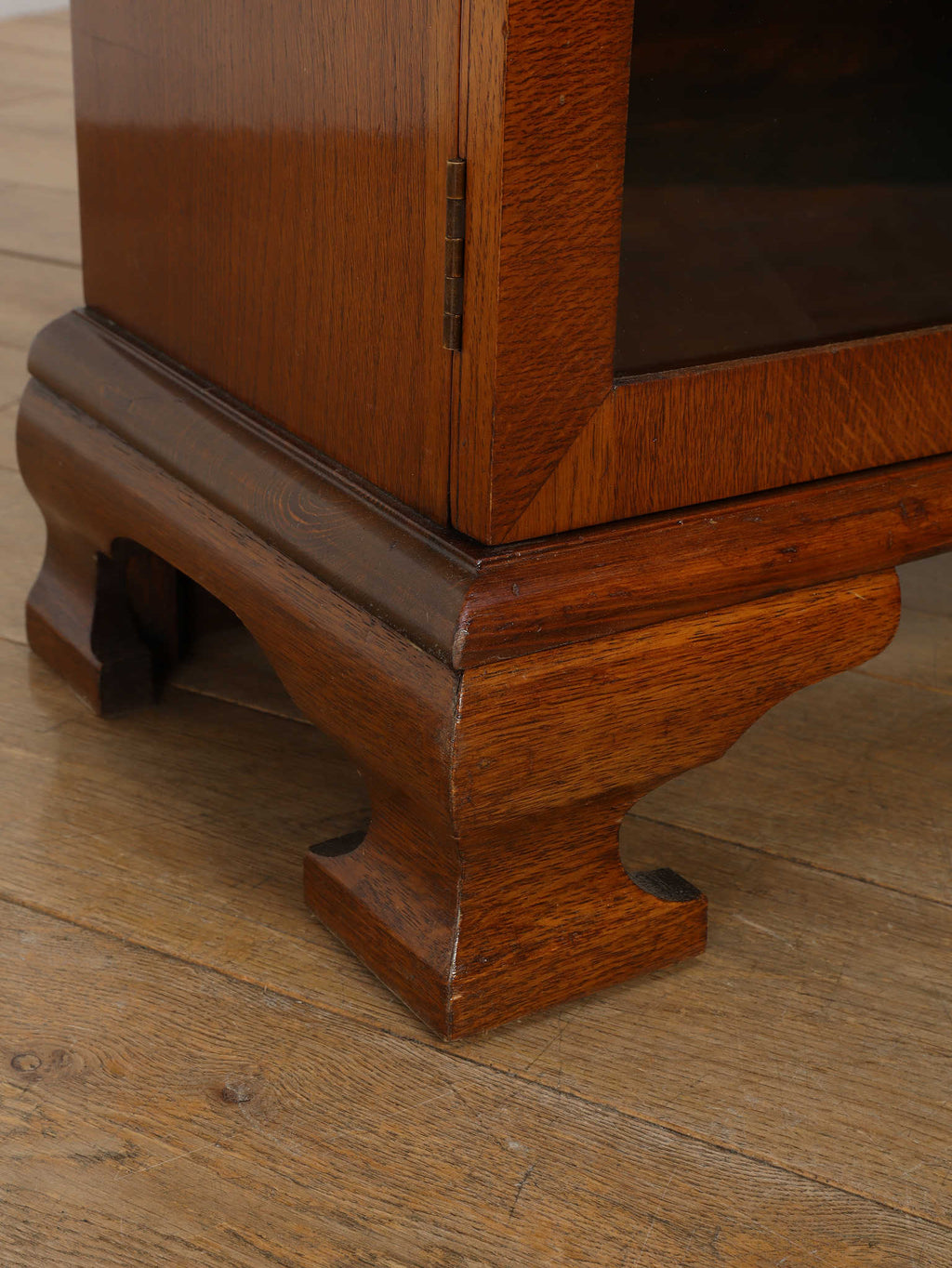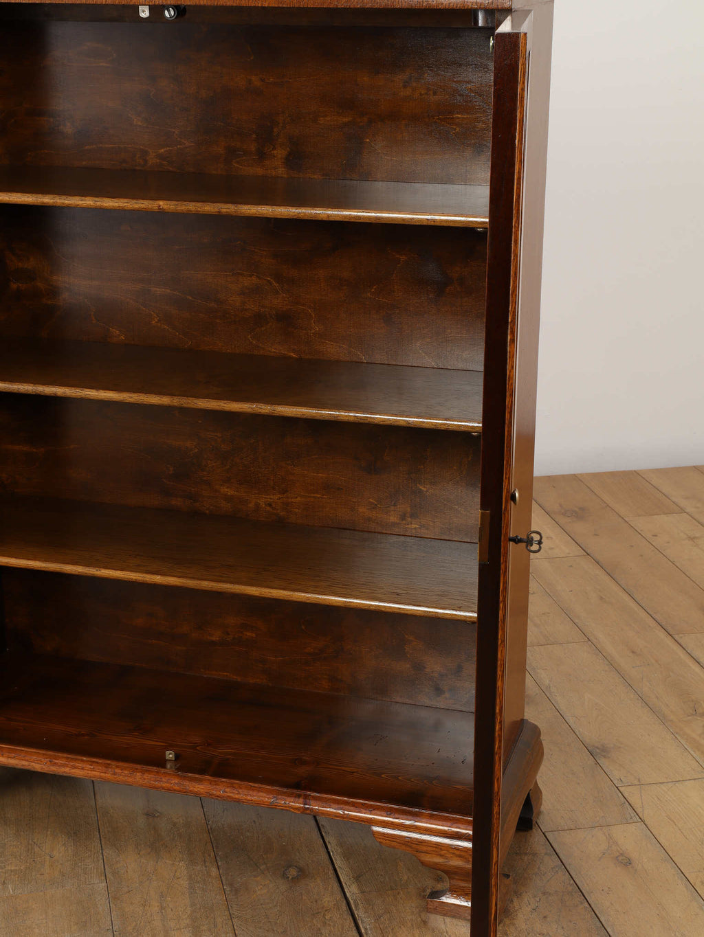 力強い木目が生きるオーク材に、アーチを描くガラスを組み合わせた端正な佇まいが魅力です。扉の縦ラインがすっきりとした印象を与えつつ、上部の曲線装飾が柔らかい表情を添え、クラシックな英国様式を穏やかに感じられるデザインに仕上がっています。内部の棚は本の収納はもちろん、器やオブジェのディスプレイにも適し、光を程よく透過しながら美しく見せてくれます。リビングや書斎に置くことで、空間に重厚さと温かみをもたらし、静かな品格を演出する一台です。
