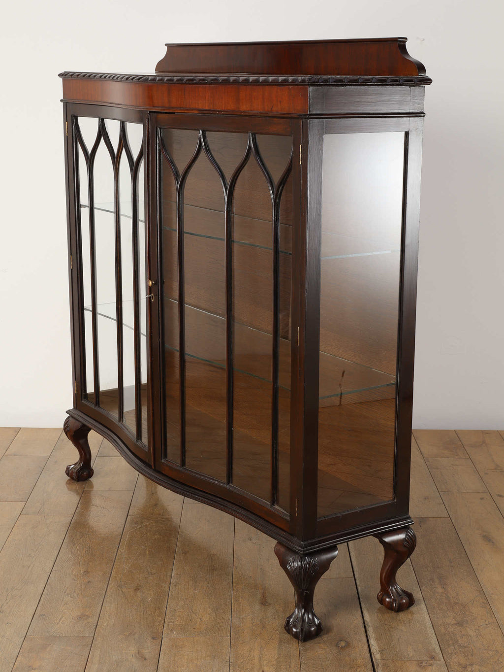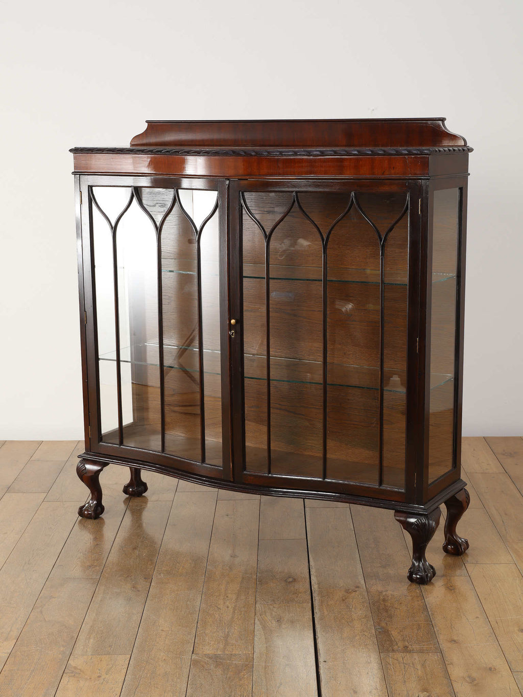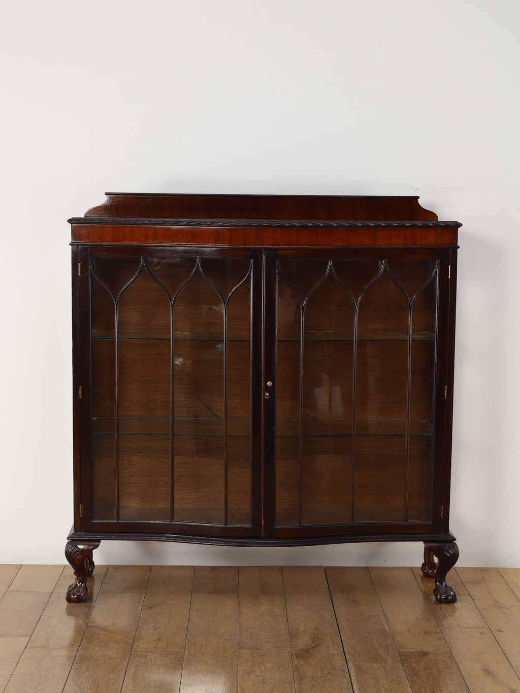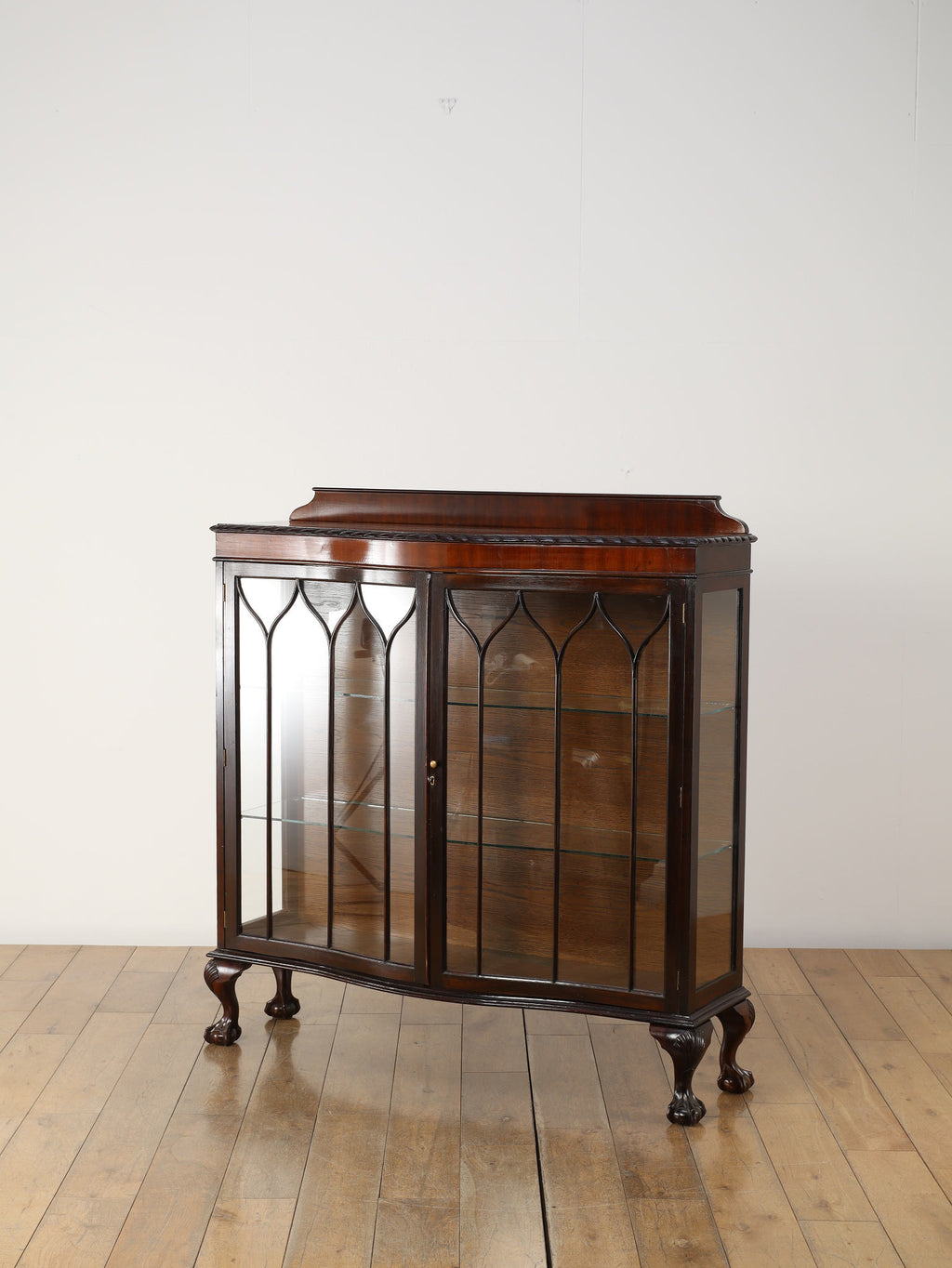 深みのある赤褐色に艶めくマホガニー材が、重厚かつエレガントな雰囲気を醸し出す、ディスプレイキャビネット。前面のガラス扉には、教会の窓のようなゴシック様式を思わせる、特徴的なデザインの格子が施されており、中のコレクションを神秘的に引き立ててくれます。脚元の装飾は、ボウル・アンド・クロウ(爪と玉)と呼ばれる伝統的なデザインが採用されています。これは、玉(ボウル)を鷲や獅子の爪(クロウ)が掴んでいる様子を表し、装飾的な美しさだけでなく、幸運や財産を掴む縁起の良いモチーフとして当時から大変人気がありました。この歴史的な背景を持つ脚元が、このアンティークキャビネットの価値と魅力をさらに高めています。リビングに置けば、上質な空間を演出してくれるでしょう。
