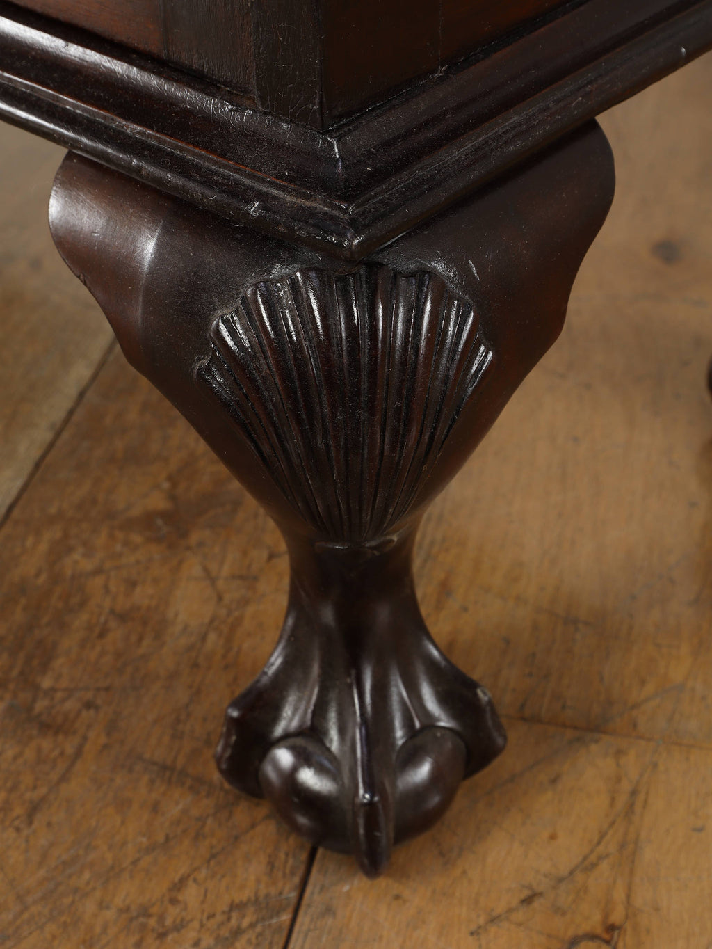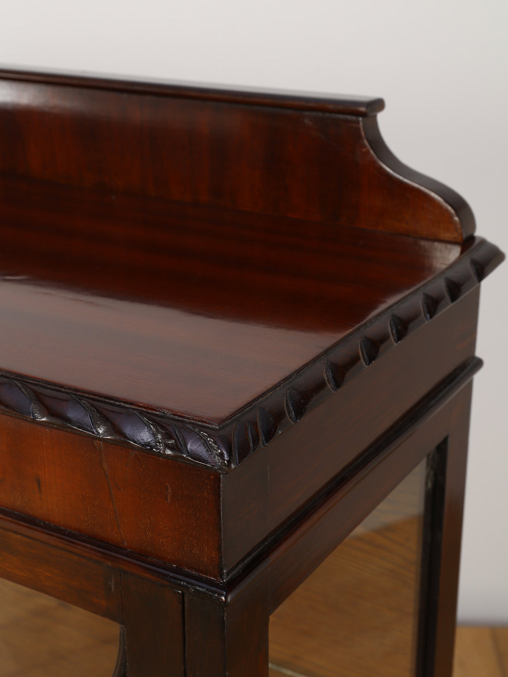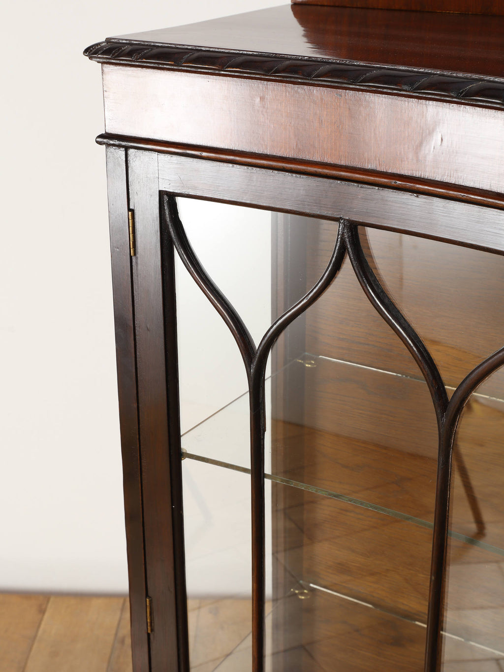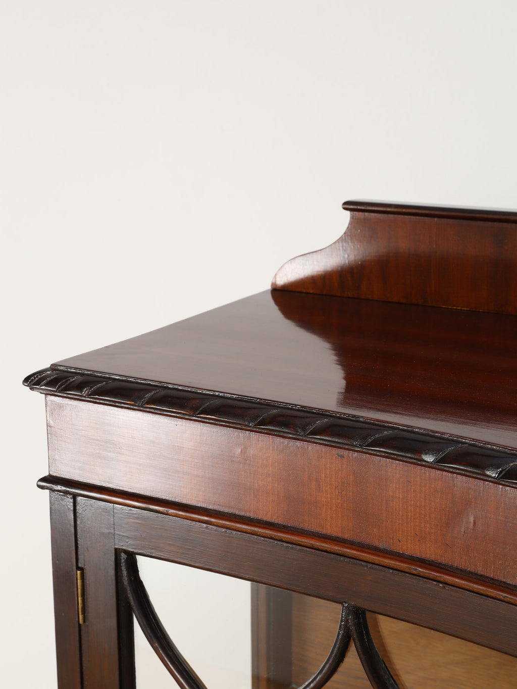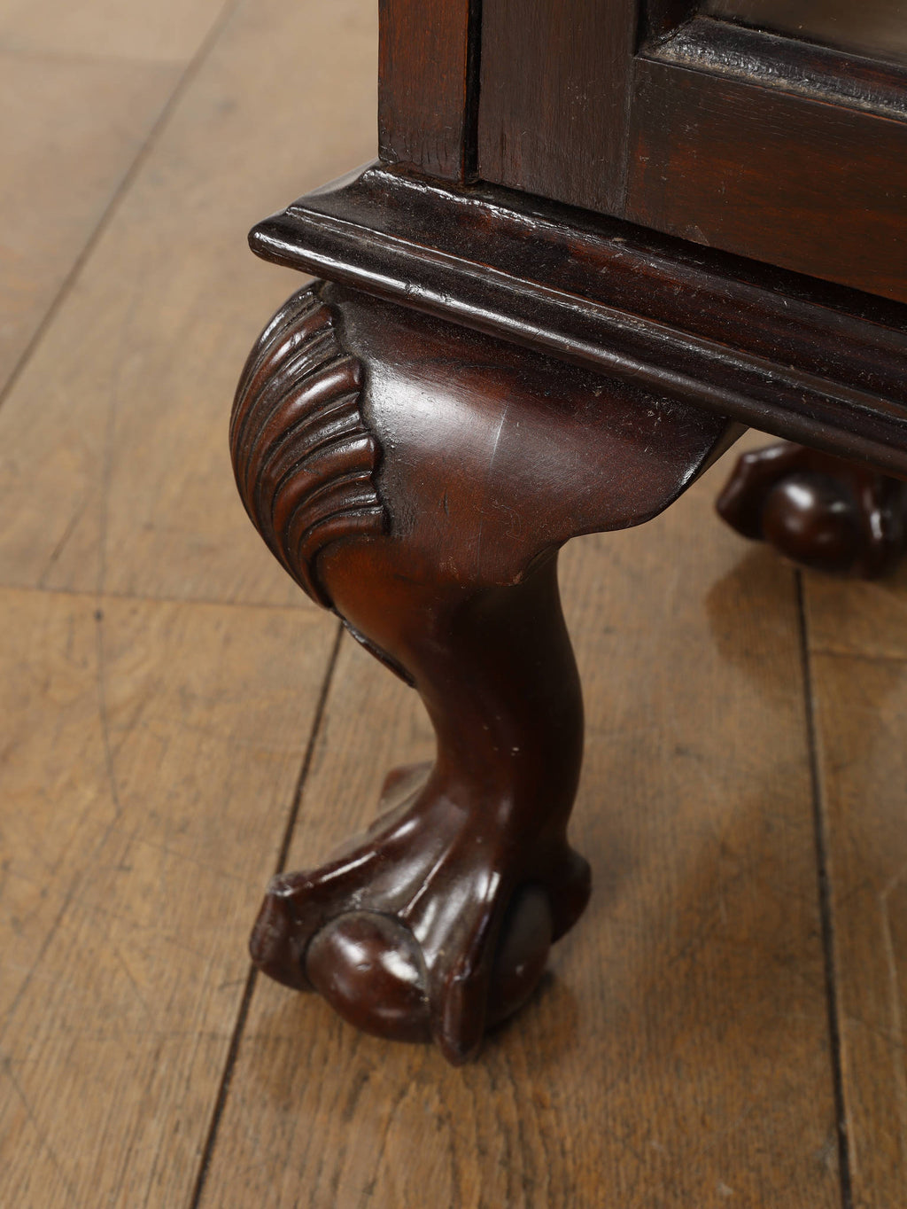 深みのある赤褐色に艶めくマホガニー材が、重厚かつエレガントな雰囲気を醸し出す、ディスプレイキャビネット。前面のガラス扉には、教会の窓のようなゴシック様式を思わせる、特徴的なデザインの格子が施されており、中のコレクションを神秘的に引き立ててくれます。脚元の装飾は、ボウル・アンド・クロウ(爪と玉)と呼ばれる伝統的なデザインが採用されています。これは、玉(ボウル)を鷲や獅子の爪(クロウ)が掴んでいる様子を表し、装飾的な美しさだけでなく、幸運や財産を掴む縁起の良いモチーフとして当時から大変人気がありました。この歴史的な背景を持つ脚元が、このアンティークキャビネットの価値と魅力をさらに高めています。リビングに置けば、上質な空間を演出してくれるでしょう。