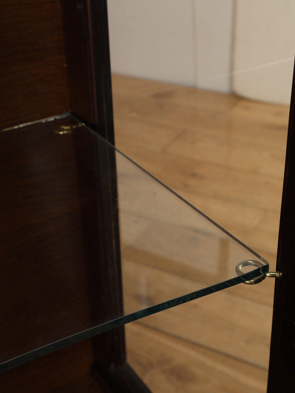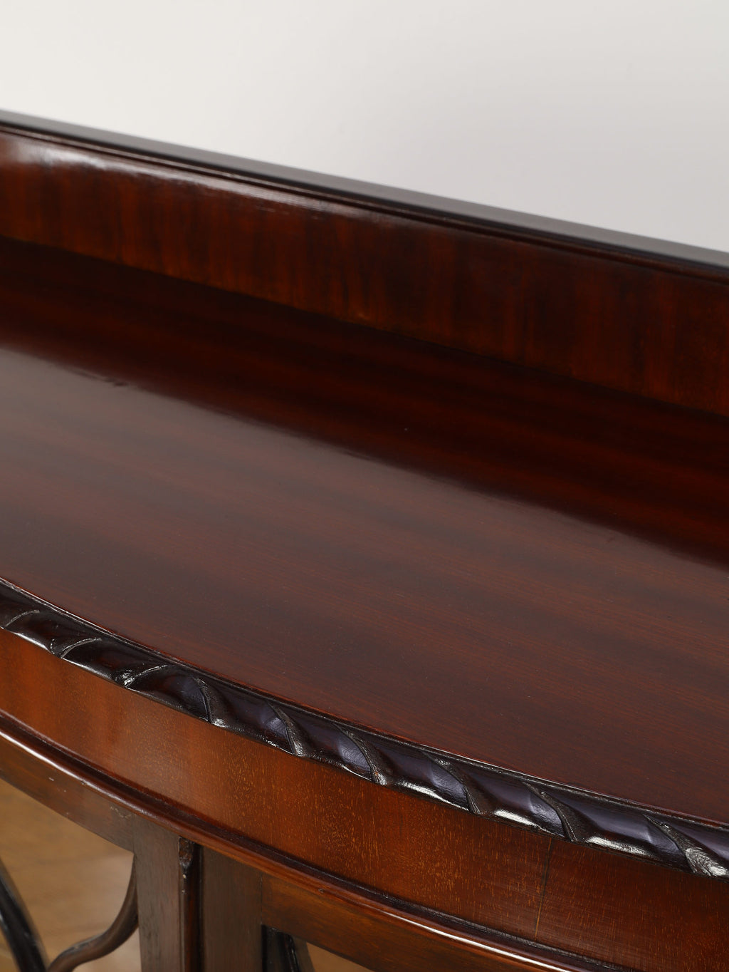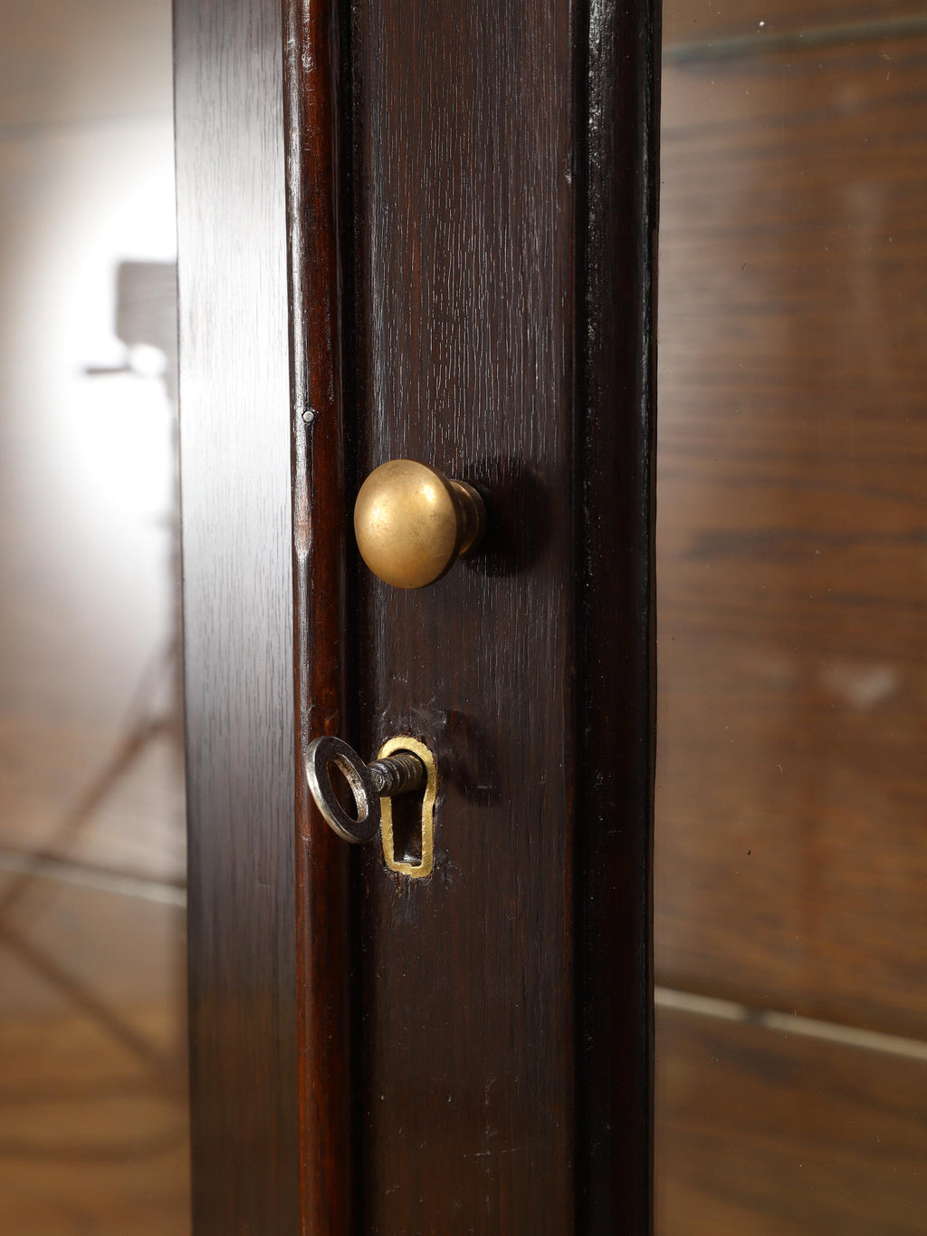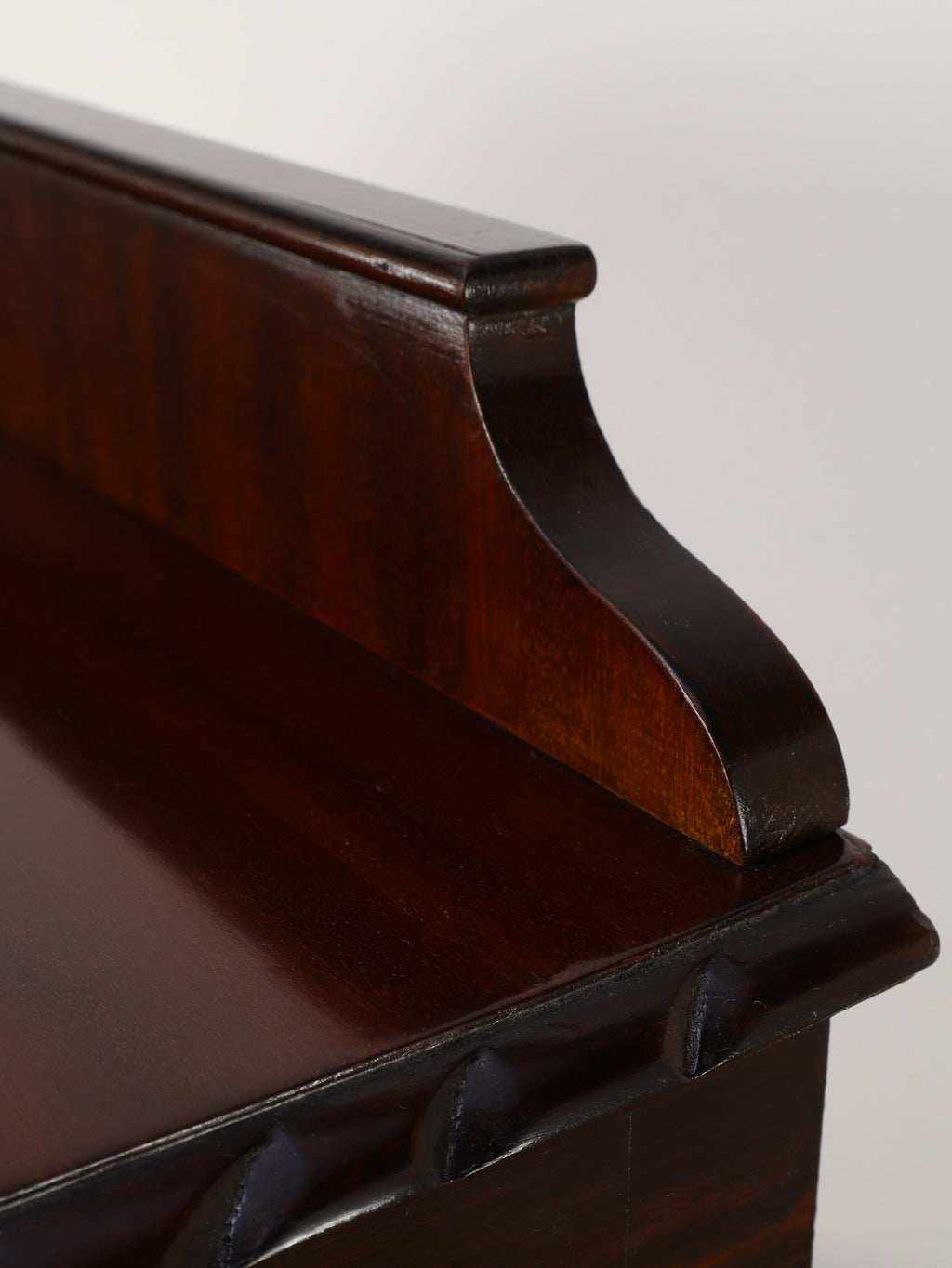 深みのある赤褐色に艶めくマホガニー材が、重厚かつエレガントな雰囲気を醸し出す、ディスプレイキャビネット。前面のガラス扉には、教会の窓のようなゴシック様式を思わせる、特徴的なデザインの格子が施されており、中のコレクションを神秘的に引き立ててくれます。脚元の装飾は、ボウル・アンド・クロウ(爪と玉)と呼ばれる伝統的なデザインが採用されています。これは、玉(ボウル)を鷲や獅子の爪(クロウ)が掴んでいる様子を表し、装飾的な美しさだけでなく、幸運や財産を掴む縁起の良いモチーフとして当時から大変人気がありました。この歴史的な背景を持つ脚元が、このアンティークキャビネットの価値と魅力をさらに高めています。リビングに置けば、上質な空間を演出してくれるでしょう。