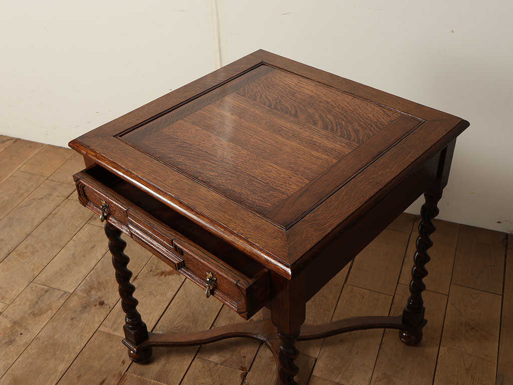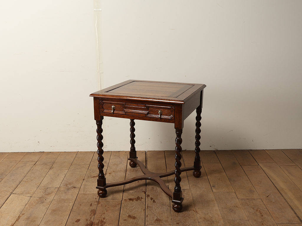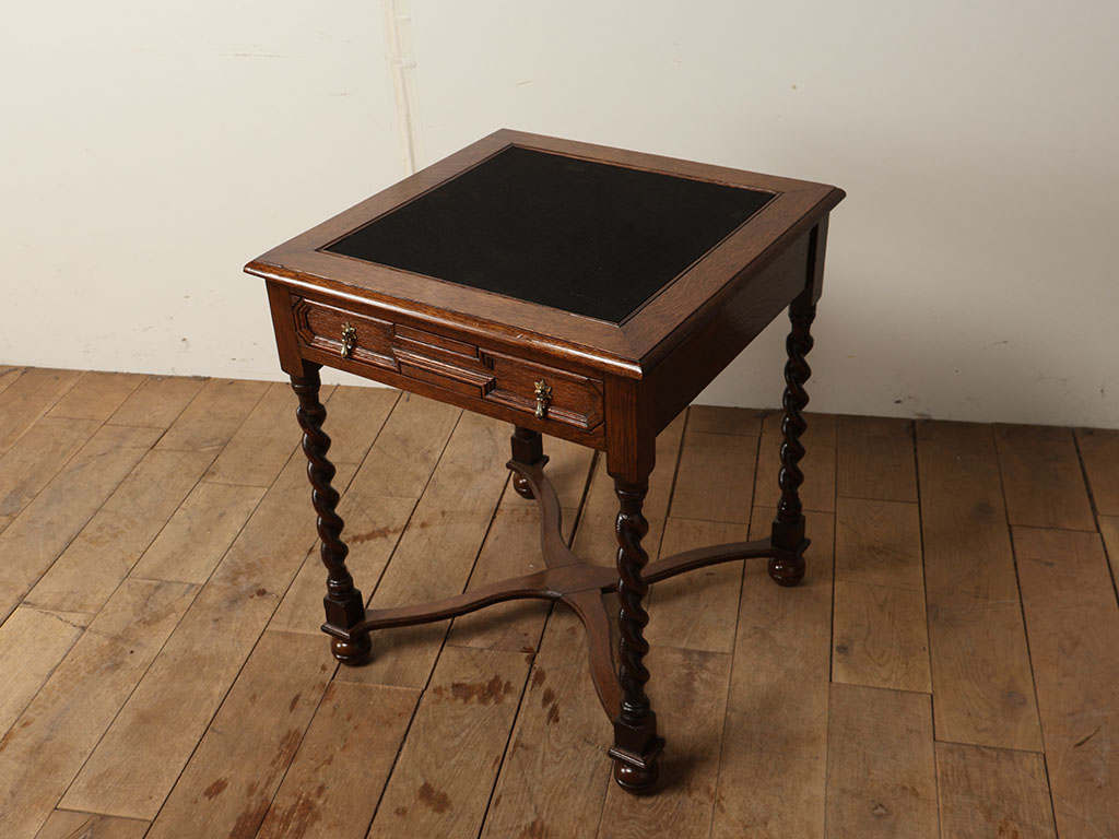 1920年代イギリス製のゲームテーブルです。100年という時が育んだオークの深く表情豊かな杢目には、本物のアンティークならではの風格が宿っています。最大の特徴は、天板を裏返すことで現れるフェルト面。チェスやカードを楽しむ当時の紳士たちの「遊び心」が、現代の私たちの暮らしに優雅なアクセントを添えてくれます。脚元には繊細なカッティングが施されたツイストレッグが配され、重厚感の中にエレガントな軽やかさを演出しています。W610mmのコンパクトなサイズ感は、ティーテーブルや書斎のサイドテーブルとしても最適な一品です。
