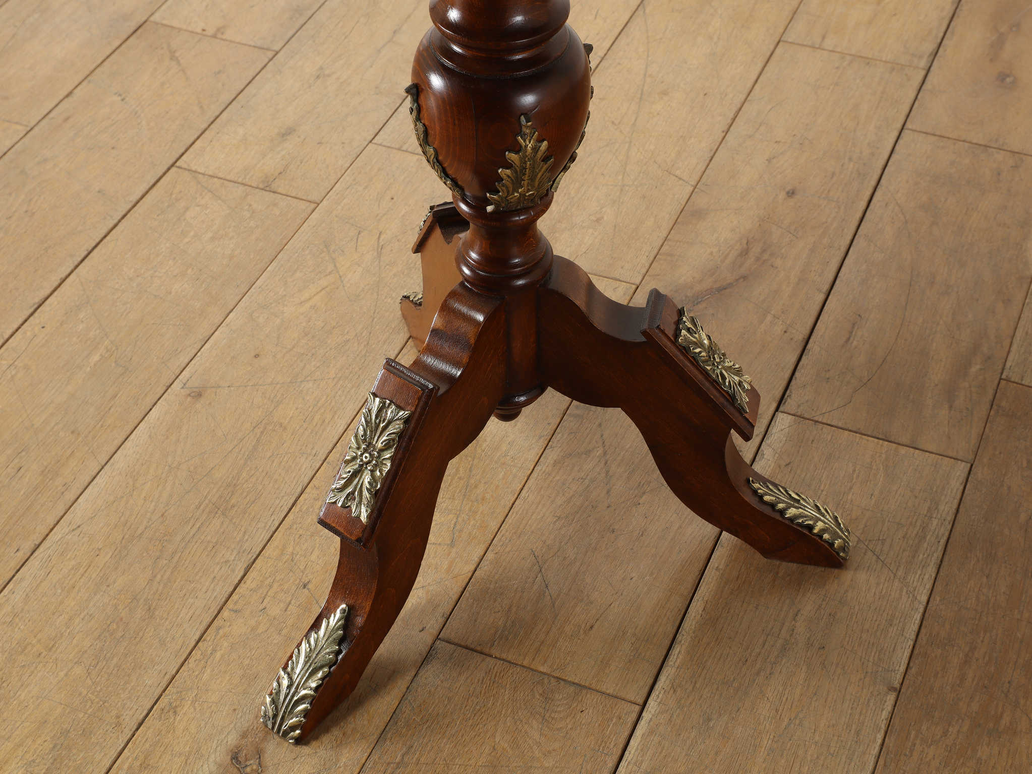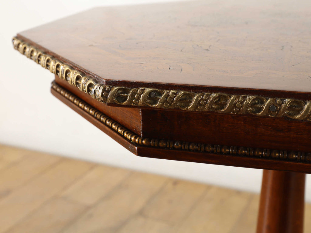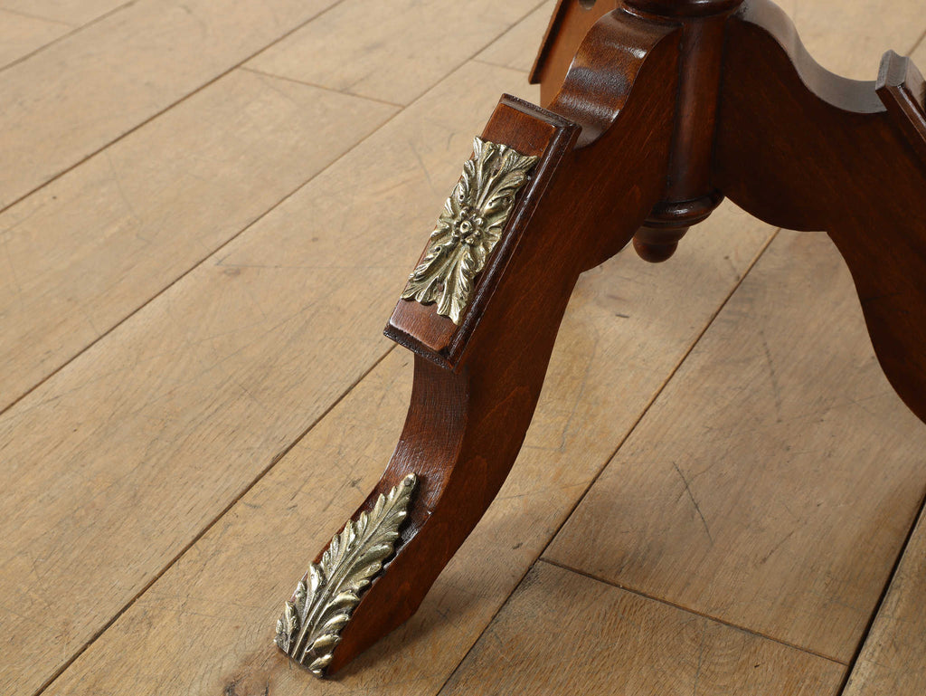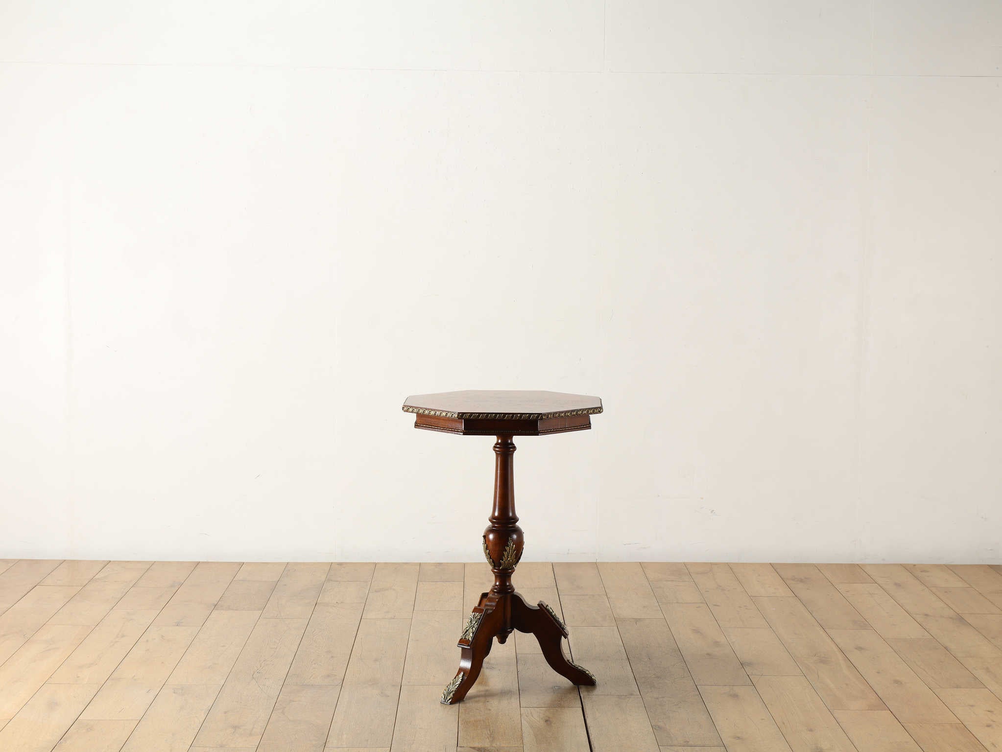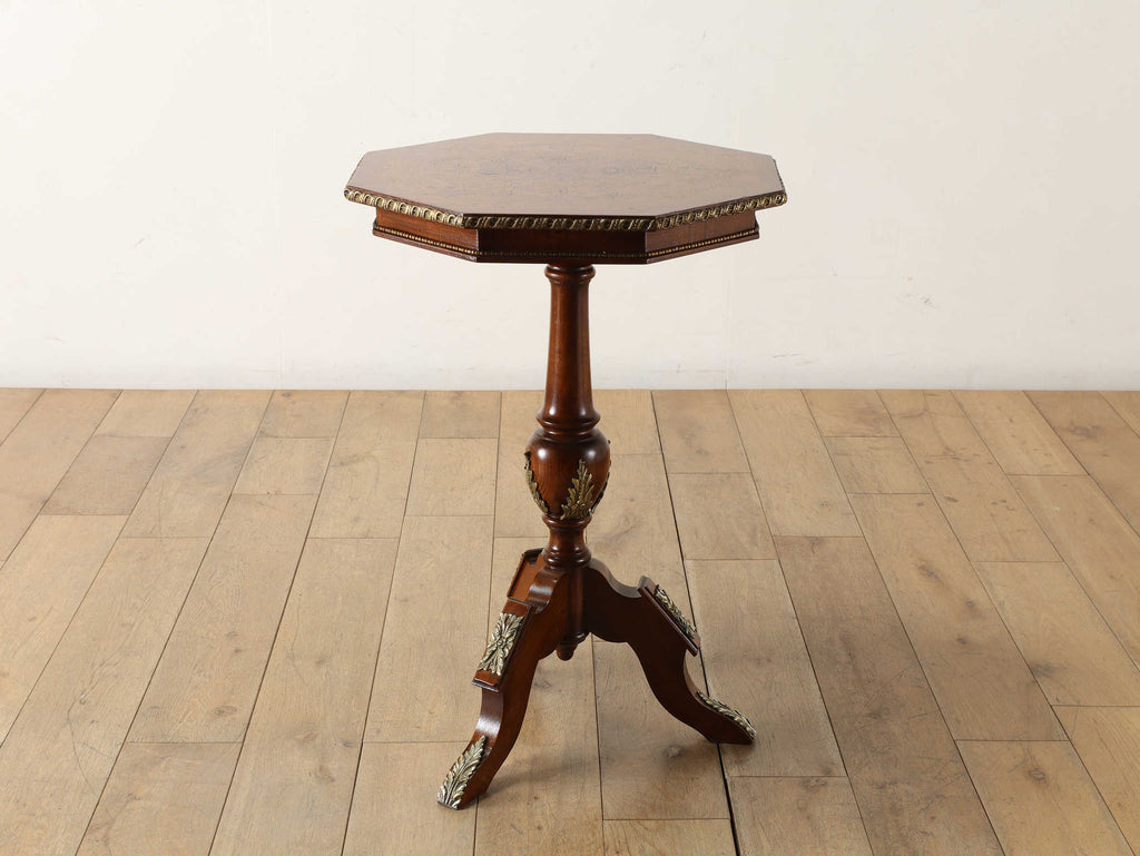 フランスのアンティークらしい気品溢れる、センターテーブル。八角形の天板に施された見事な象嵌(インレイ)細工が、このアイテムの最大の魅力。繊細な花や唐草模様が緻密に表現されており、職人の卓越した技術と手間を感じさせます。天板の縁や脚の装飾としてあしらわれたブラス(真鍮)金具が、ウォールナットの深い色合いと相まって、エレガントで格調高い雰囲気を醸し出しています。中央に配置するだけで空間の主役となるデザインで、ティータイムや花台としてもお使いいただけます。