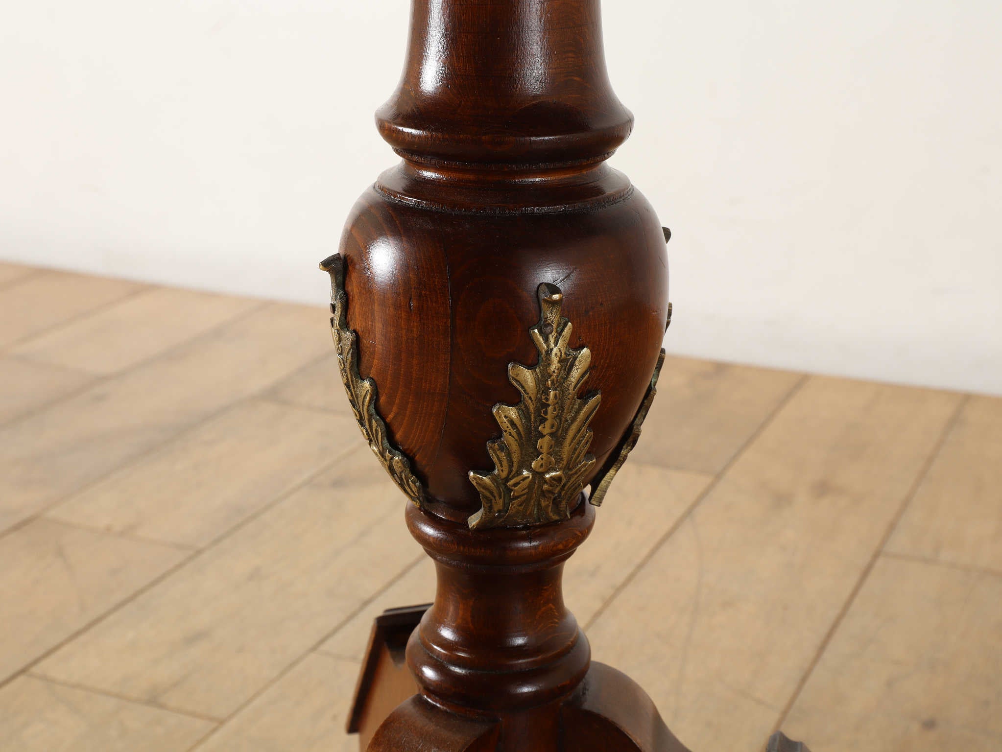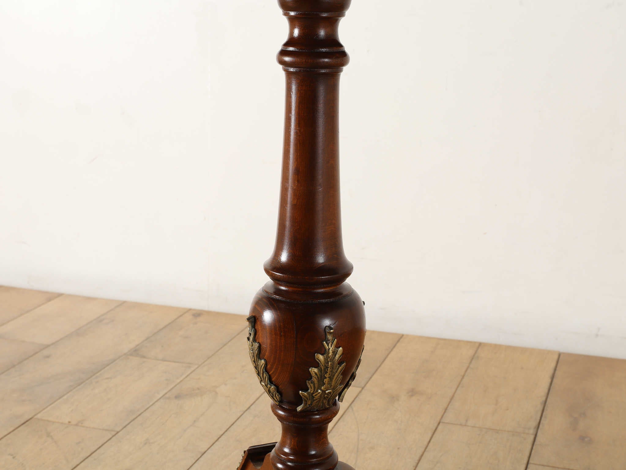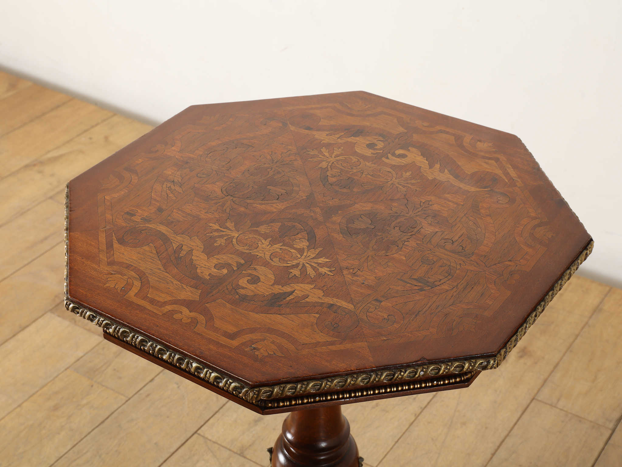 フランスのアンティークらしい気品溢れる、センターテーブル。八角形の天板に施された見事な象嵌(インレイ)細工が、このアイテムの最大の魅力。繊細な花や唐草模様が緻密に表現されており、職人の卓越した技術と手間を感じさせます。天板の縁や脚の装飾としてあしらわれたブラス(真鍮)金具が、ウォールナットの深い色合いと相まって、エレガントで格調高い雰囲気を醸し出しています。中央に配置するだけで空間の主役となるデザインで、ティータイムや花台としてもお使いいただけます。