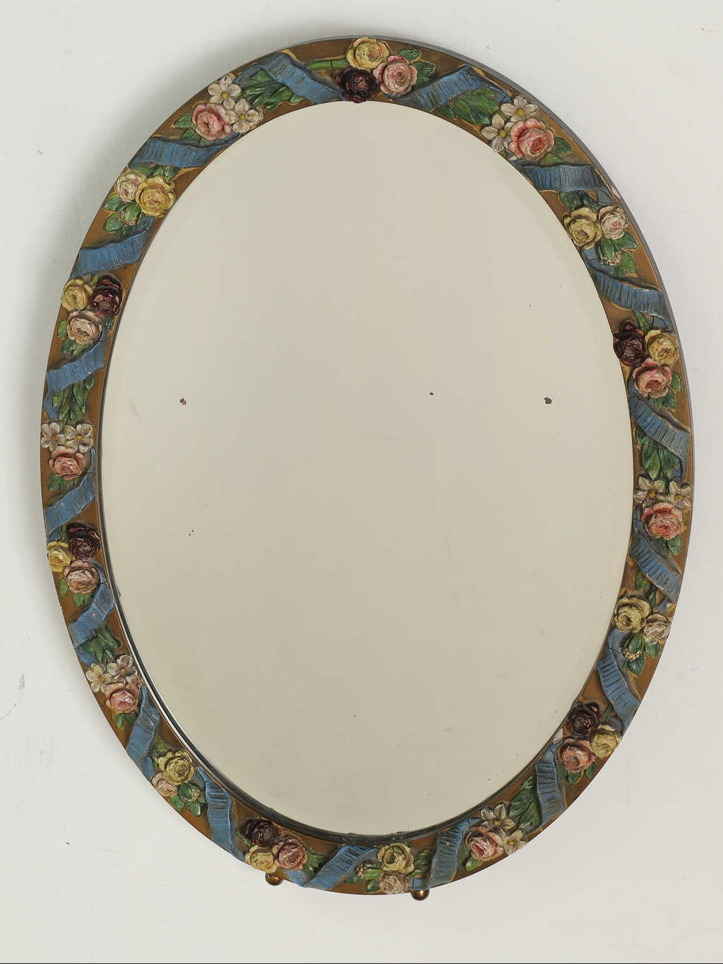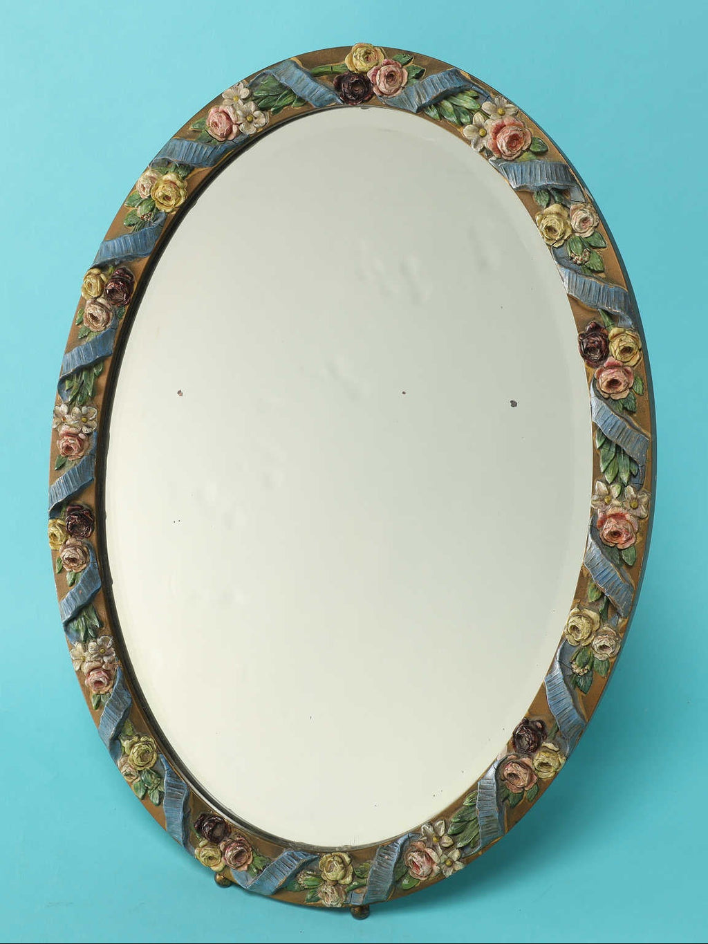 こちらは、優雅で愛らしい装飾が特徴のオーバル型ミラー。フレーム全体に、柔らかなパステルカラーのバラのモチーフと、それを結ぶように流れる水色のリボンの立体的な装飾が施されています。このロマンチックで繊細な意匠は、当時の流行であった優雅なエドワーディアン・スタイルを色濃く反映しており、空間に華やかで優しい雰囲気をもたらします。縦長のオーバル(楕円形)は、卓上に置いてドレッサーミラーとしてもお使いいただけます。この鏡が持つ甘美で可憐な魅力は、寝室やパウダールームを一層明るく、上品に彩ってくれるでしょう。