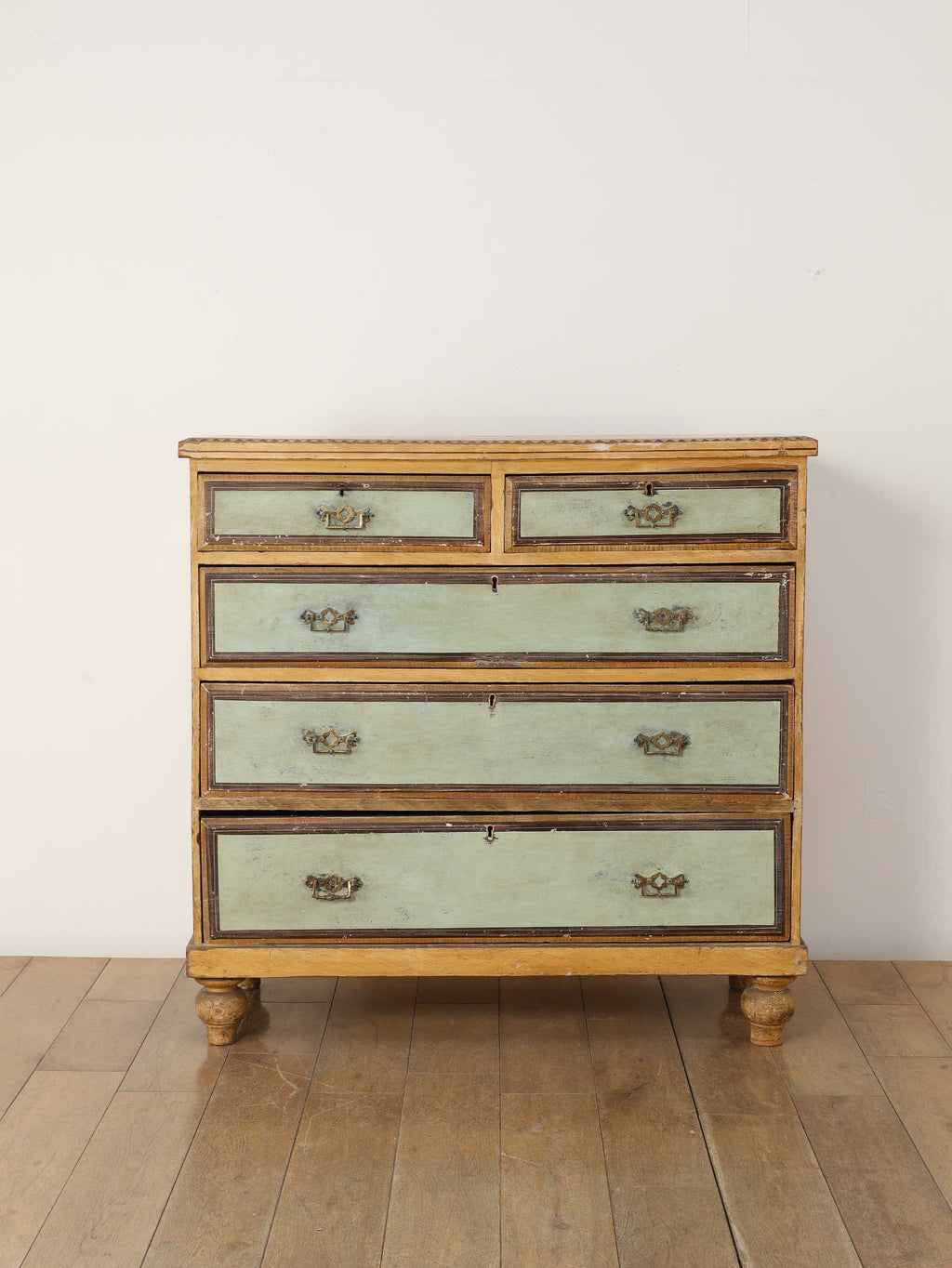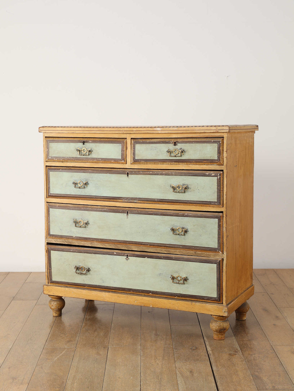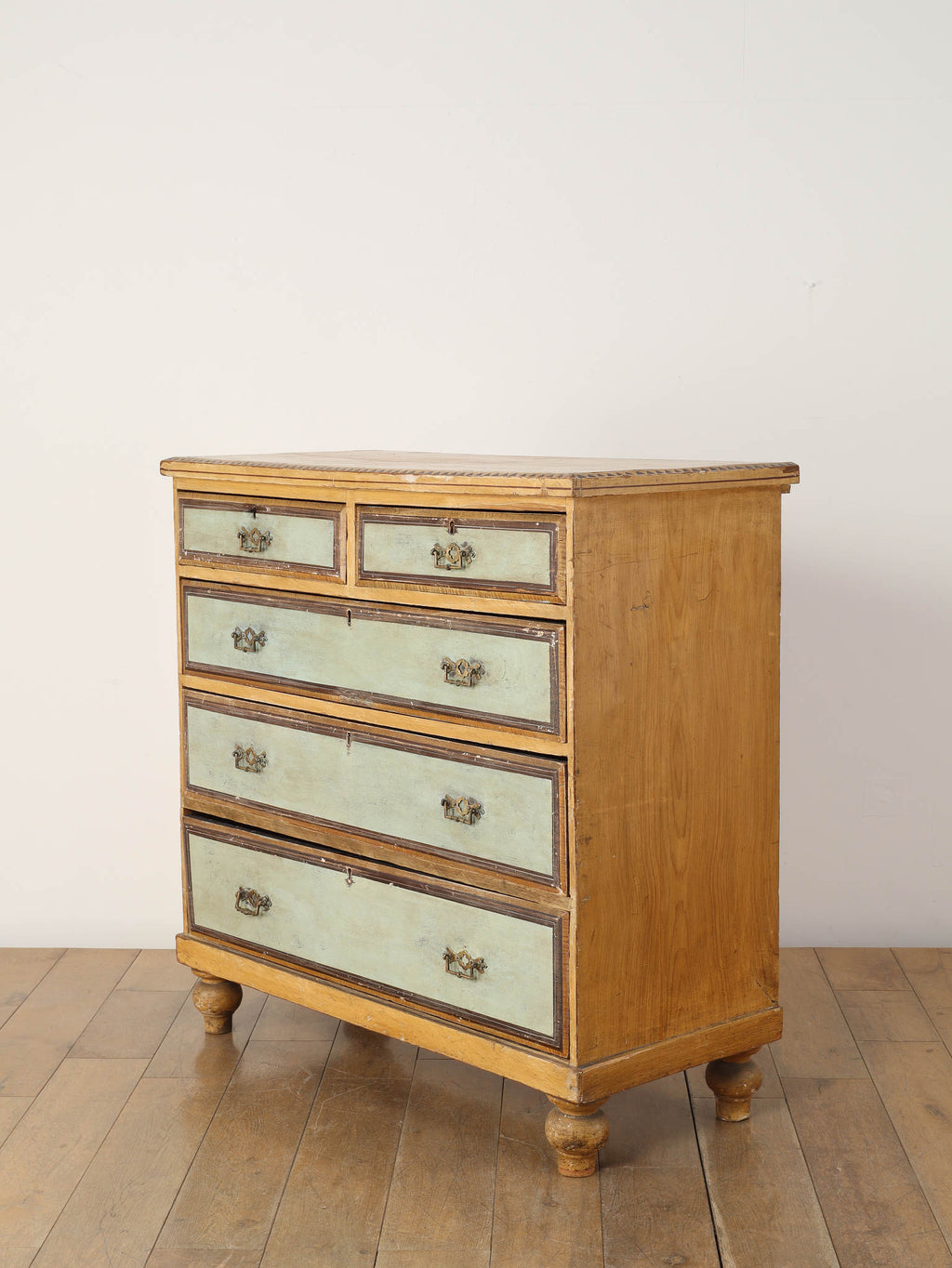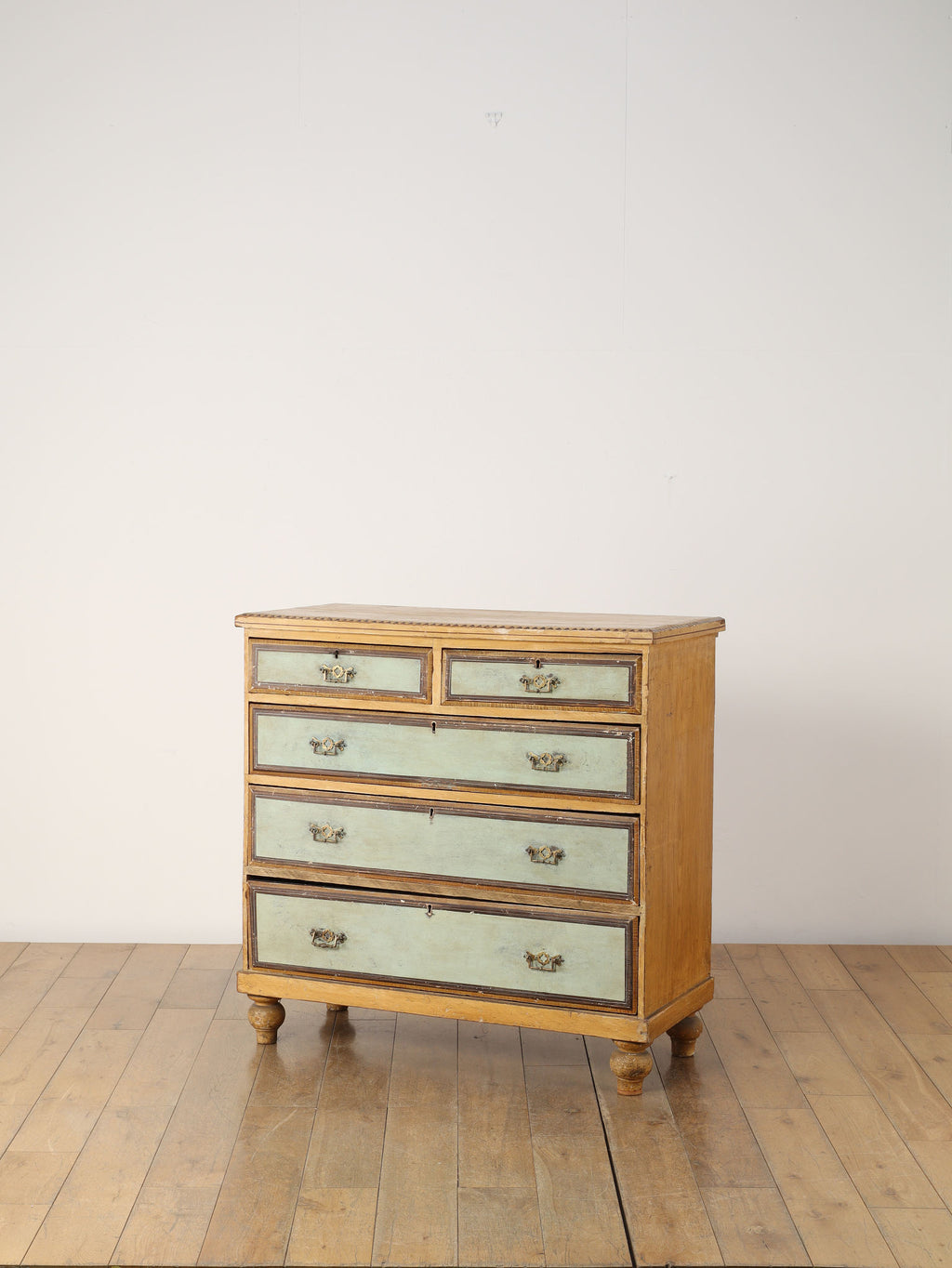 推定1910年代、英国製のチェストです。素朴で温かみのある木肌に対し、引き出し前面に施された淡い色のペイントが、上品で柔らかなコントラストを生み出しています。天板の縁には幾何学的な装飾があしらわれ、控えめながらも作り手のこだわりを感じさせます。時を経て味わいを増したペイントの風合いと、ブラス製のクラシカルな取っ手金具が、アンティークならではのシャビーシックな魅力を放っています。足元はコロンとした丸いバンフットで支えられ、愛らしい表情を加えています。収納力のある大小の引き出しは実用性が高く、寝室での衣類収納はもちろん、リビングのアクセント家具としても活躍します。空間に穏やかな彩りと、英国カントリーのような優しい空気を運んでくれる素敵な一台です。