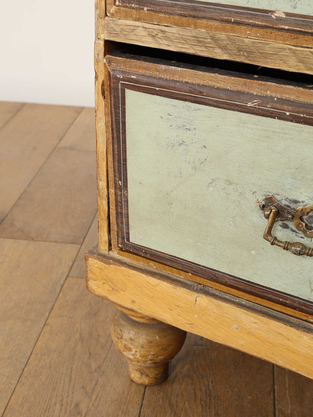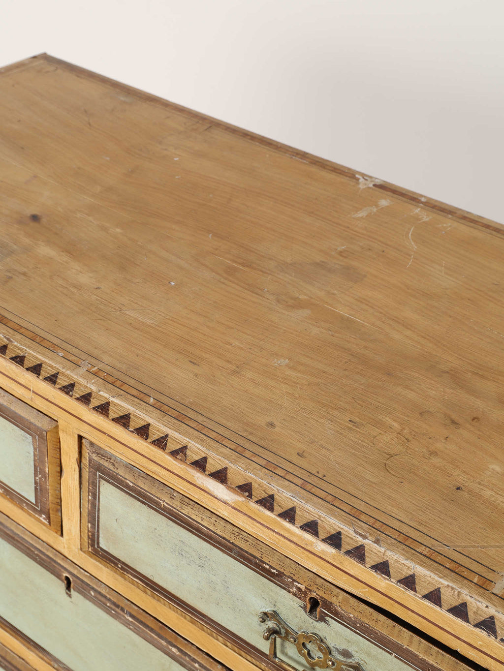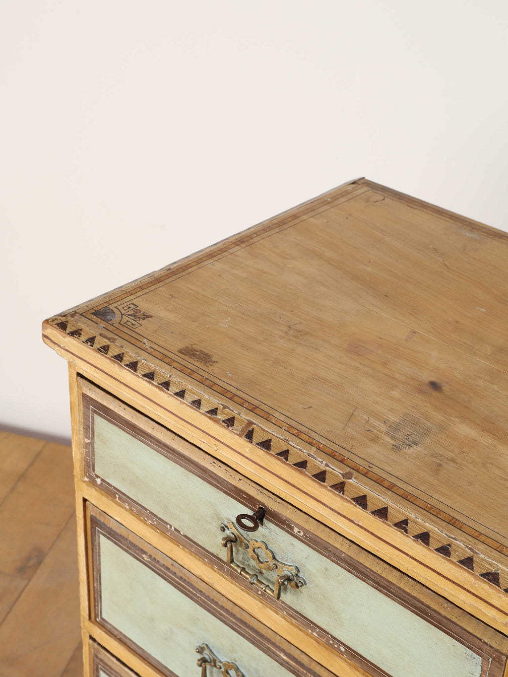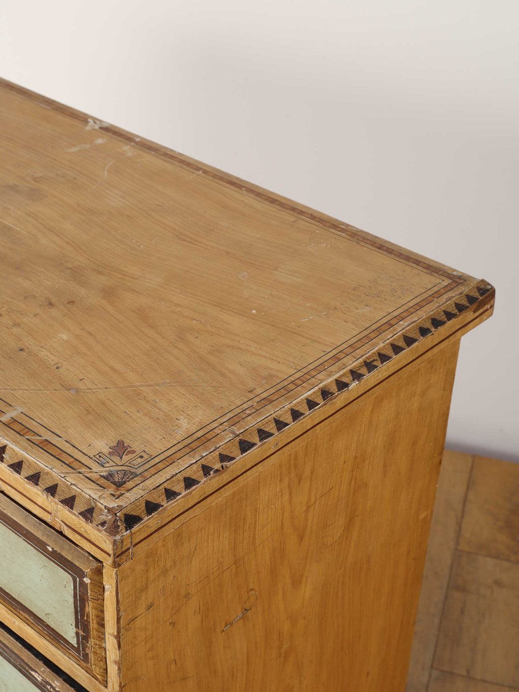 推定1910年代、英国製のチェストです。素朴で温かみのある木肌に対し、引き出し前面に施された淡い色のペイントが、上品で柔らかなコントラストを生み出しています。天板の縁には幾何学的な装飾があしらわれ、控えめながらも作り手のこだわりを感じさせます。時を経て味わいを増したペイントの風合いと、ブラス製のクラシカルな取っ手金具が、アンティークならではのシャビーシックな魅力を放っています。足元はコロンとした丸いバンフットで支えられ、愛らしい表情を加えています。収納力のある大小の引き出しは実用性が高く、寝室での衣類収納はもちろん、リビングのアクセント家具としても活躍します。空間に穏やかな彩りと、英国カントリーのような優しい空気を運んでくれる素敵な一台です。