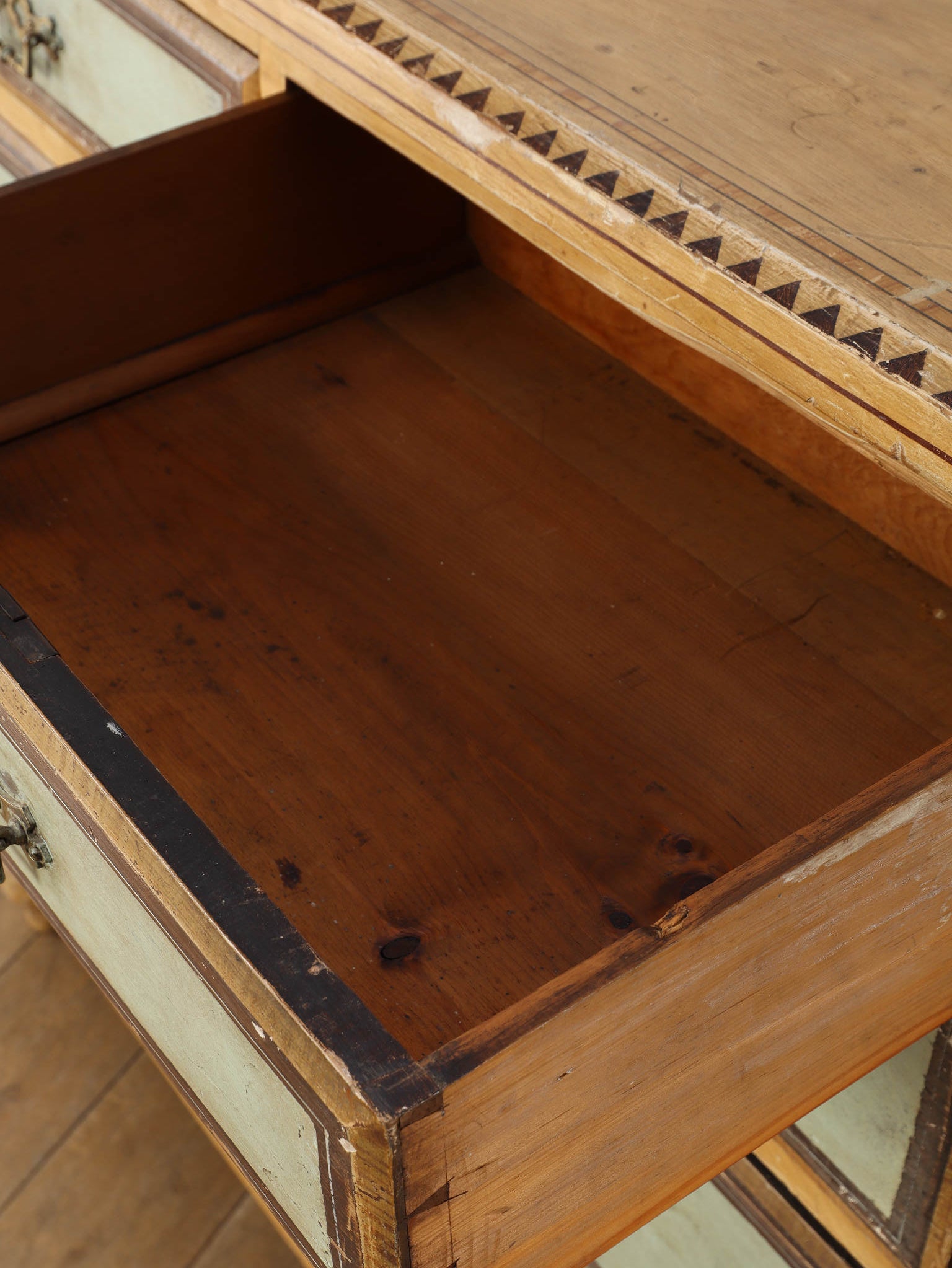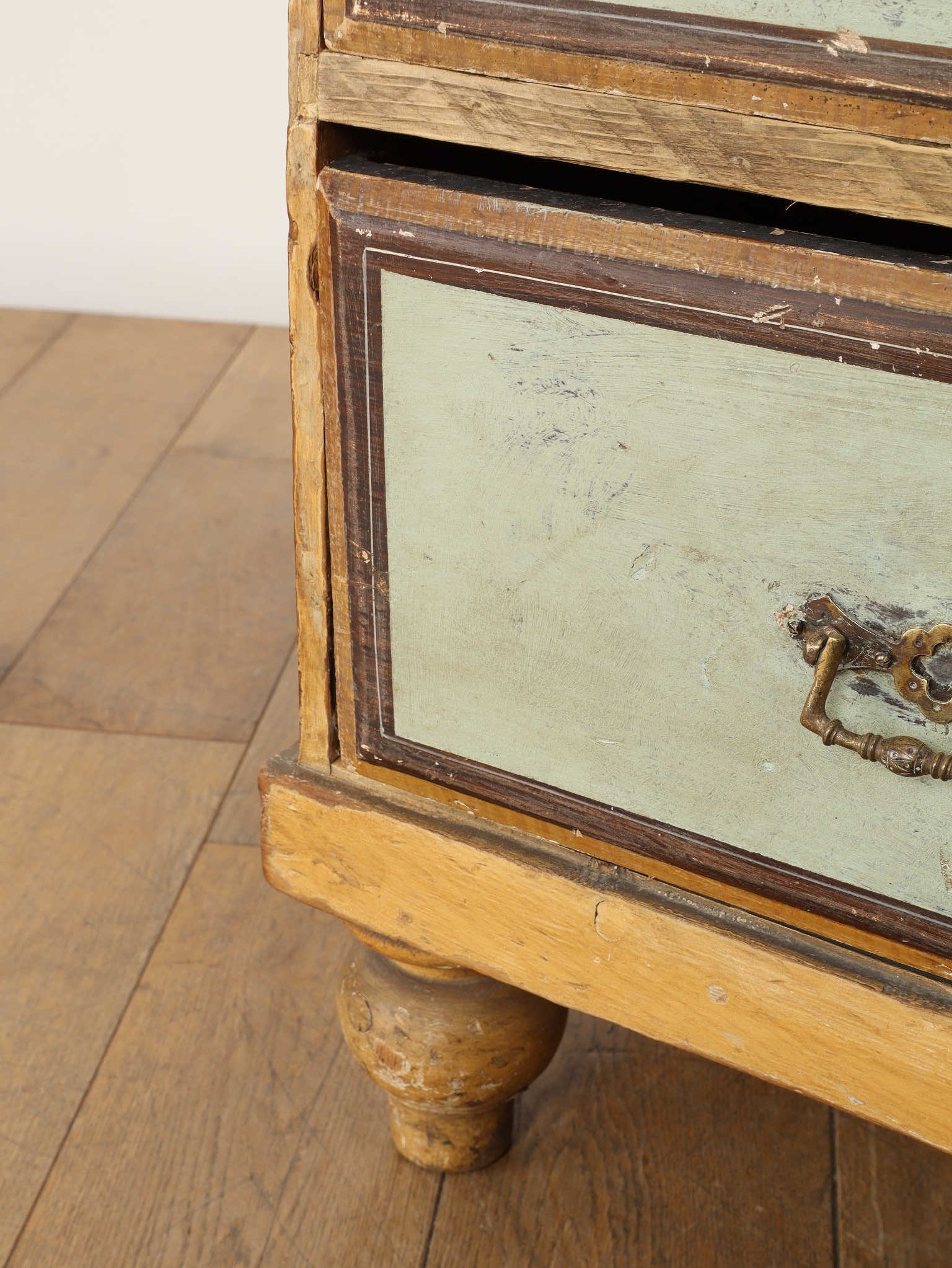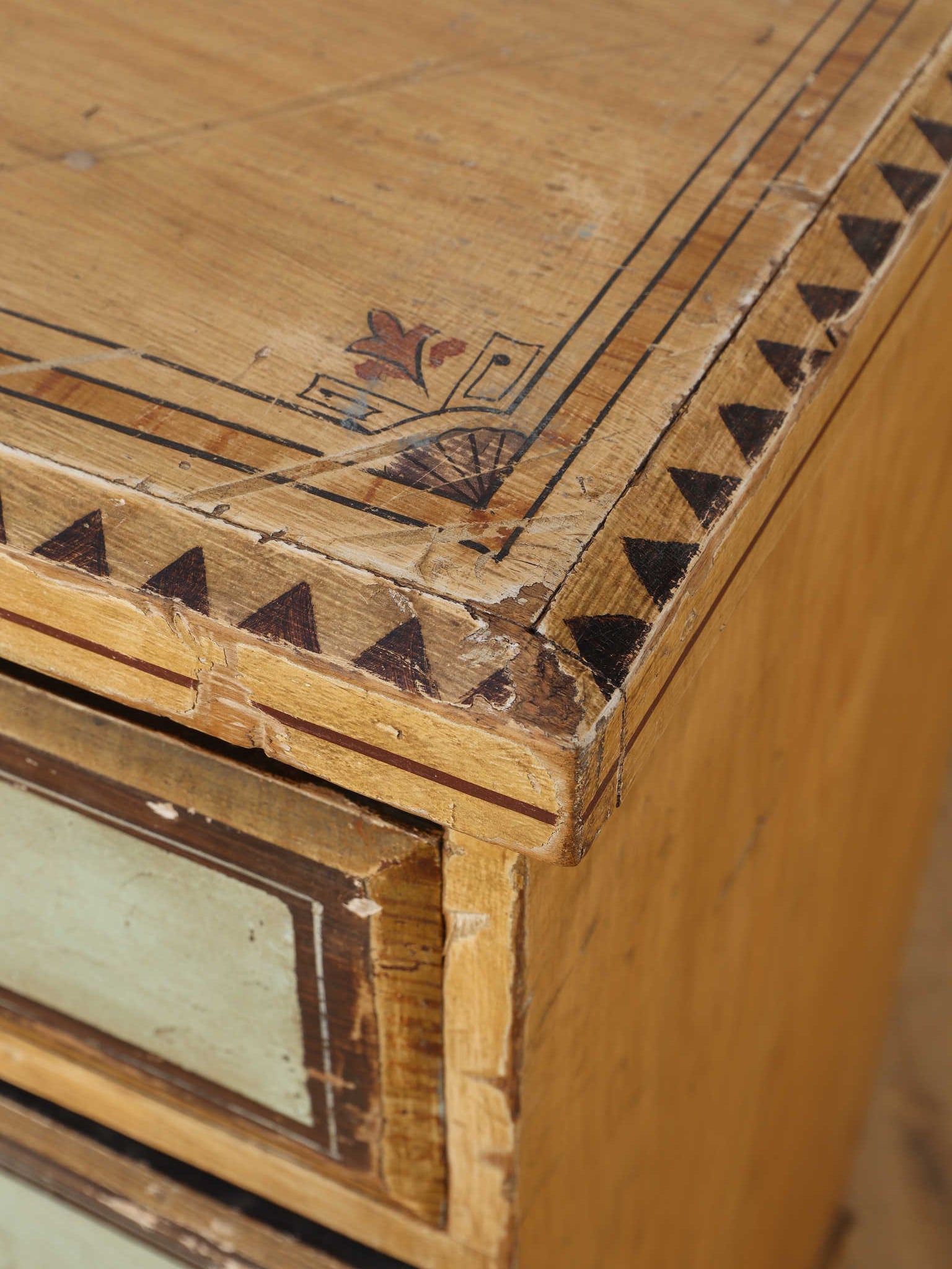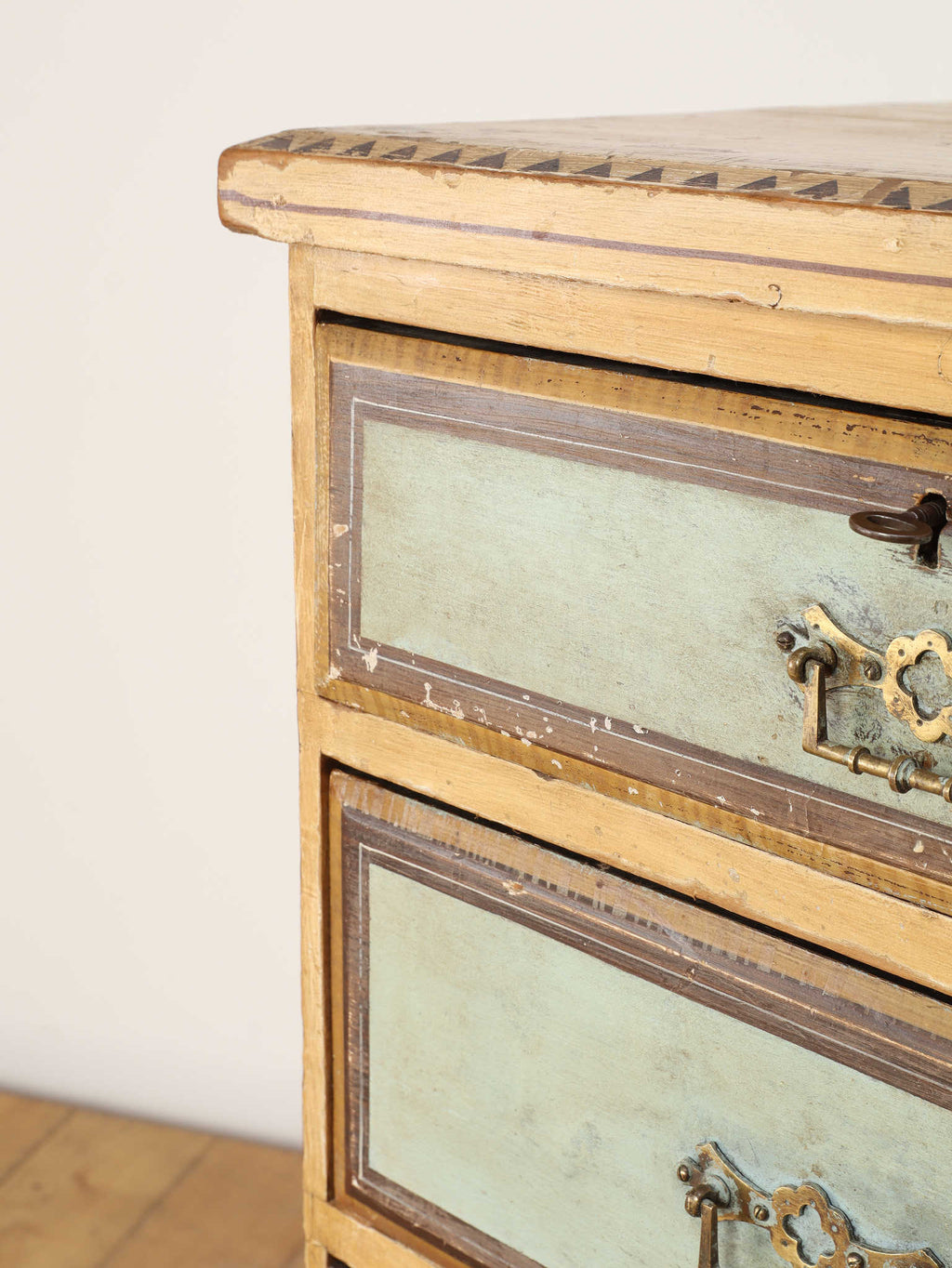 推定1910年代、英国製のチェストです。素朴で温かみのある木肌に対し、引き出し前面に施された淡い色のペイントが、上品で柔らかなコントラストを生み出しています。天板の縁には幾何学的な装飾があしらわれ、控えめながらも作り手のこだわりを感じさせます。時を経て味わいを増したペイントの風合いと、ブラス製のクラシカルな取っ手金具が、アンティークならではのシャビーシックな魅力を放っています。足元はコロンとした丸いバンフットで支えられ、愛らしい表情を加えています。収納力のある大小の引き出しは実用性が高く、寝室での衣類収納はもちろん、リビングのアクセント家具としても活躍します。空間に穏やかな彩りと、英国カントリーのような優しい空気を運んでくれる素敵な一台です。