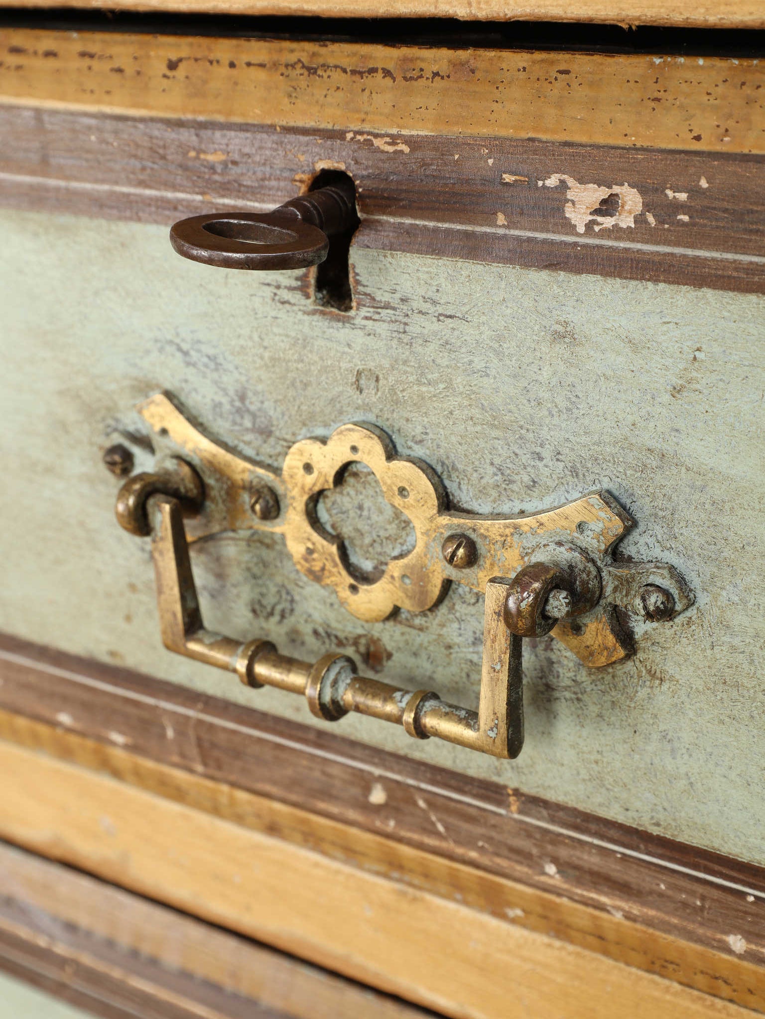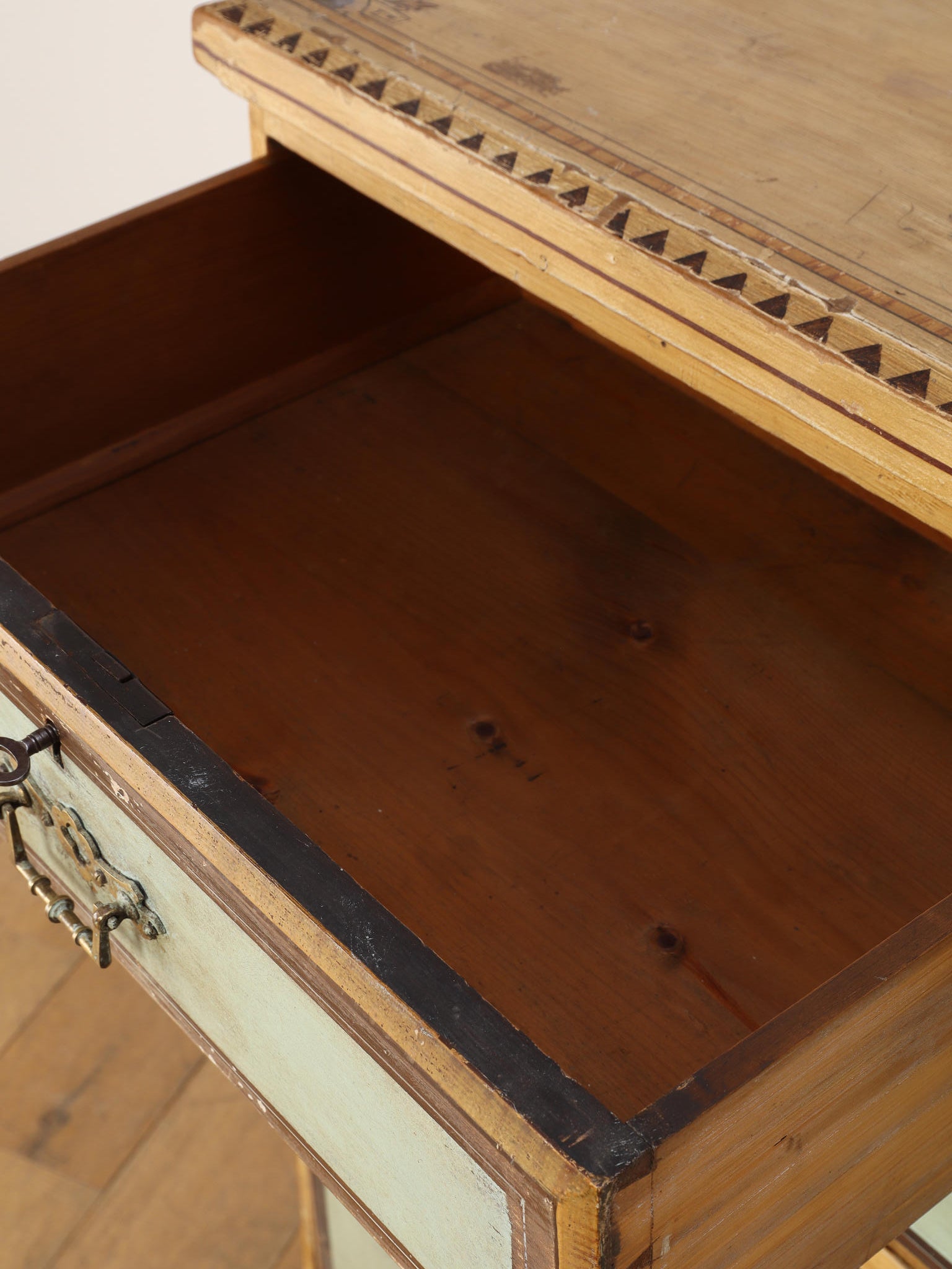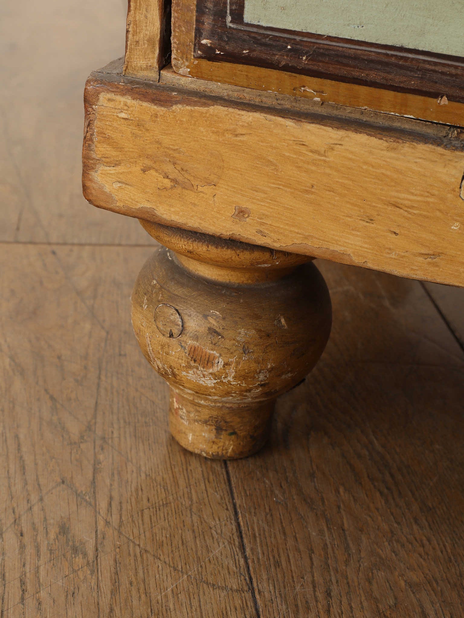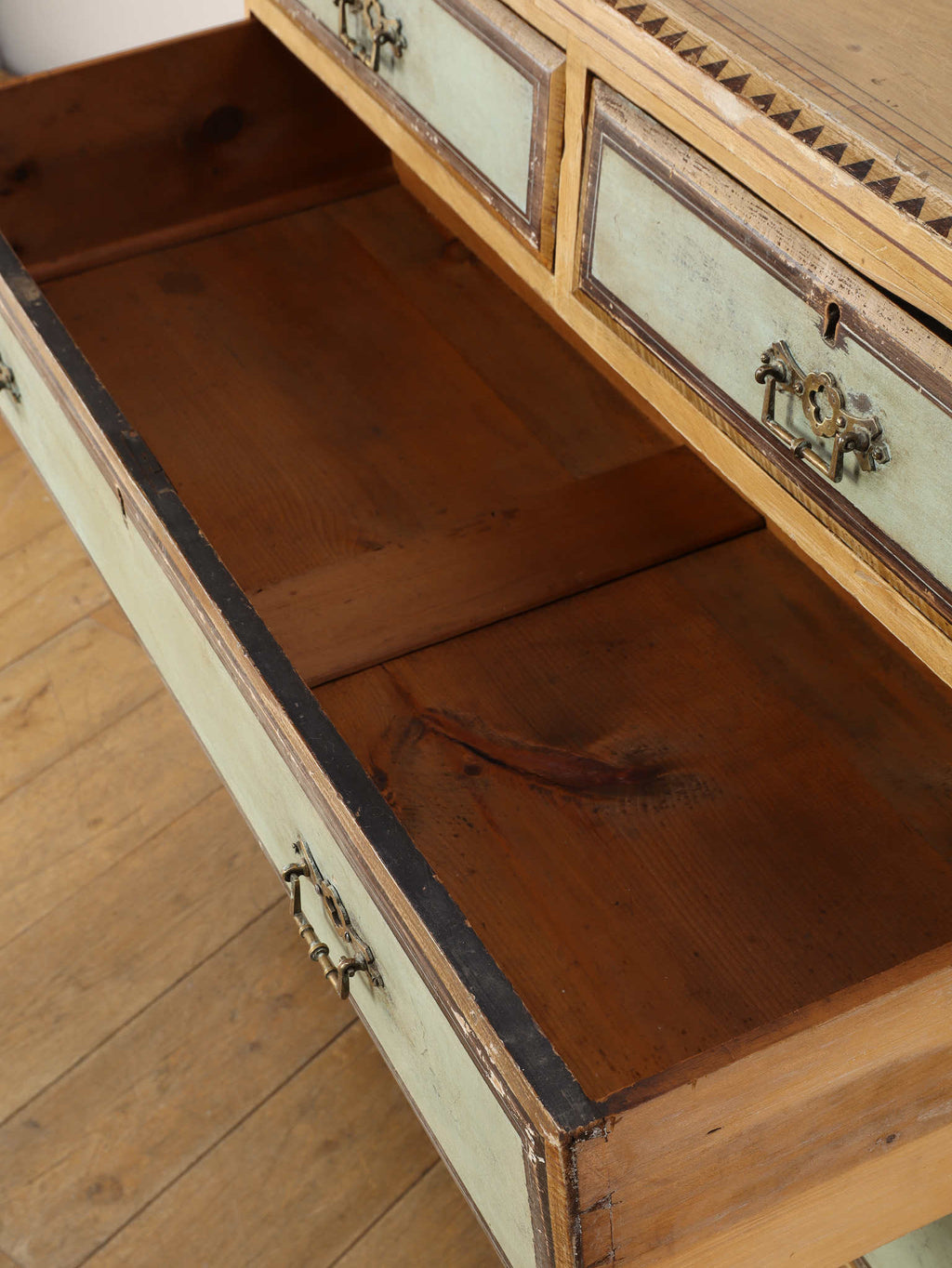 推定1910年代、英国製のチェストです。素朴で温かみのある木肌に対し、引き出し前面に施された淡い色のペイントが、上品で柔らかなコントラストを生み出しています。天板の縁には幾何学的な装飾があしらわれ、控えめながらも作り手のこだわりを感じさせます。時を経て味わいを増したペイントの風合いと、ブラス製のクラシカルな取っ手金具が、アンティークならではのシャビーシックな魅力を放っています。足元はコロンとした丸いバンフットで支えられ、愛らしい表情を加えています。収納力のある大小の引き出しは実用性が高く、寝室での衣類収納はもちろん、リビングのアクセント家具としても活躍します。空間に穏やかな彩りと、英国カントリーのような優しい空気を運んでくれる素敵な一台です。