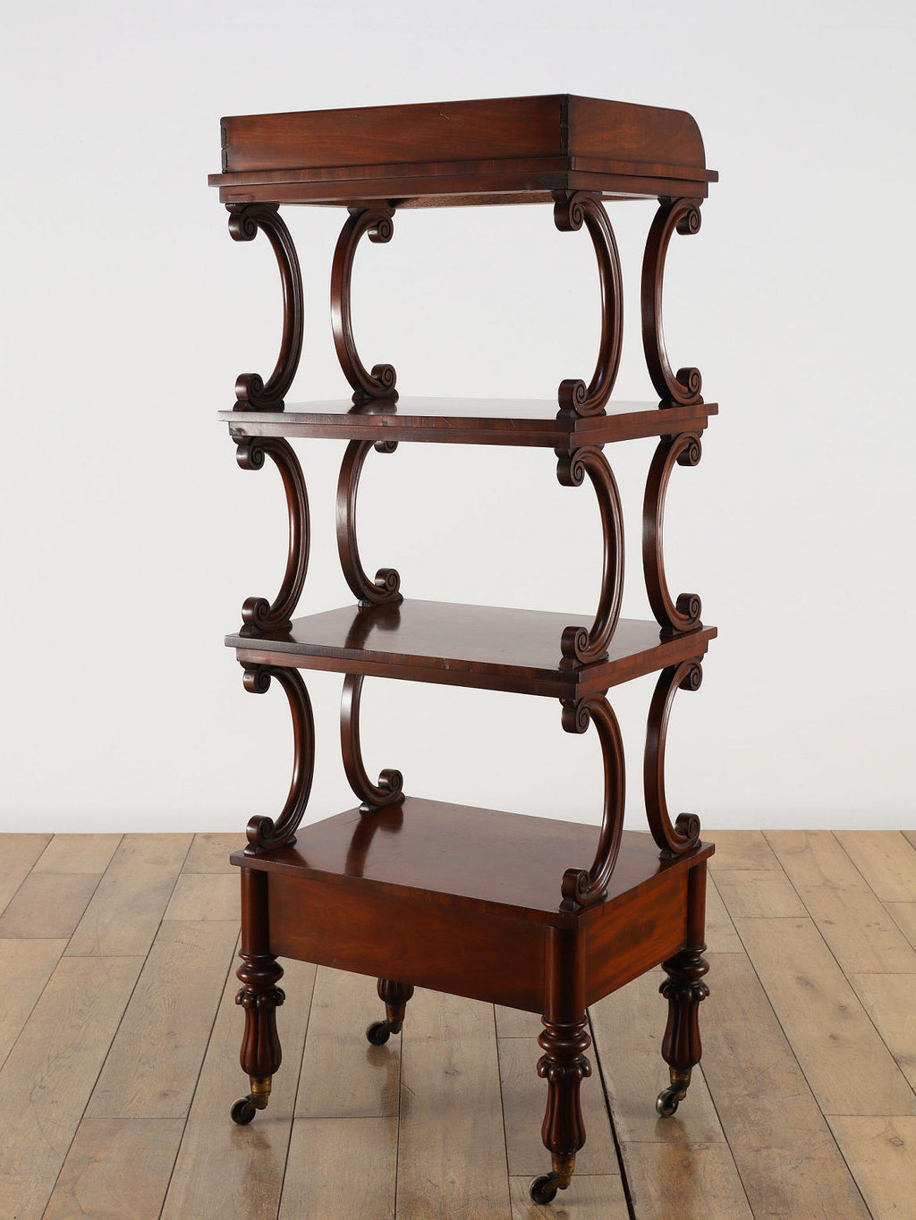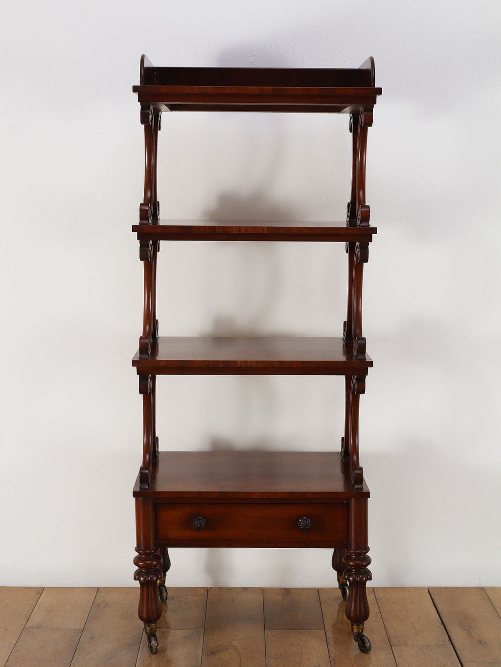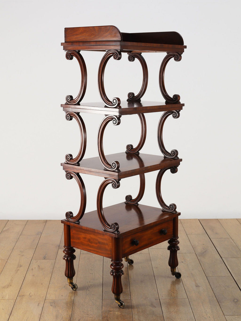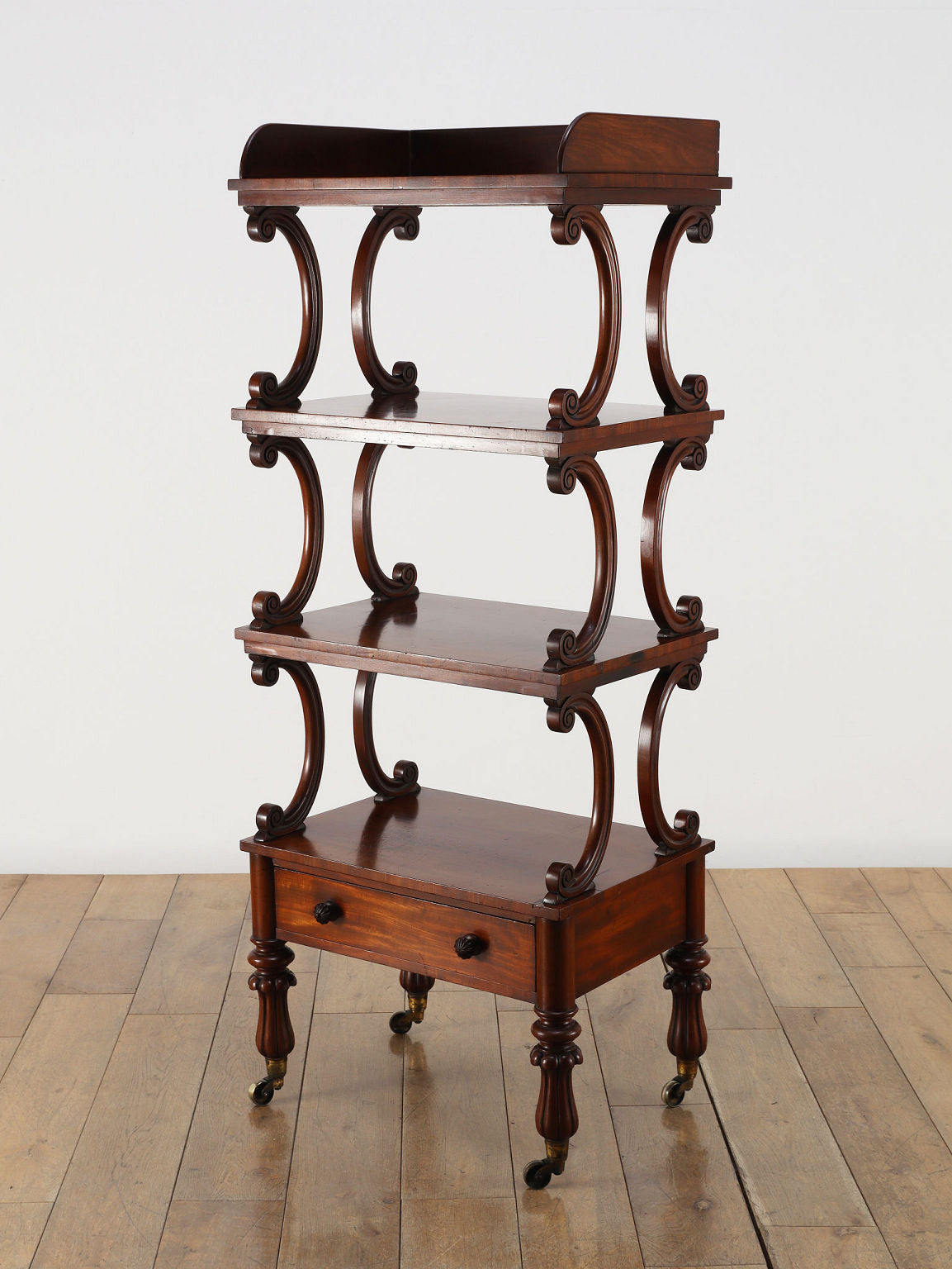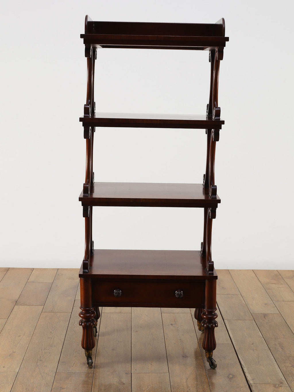 1880年代(推定)、英国の名門家具メーカーWARING & GILLOW社製のシェルフです。英国アンティークの中でも最高峰の品質と称されるWARING & GILLOW社の作品は、その卓越した造りと美しさで、世界中のコレクターを魅了し続けています。素材にはマホガニー材が使用され、深みのある色艶と美しい杢目が、圧倒的な気品を漂わせています。目を引くのは、棚板を支える優美なS字曲線のスクロールデザイン。重厚でありながらも軽やかなリズムを生み出し、飾るものをより魅力的に引き立てます。最下段には実用的な抽斗を備え、脚元のキャスターで移動もスムーズに行えます。お気に入りの小物や書籍を飾るシェルフとして、空間に英国貴族の邸宅のような格式高い雰囲気をもたらしてくれます。