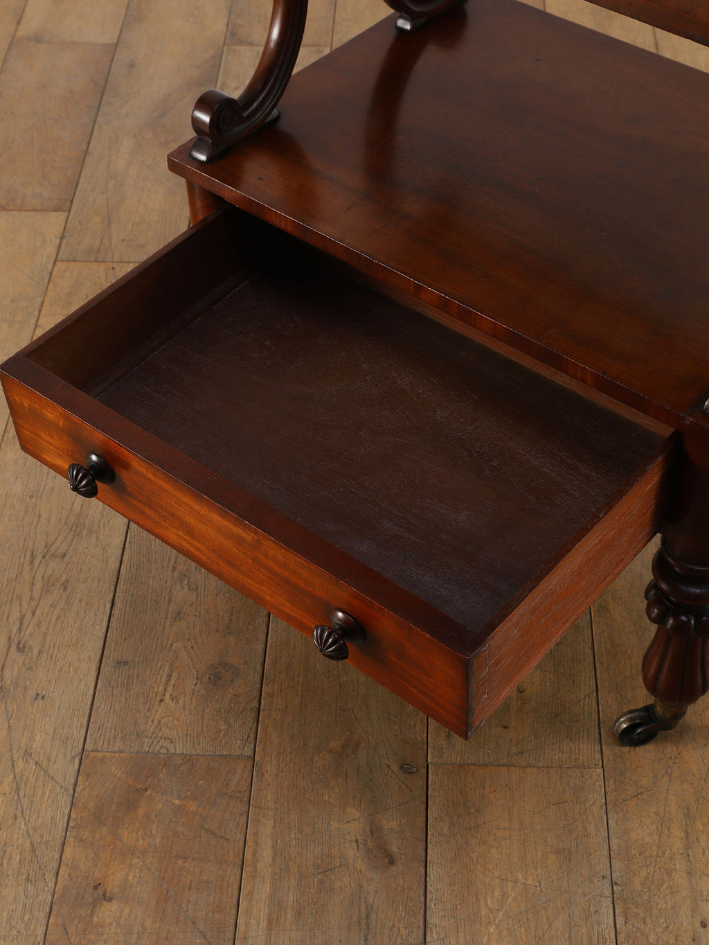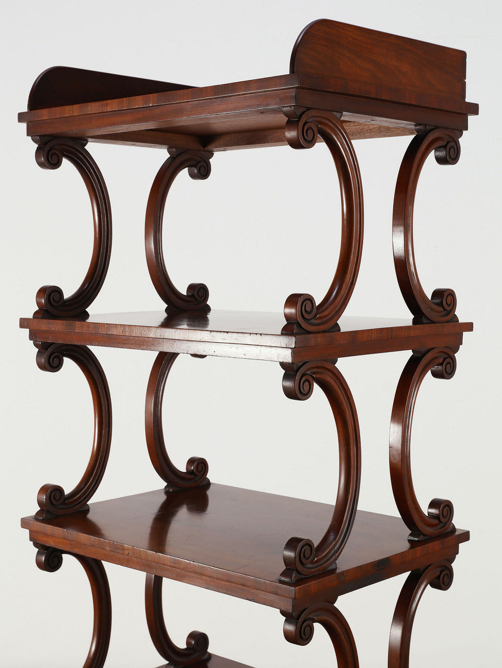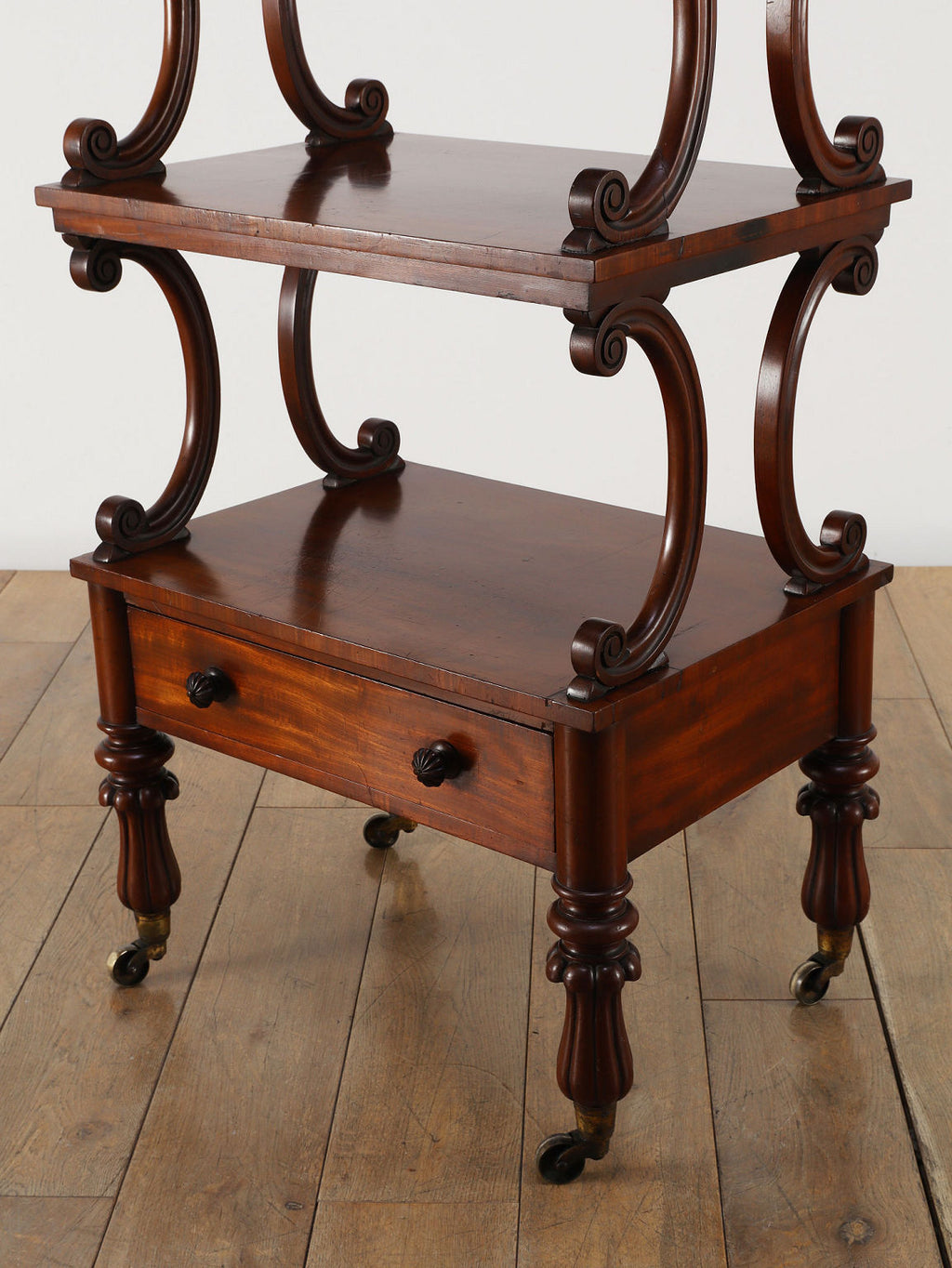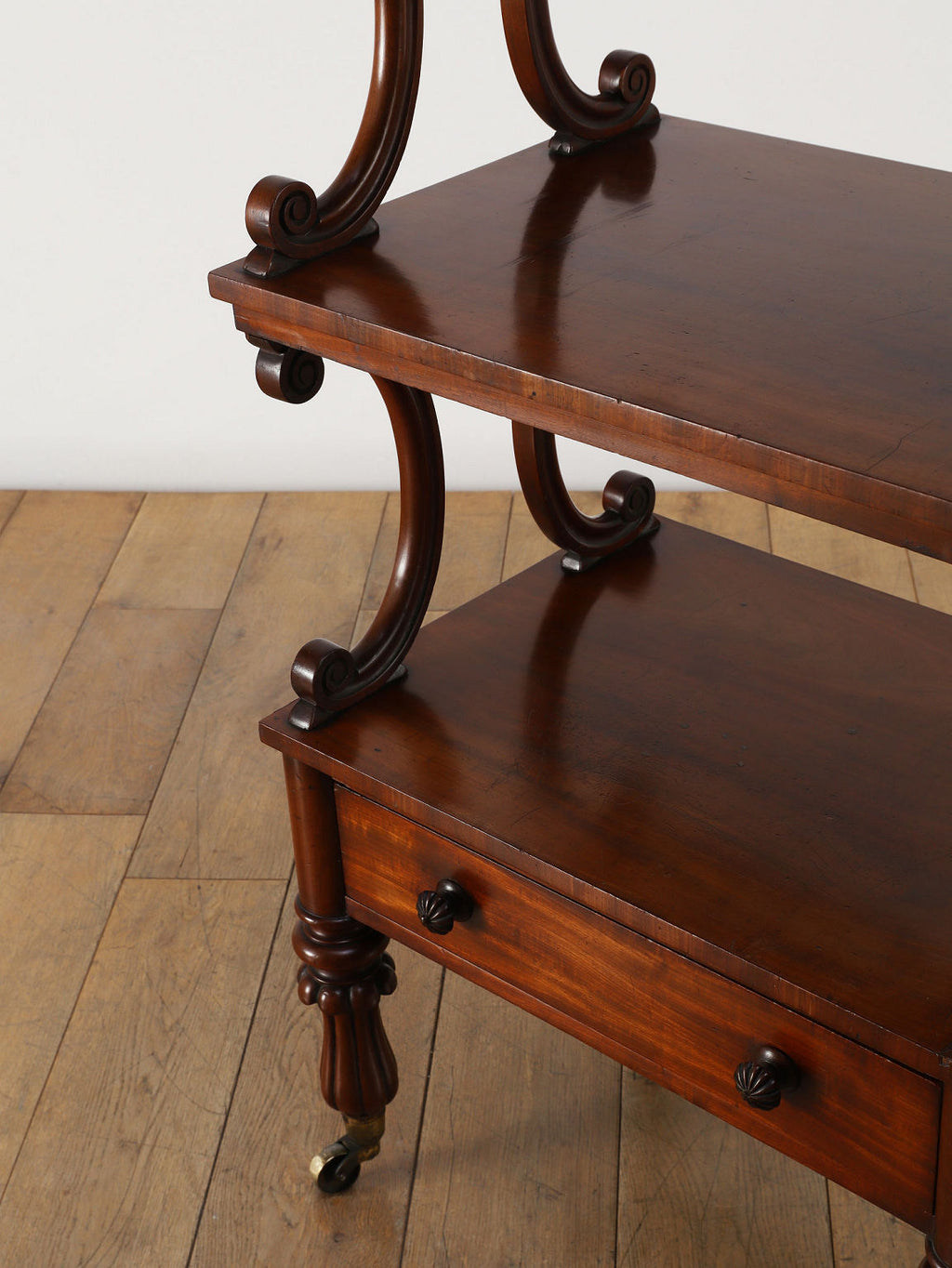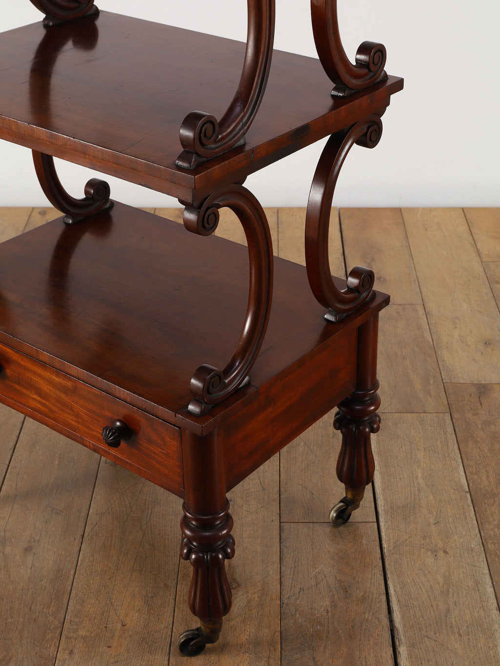 1880年代(推定)、英国の名門家具メーカーWARING & GILLOW社製のシェルフです。英国アンティークの中でも最高峰の品質と称されるWARING & GILLOW社の作品は、その卓越した造りと美しさで、世界中のコレクターを魅了し続けています。素材にはマホガニー材が使用され、深みのある色艶と美しい杢目が、圧倒的な気品を漂わせています。目を引くのは、棚板を支える優美なS字曲線のスクロールデザイン。重厚でありながらも軽やかなリズムを生み出し、飾るものをより魅力的に引き立てます。最下段には実用的な抽斗を備え、脚元のキャスターで移動もスムーズに行えます。お気に入りの小物や書籍を飾るシェルフとして、空間に英国貴族の邸宅のような格式高い雰囲気をもたらしてくれます。