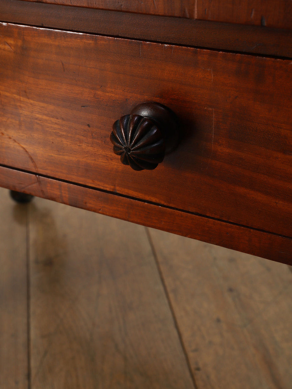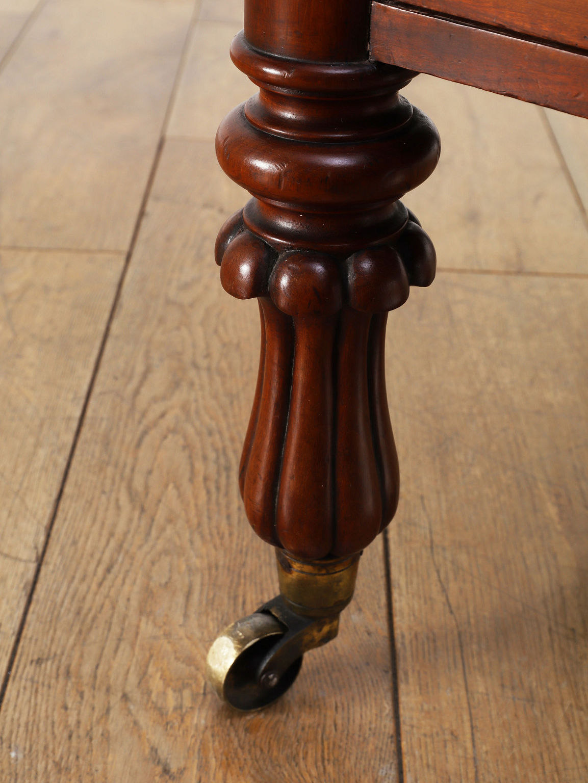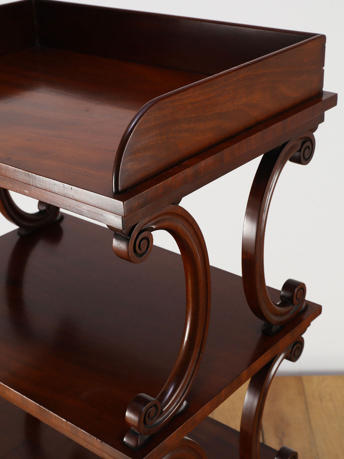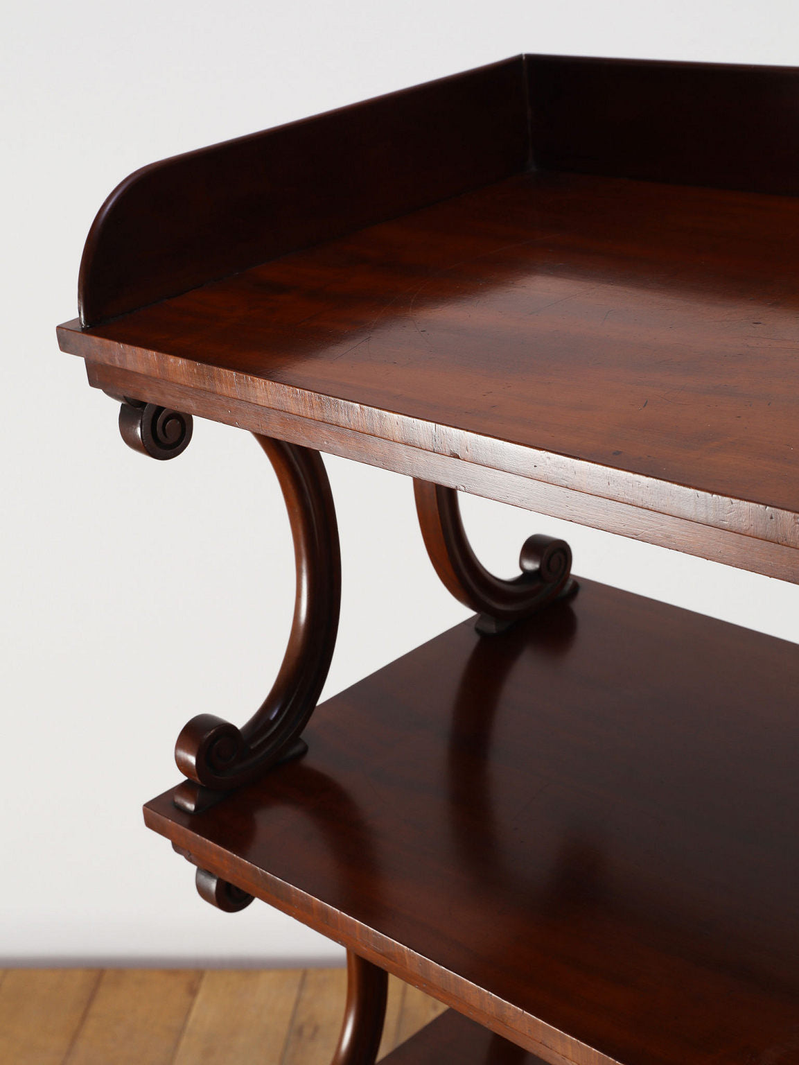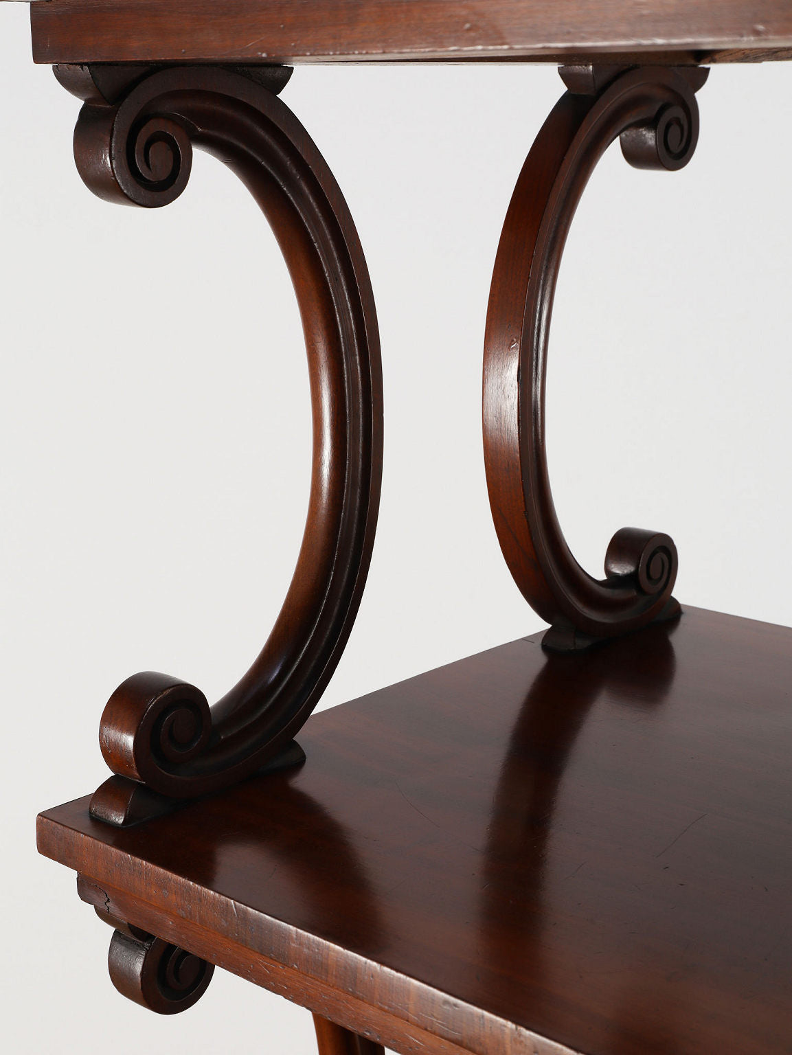 1880年代(推定)、英国の名門家具メーカーWARING & GILLOW社製のシェルフです。英国アンティークの中でも最高峰の品質と称されるWARING & GILLOW社の作品は、その卓越した造りと美しさで、世界中のコレクターを魅了し続けています。素材にはマホガニー材が使用され、深みのある色艶と美しい杢目が、圧倒的な気品を漂わせています。目を引くのは、棚板を支える優美なS字曲線のスクロールデザイン。重厚でありながらも軽やかなリズムを生み出し、飾るものをより魅力的に引き立てます。最下段には実用的な抽斗を備え、脚元のキャスターで移動もスムーズに行えます。お気に入りの小物や書籍を飾るシェルフとして、空間に英国貴族の邸宅のような格式高い雰囲気をもたらしてくれます。