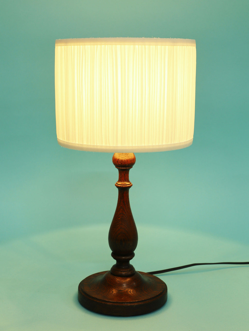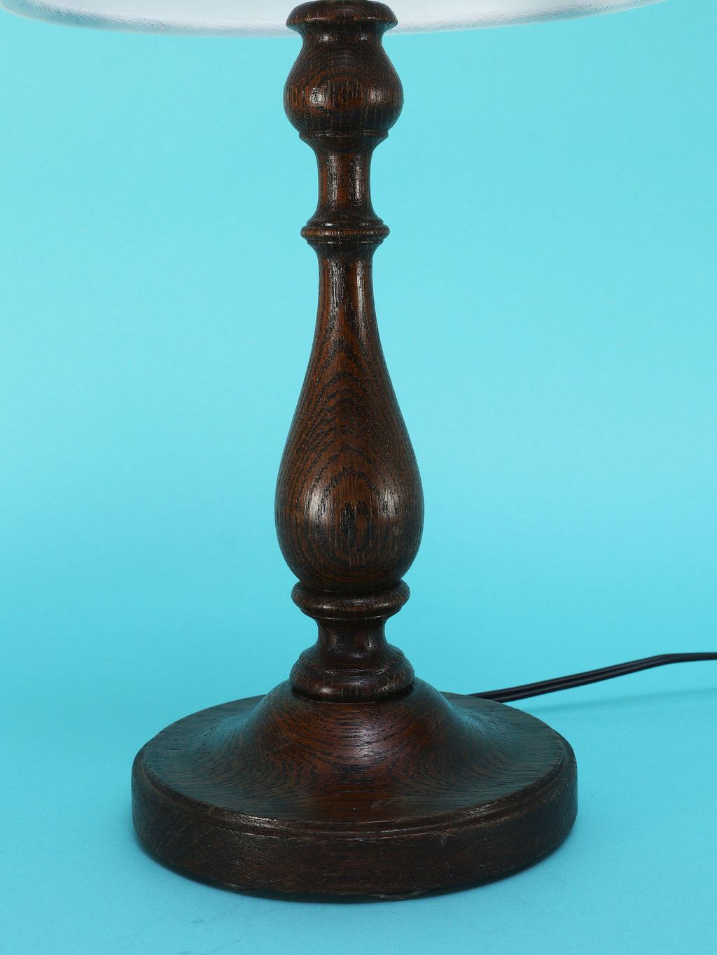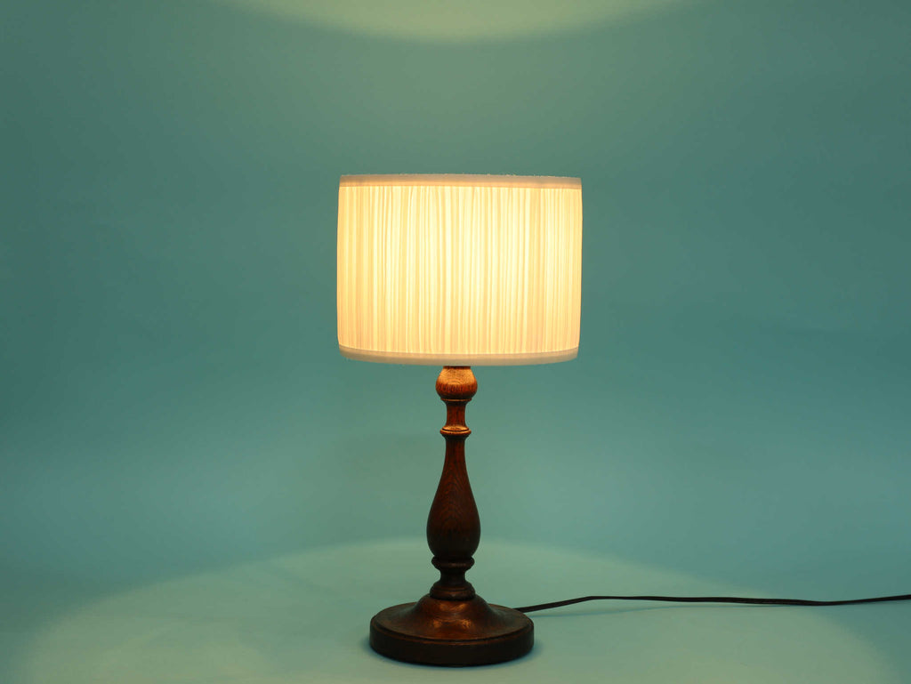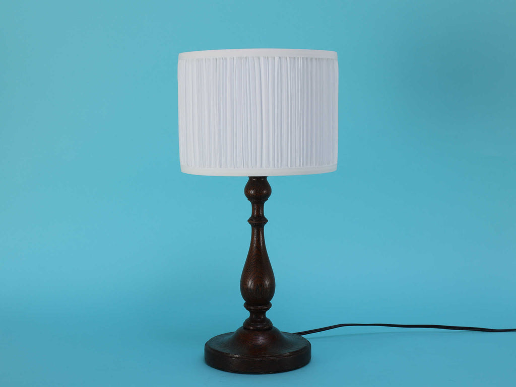 1930年代(推定)英国製の挽物細工が美しいオーク材のテーブルランプ。重厚なオーク材を使用し、中央部分に施された挽物細工(ターニング)が、クラシックな英国家具の伝統を感じさせます。根元から中央にかけての優雅な曲線、そしてそれを支える安定感のある円形の台座が、このランプに格調高い佇まいを与えています。深みを増したオーク材の杢目と、使い込まれた古艶が醸し出す落ち着いた雰囲気は、空間に確かな信頼感をもたらします。上部には、円柱型の白いシェードがつくことで、重厚な木製ベースに軽やかさが加わり、読書灯や間接照明として、落ち着いた光を届けてくれるでしょう。書斎やベッドサイドに最適な、実用性と美しさを兼ね備えた一品です。