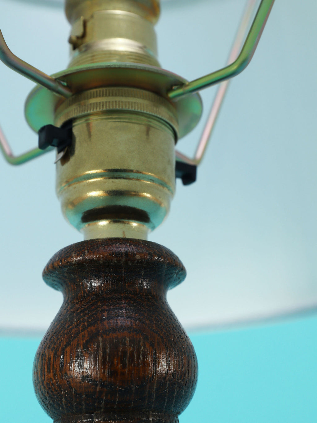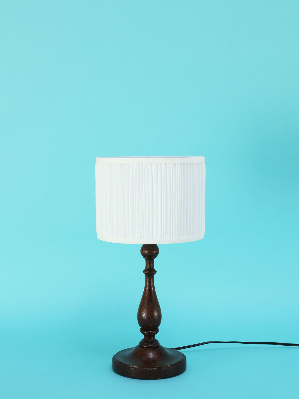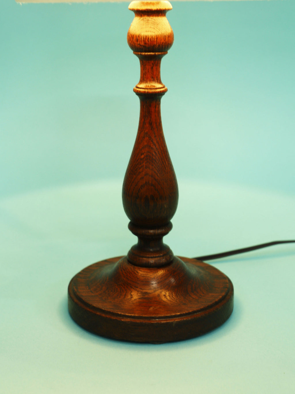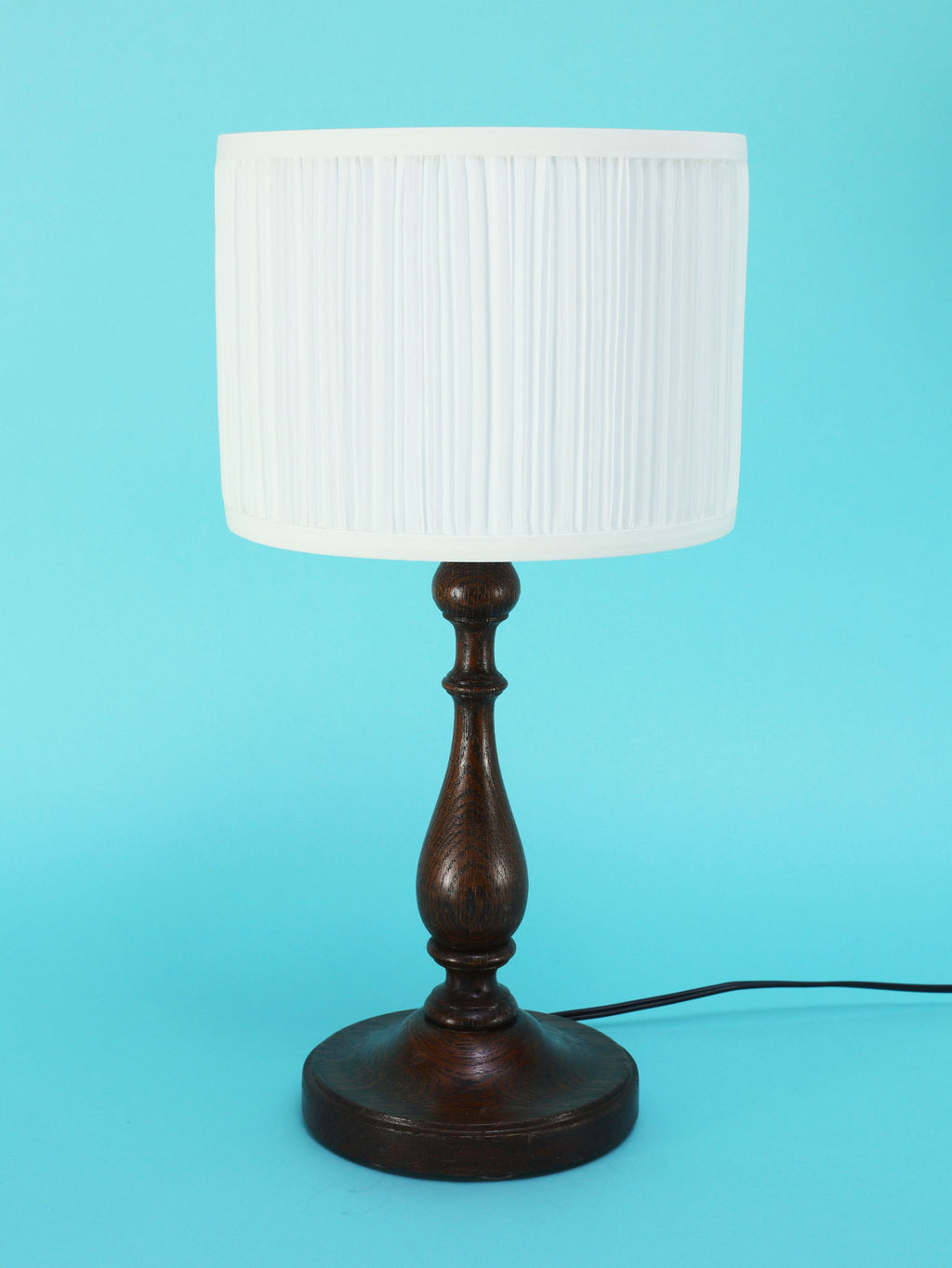 1930年代(推定)英国製の挽物細工が美しいオーク材のテーブルランプ。重厚なオーク材を使用し、中央部分に施された挽物細工(ターニング)が、クラシックな英国家具の伝統を感じさせます。根元から中央にかけての優雅な曲線、そしてそれを支える安定感のある円形の台座が、このランプに格調高い佇まいを与えています。深みを増したオーク材の杢目と、使い込まれた古艶が醸し出す落ち着いた雰囲気は、空間に確かな信頼感をもたらします。上部には、円柱型の白いシェードがつくことで、重厚な木製ベースに軽やかさが加わり、読書灯や間接照明として、落ち着いた光を届けてくれるでしょう。書斎やベッドサイドに最適な、実用性と美しさを兼ね備えた一品です。