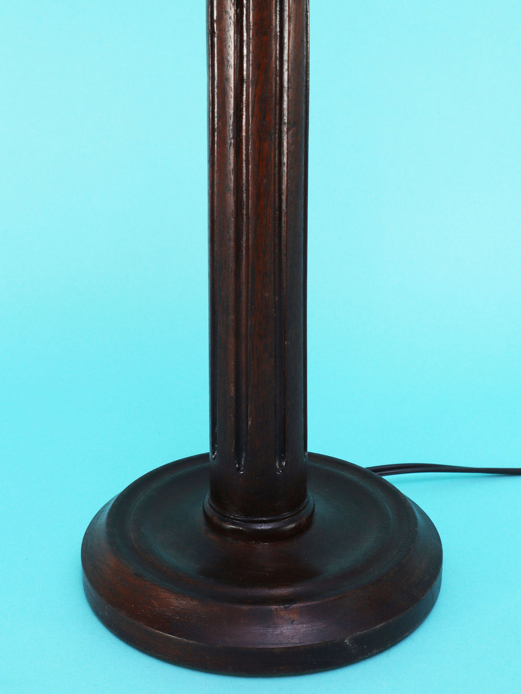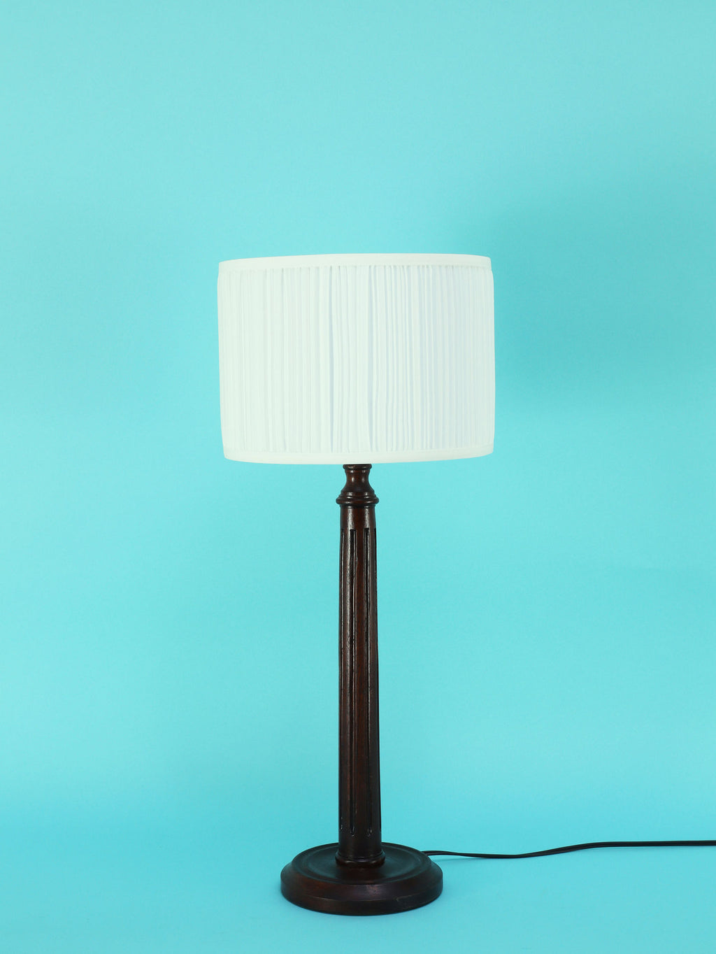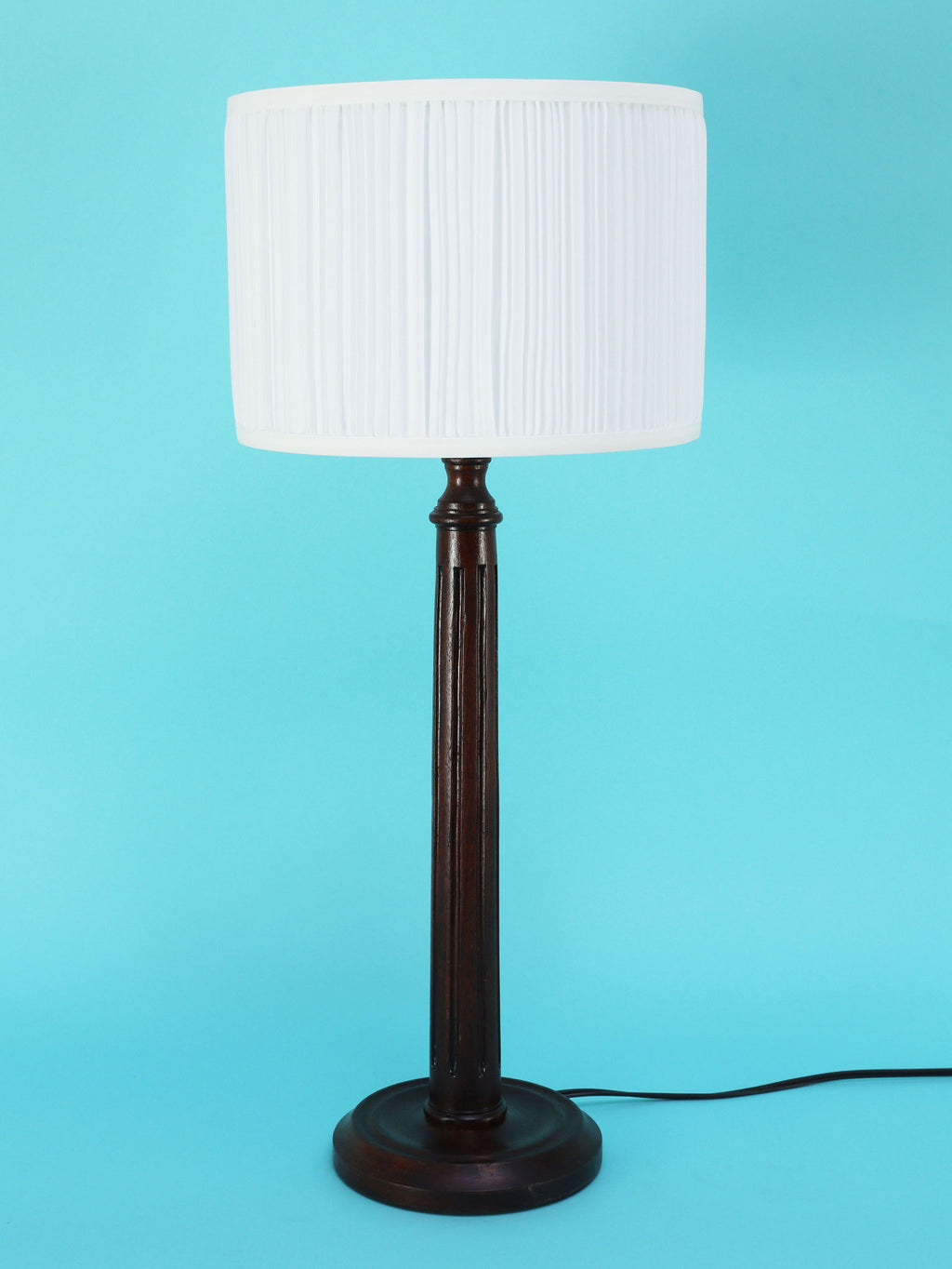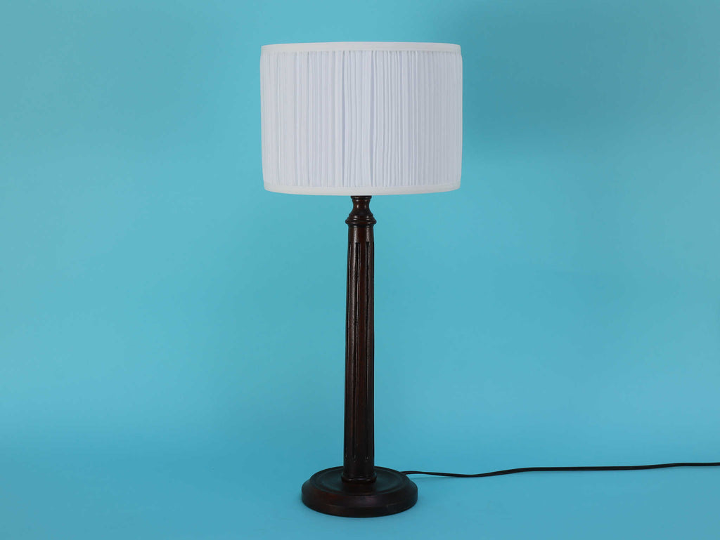 シンプルでモダンな印象のテーブルランプ。深いダークブラウンのベースは、この時代の英国家具らしい重厚で安定感のある円形台座と、すらりと伸びた柱状の支柱が特徴です。支柱には控えめな溝が縦に施されており、過度な装飾を排したデザインが、木材の持つ落ち着いた雰囲気を際立たせています。長年の時を経てきた木の古艶と深みのある色が、空間に確かな信頼感と落ち着きをもたらします。上部には、円柱型の白いシェードがつくことで、重厚なベースとのコントラストが生まれ、書斎やベッドサイドにモダン・クラシックな光を届けてくれるでしょう。飽きのこないシンプルな佇まいは、様々なインテリアに調和する一品です。