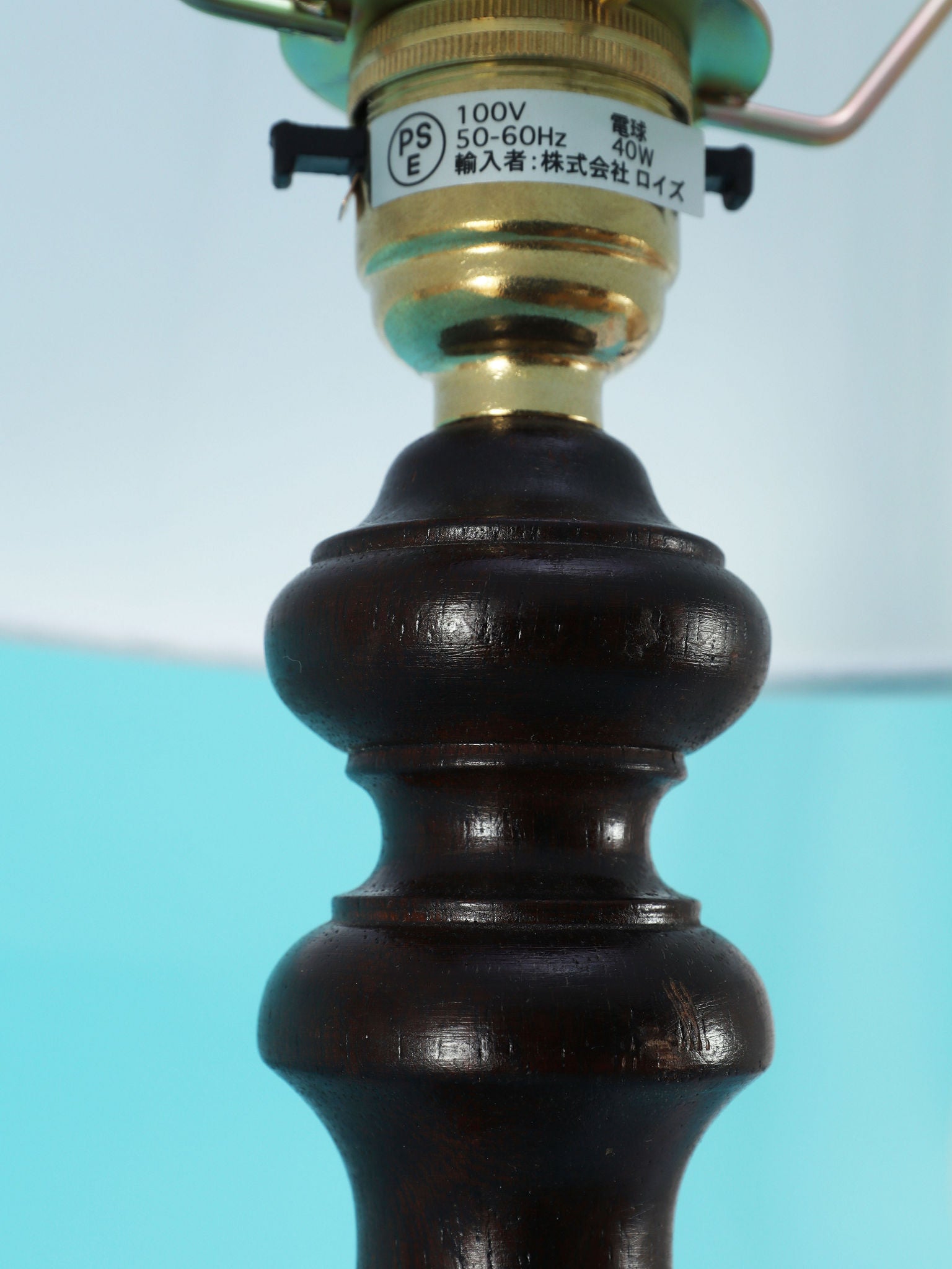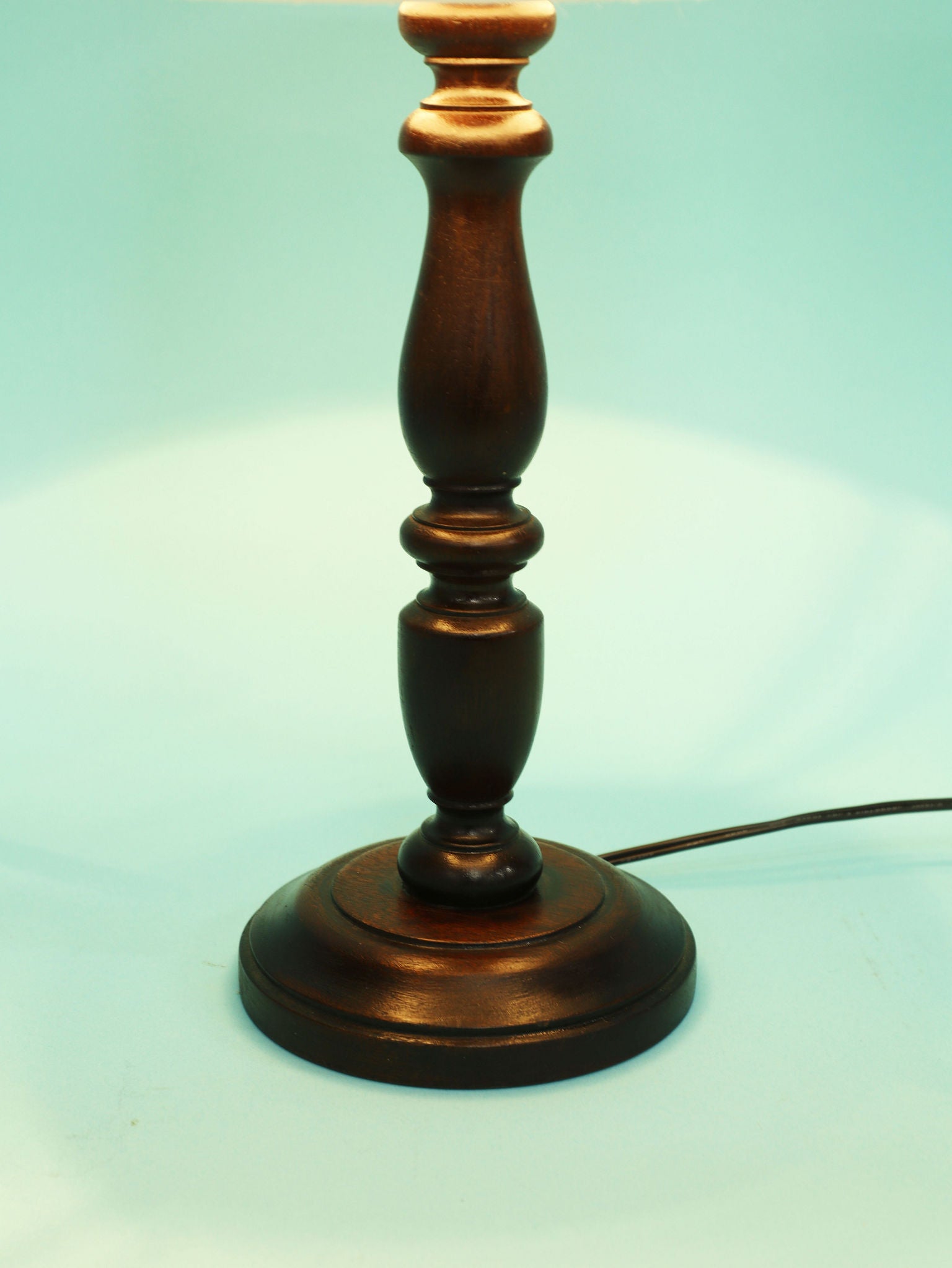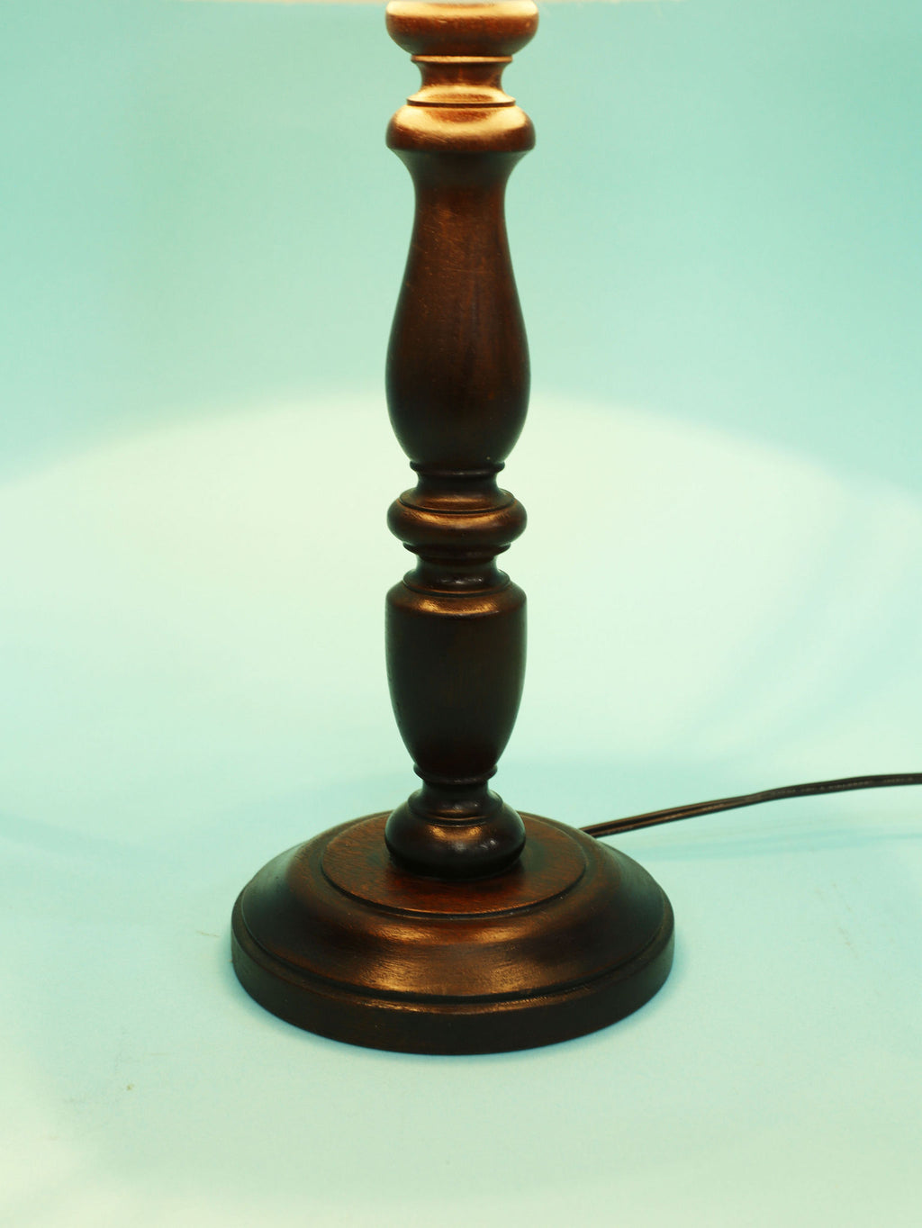 深く落ち着いたマホガニー材のベースは、安定感のある円形台座と、中央部分に施された挽物細工(ターニング)が特徴です。流れるような優雅な曲線を描くシルエットは、当時の英国のクラシカルな美意識を感じさせます。マホガニー材の持つ深い色と、経年によって生まれた艶(古艶)が、空間に確かな重厚感と信頼をもたらします。上部には、円柱型の白いシェードがつくことで、重厚な木製ベースとの対比が生まれ、読書灯や間接照明として、上品で柔らかな光を届けてくれるでしょう。書斎やベッドサイドに最適な、格調高い雰囲気を持つ一品です。