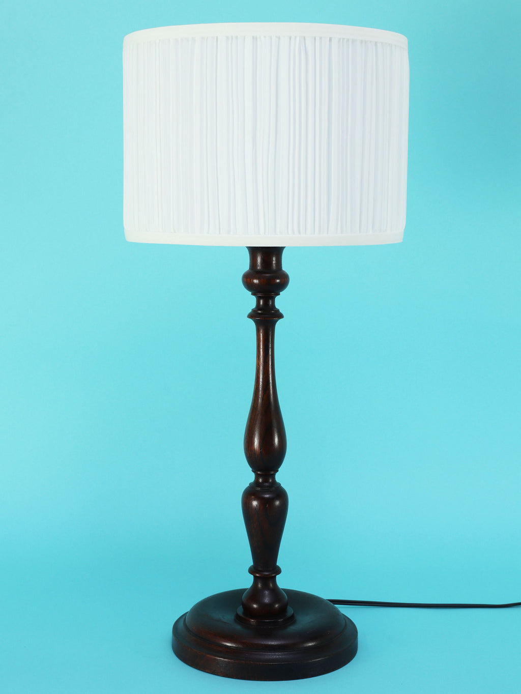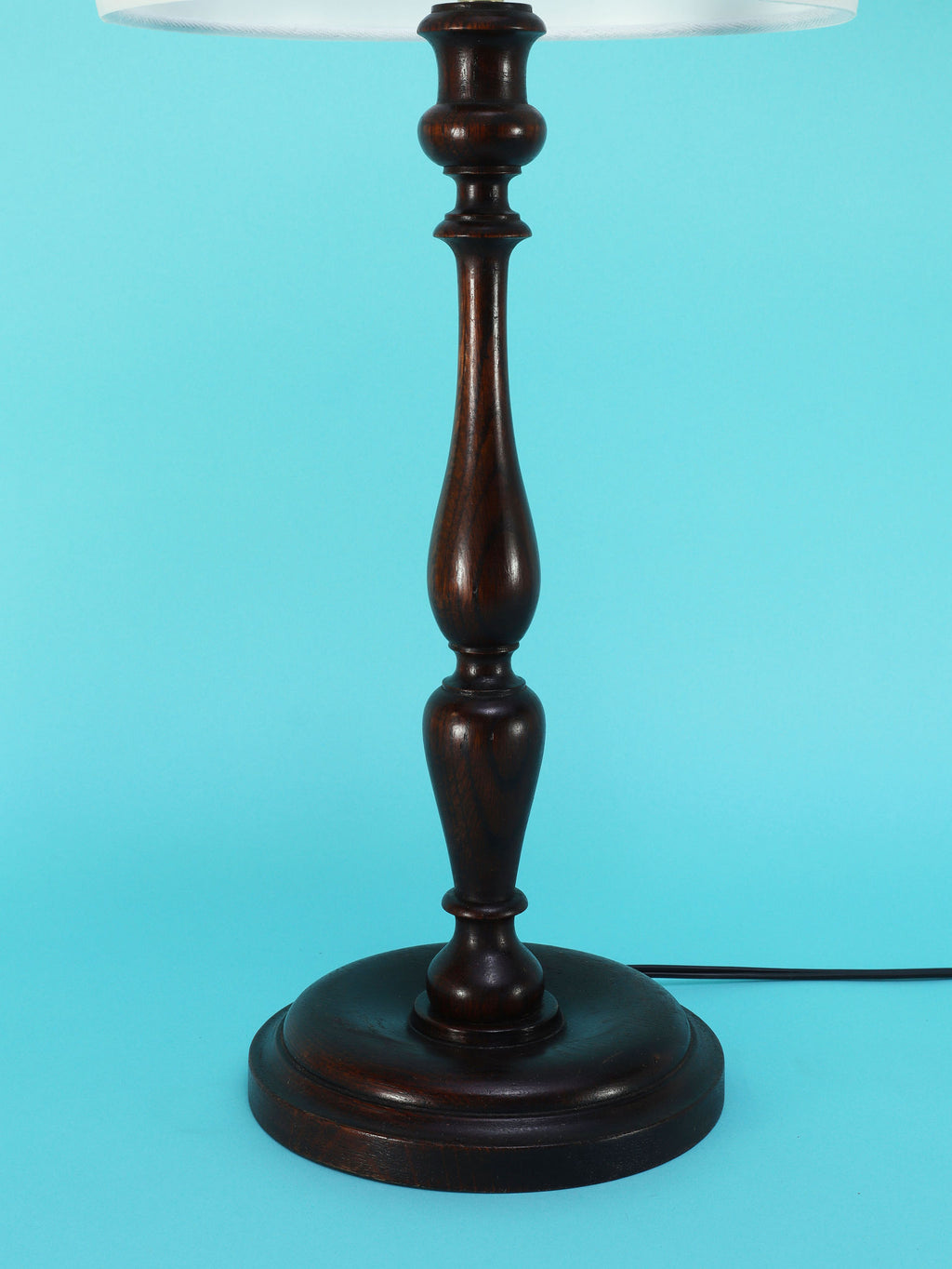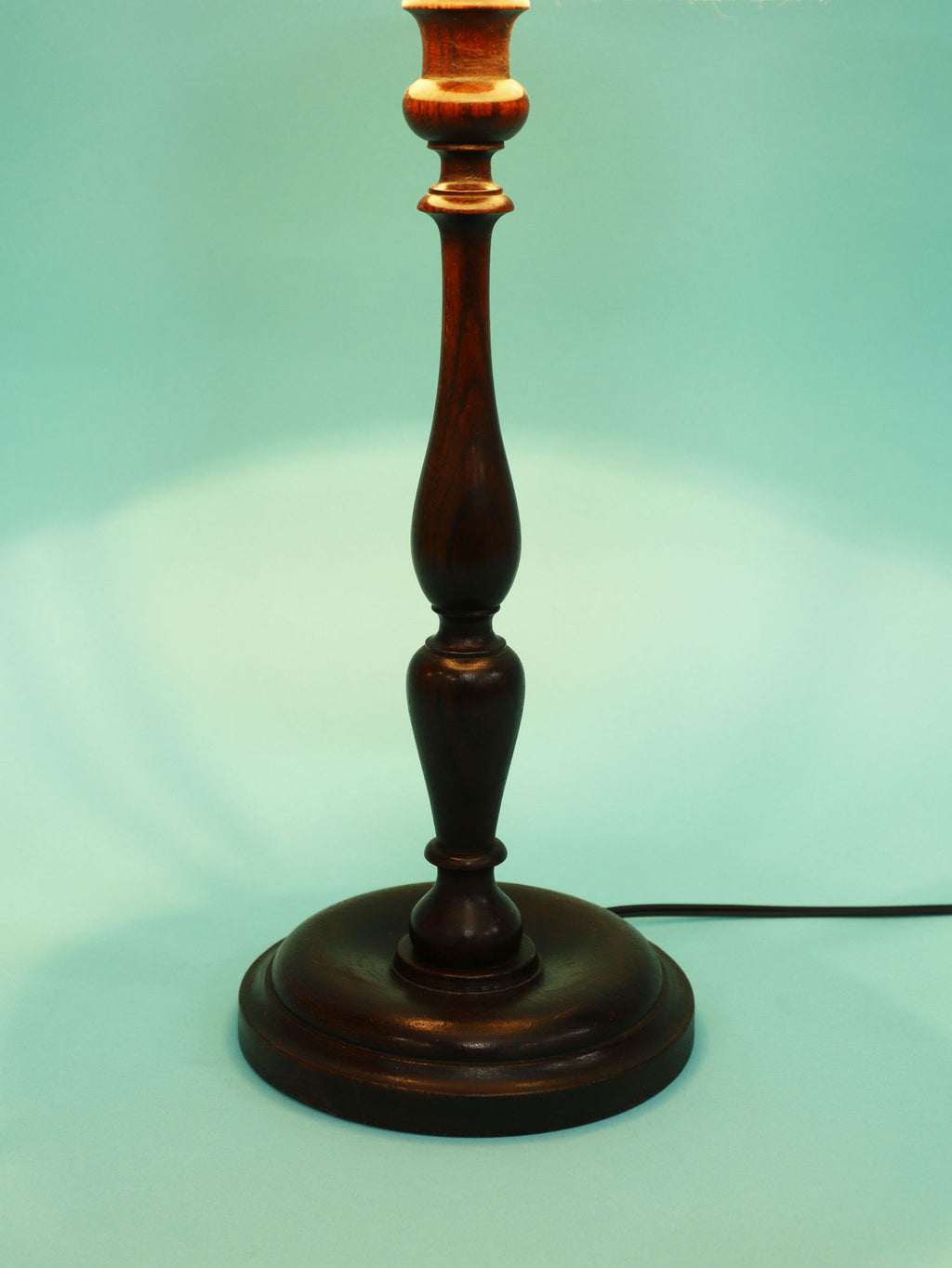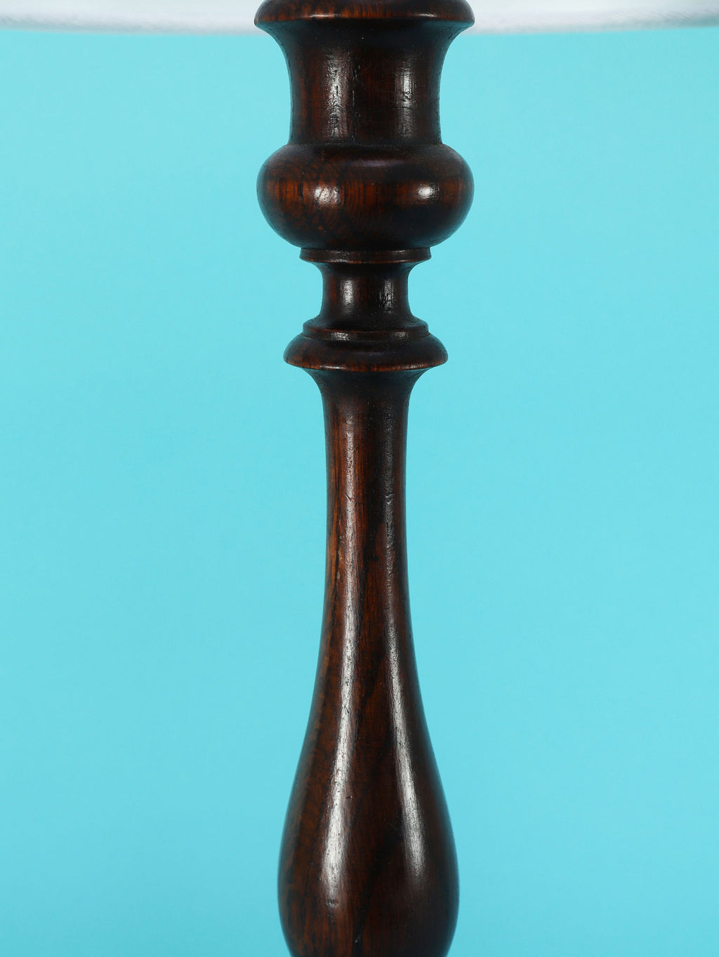 クラシカルな挽物細工が美しいオーク材のテーブルランプ。安定感のある円形台座から、中央で優雅に絞られた支柱へと流れるようなシルエットが特徴です。支柱には、当時の英国アンティークらしいツイスト(螺旋状)の挽物細工が施されており、職人の丁寧な手仕事が感じられます。深く落ち着いたオーク材の杢目と、長年の時を経てきた古艶が醸し出す雰囲気は、空間に確かな重厚感をもたらします。上部には、円柱型の白いシェードがつくことで、重厚な木製ベースに軽やかさが加わり、読書灯や間接照明として、上品で柔らかな光を届けてくれるでしょう。書斎やベッドサイドに最適な、格調高い雰囲気を持つ一品です。