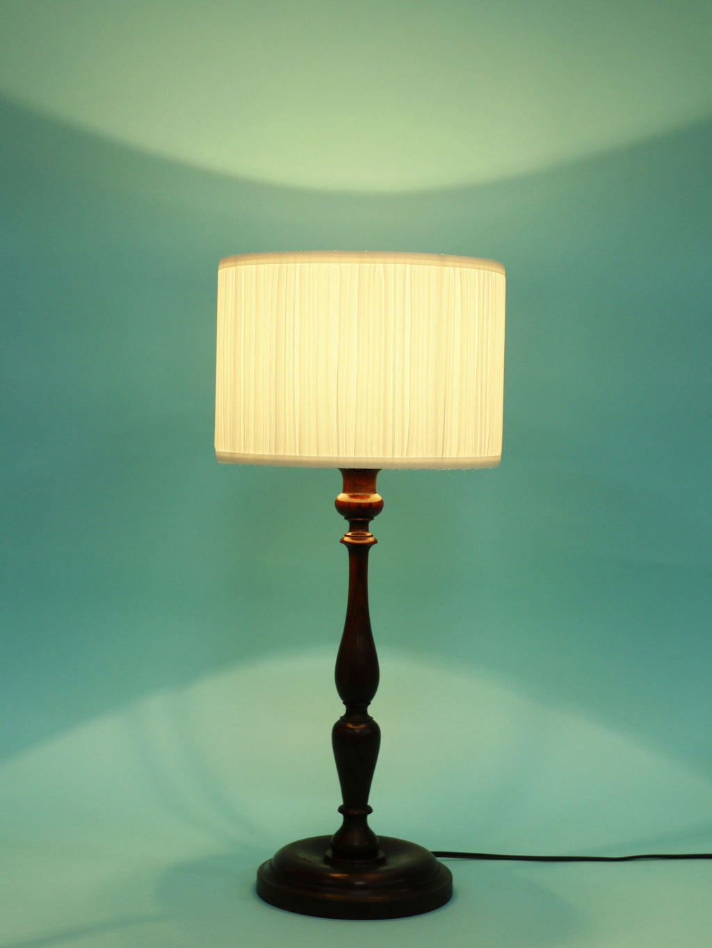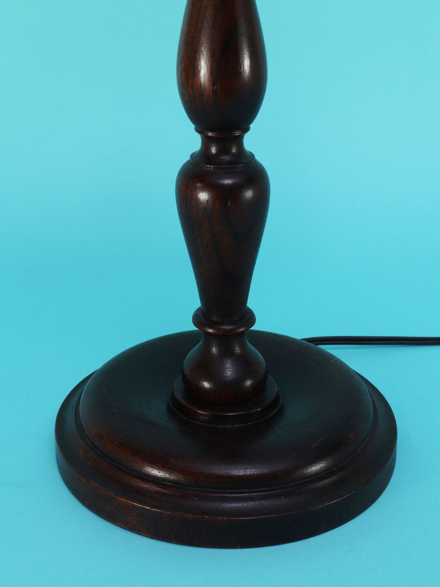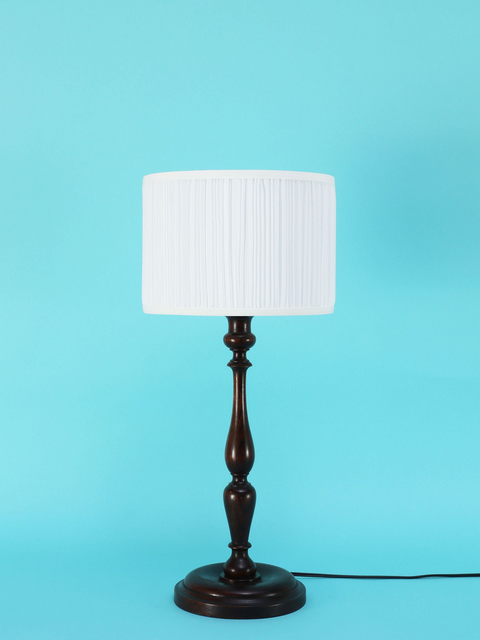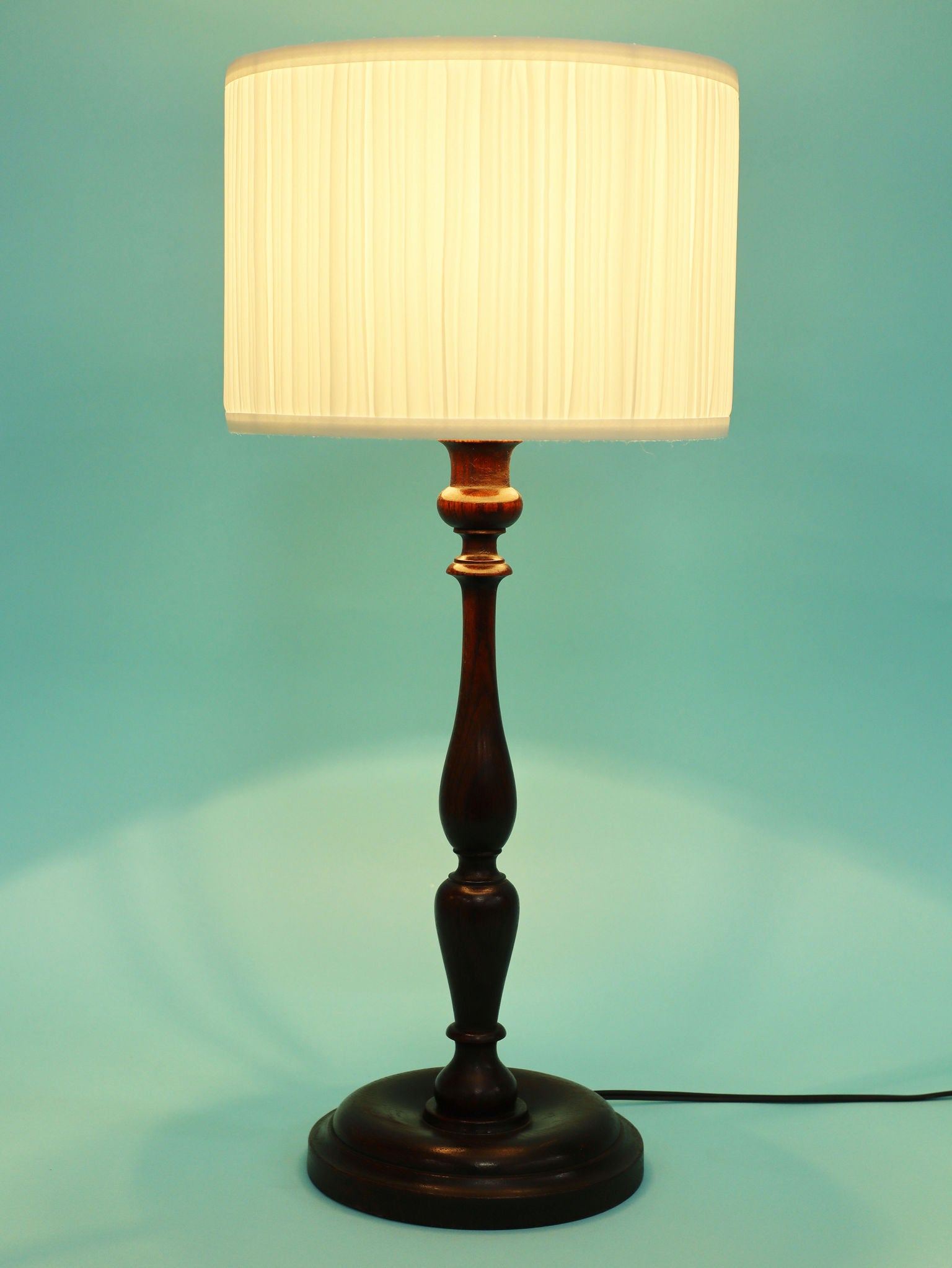 クラシカルな挽物細工が美しいオーク材のテーブルランプ。安定感のある円形台座から、中央で優雅に絞られた支柱へと流れるようなシルエットが特徴です。支柱には、当時の英国アンティークらしいツイスト(螺旋状)の挽物細工が施されており、職人の丁寧な手仕事が感じられます。深く落ち着いたオーク材の杢目と、長年の時を経てきた古艶が醸し出す雰囲気は、空間に確かな重厚感をもたらします。上部には、円柱型の白いシェードがつくことで、重厚な木製ベースに軽やかさが加わり、読書灯や間接照明として、上品で柔らかな光を届けてくれるでしょう。書斎やベッドサイドに最適な、格調高い雰囲気を持つ一品です。