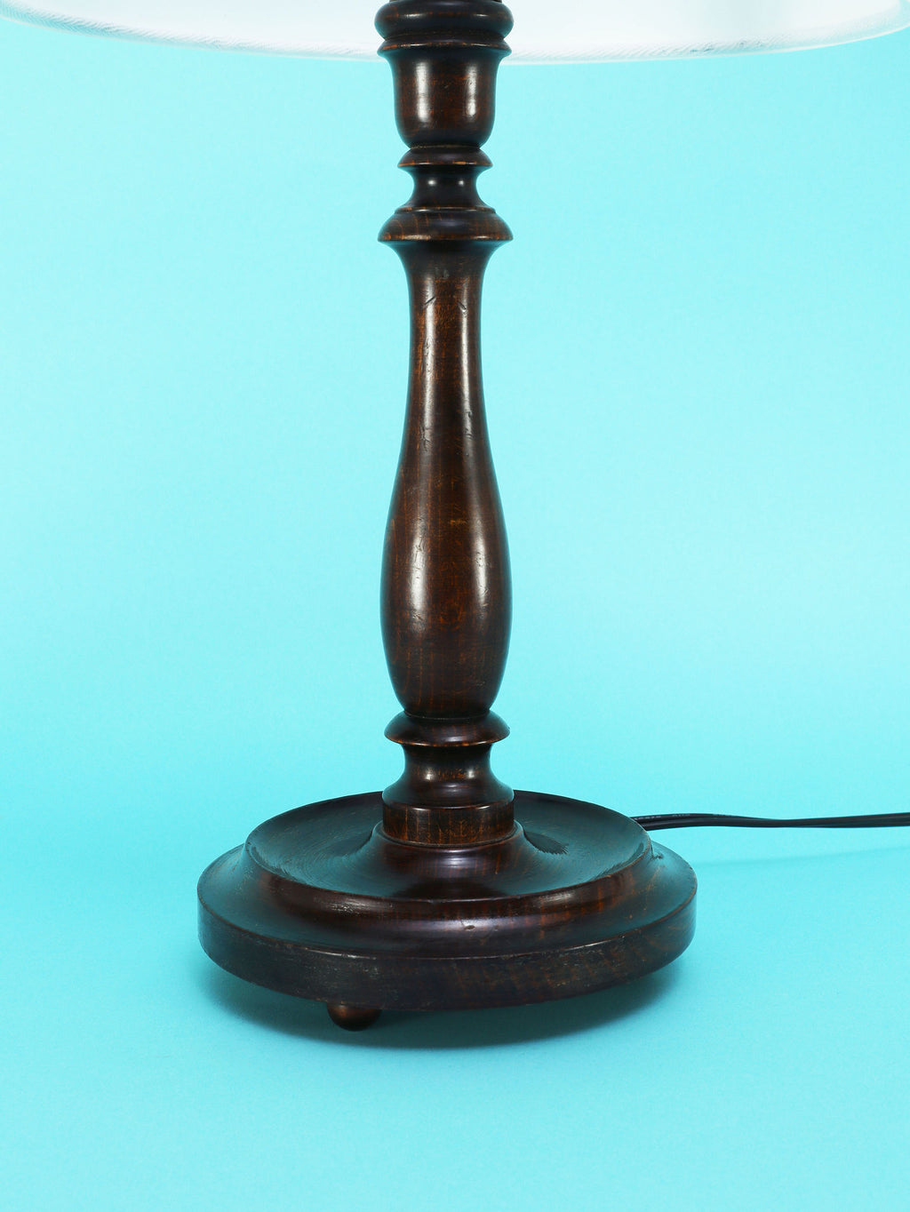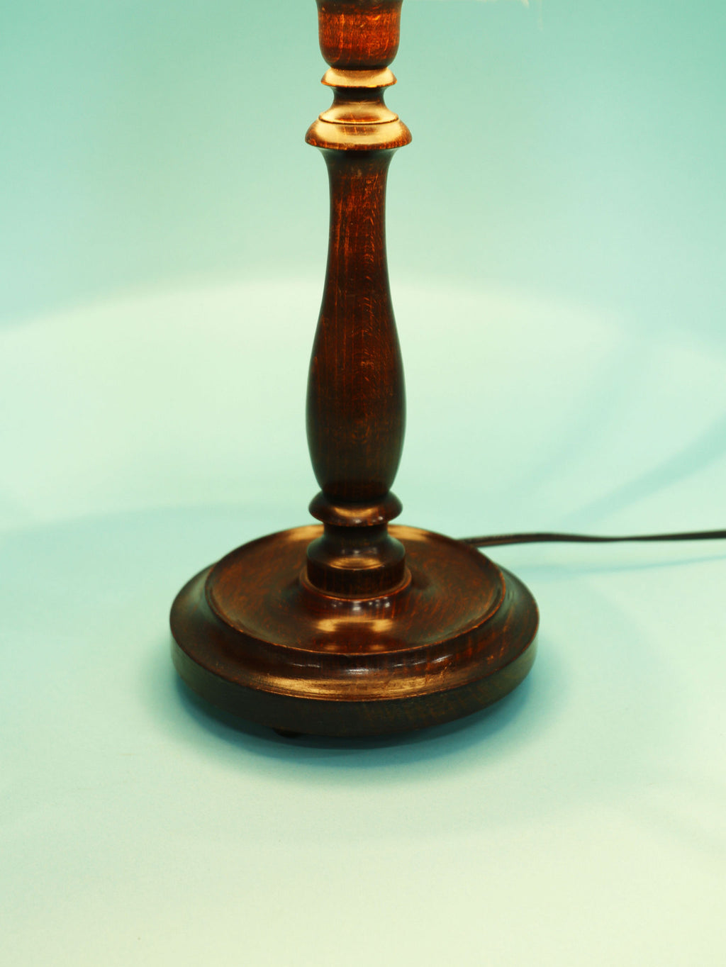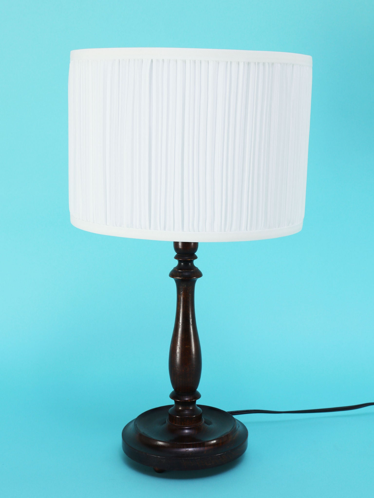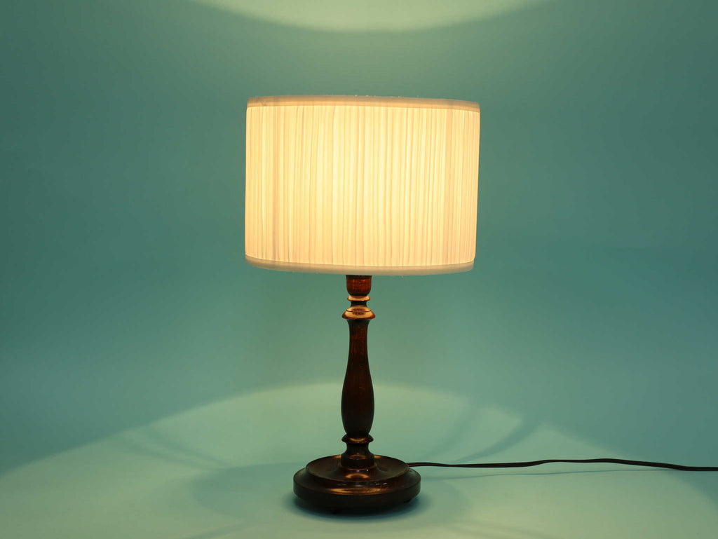 クラシカルな挽物細工が美しいオーク材のテーブルランプ。深く落ち着いたオーク材のベースは、安定感のある円形台座と、中央部分で優雅に絞られた挽物細工(ターニング)が特徴です。流れるような美しい曲線を描くシルエットは、当時の英国のクラシカルな美意識を感じさせます。オーク材の持つ深い色と、経年によって生まれた艶が、空間に確かな重厚感と信頼をもたらします。上部には、円柱型の白いシェードがつくことで、重厚な木製ベースとの対比が生まれ、読書灯や間接照明として、上品で柔らかな光を届けてくれるでしょう。書斎やベッドサイドに最適な、格調高い雰囲気を持つ一品です。