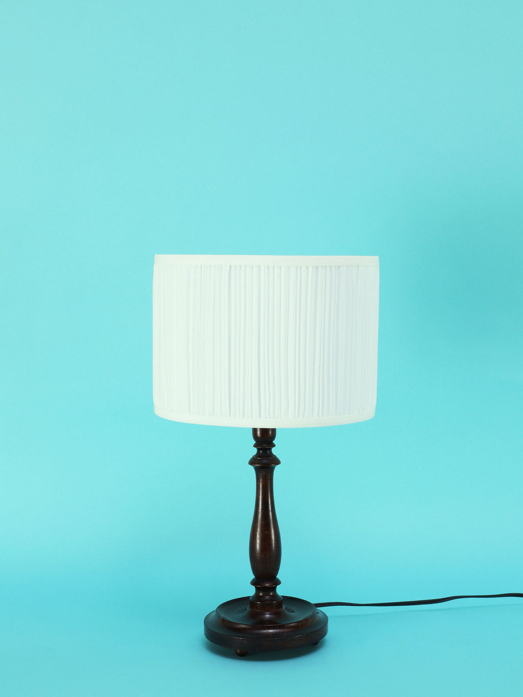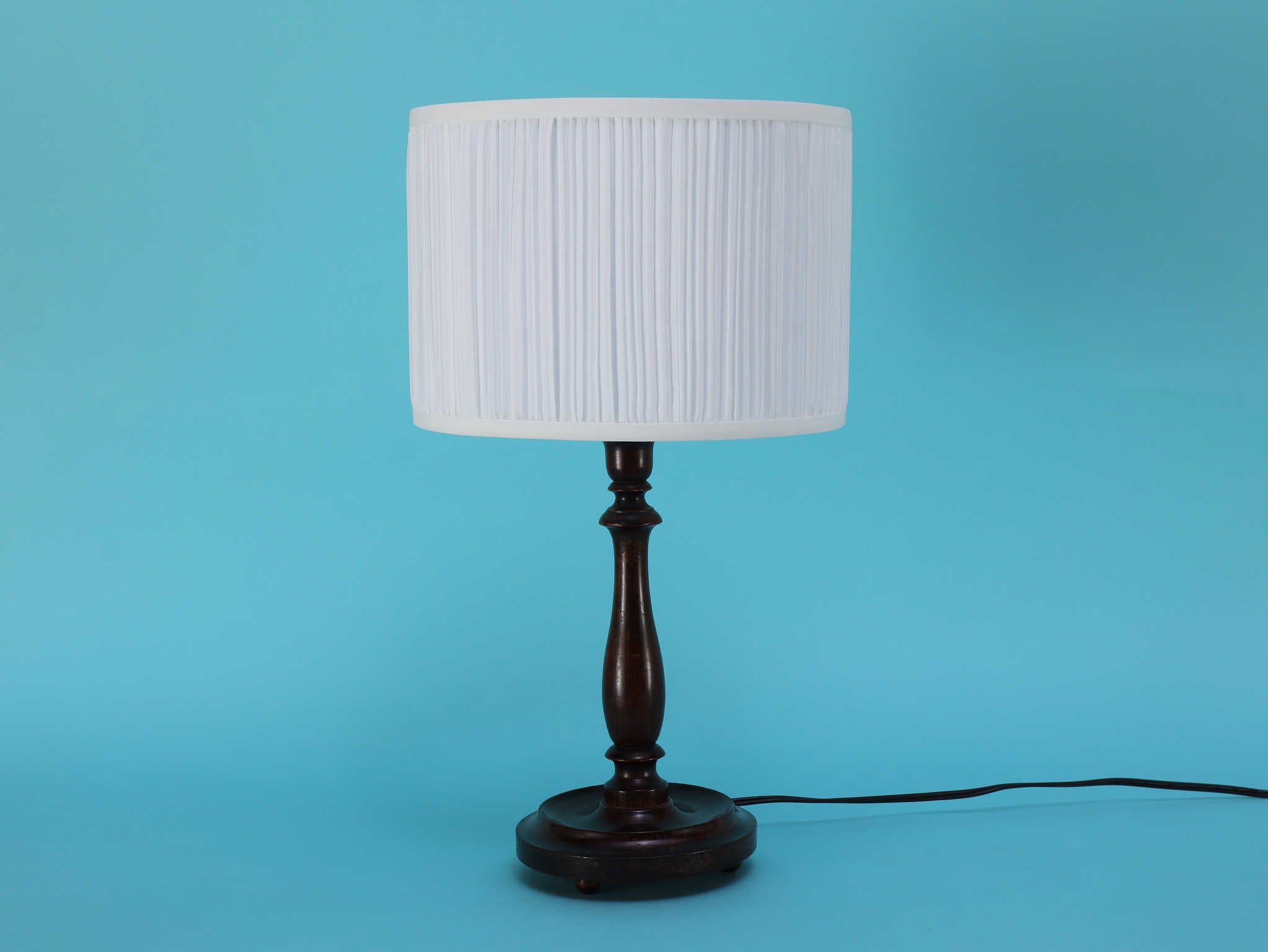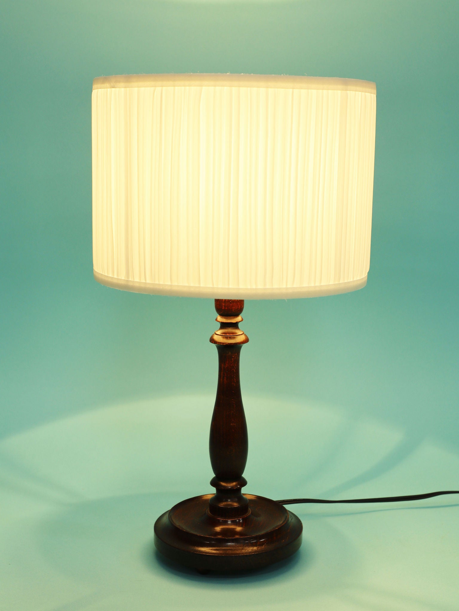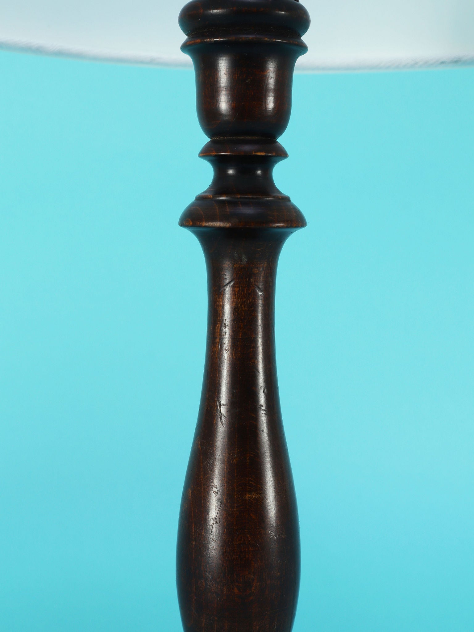 クラシカルな挽物細工が美しいオーク材のテーブルランプ。深く落ち着いたオーク材のベースは、安定感のある円形台座と、中央部分で優雅に絞られた挽物細工(ターニング)が特徴です。流れるような美しい曲線を描くシルエットは、当時の英国のクラシカルな美意識を感じさせます。オーク材の持つ深い色と、経年によって生まれた艶が、空間に確かな重厚感と信頼をもたらします。上部には、円柱型の白いシェードがつくことで、重厚な木製ベースとの対比が生まれ、読書灯や間接照明として、上品で柔らかな光を届けてくれるでしょう。書斎やベッドサイドに最適な、格調高い雰囲気を持つ一品です。