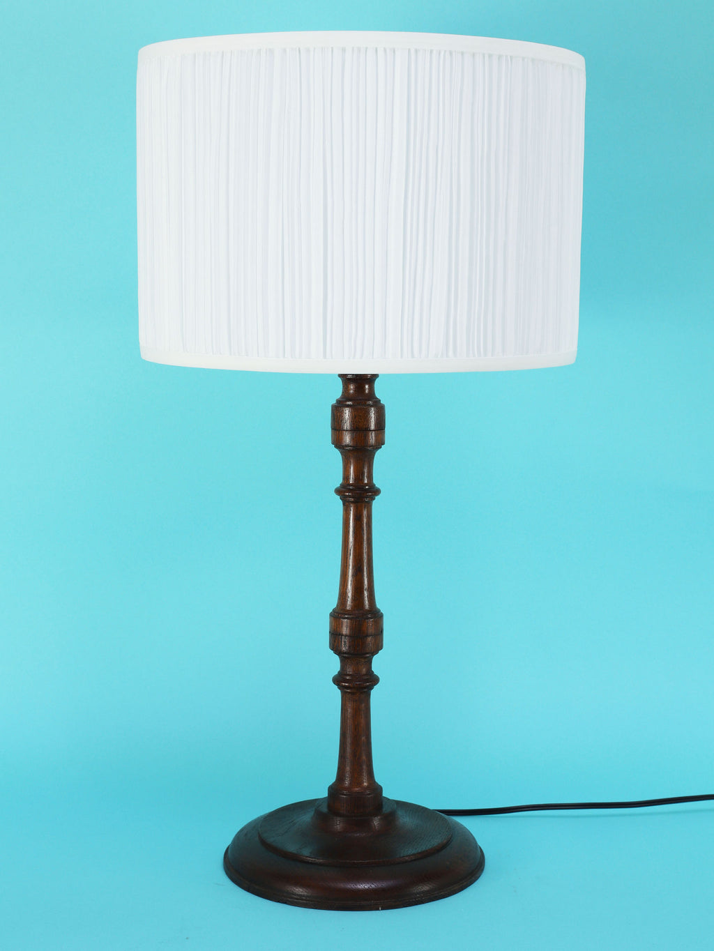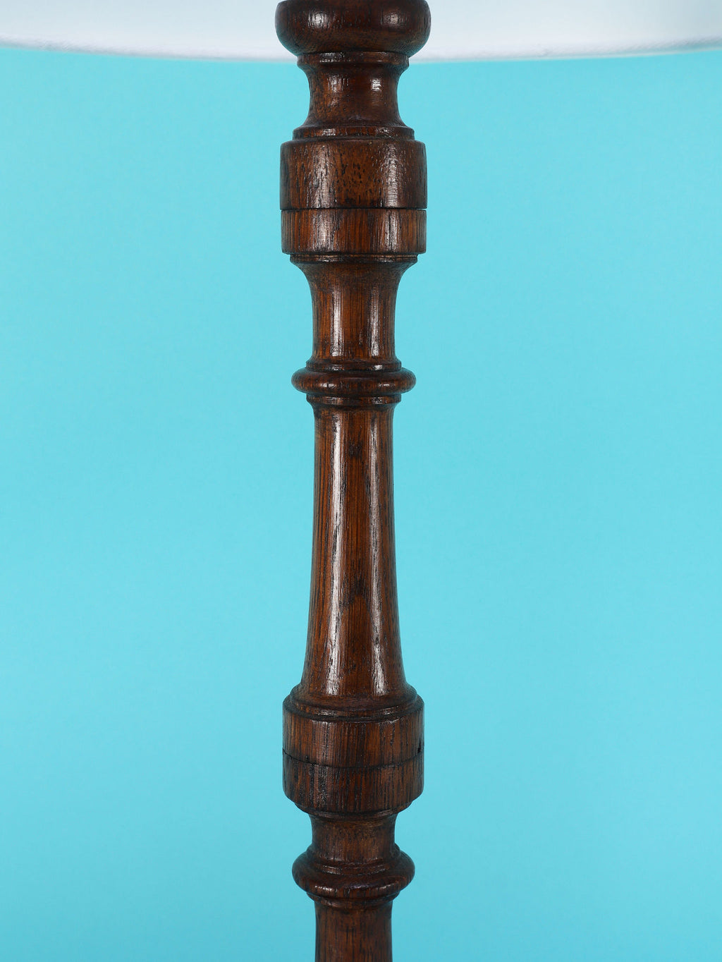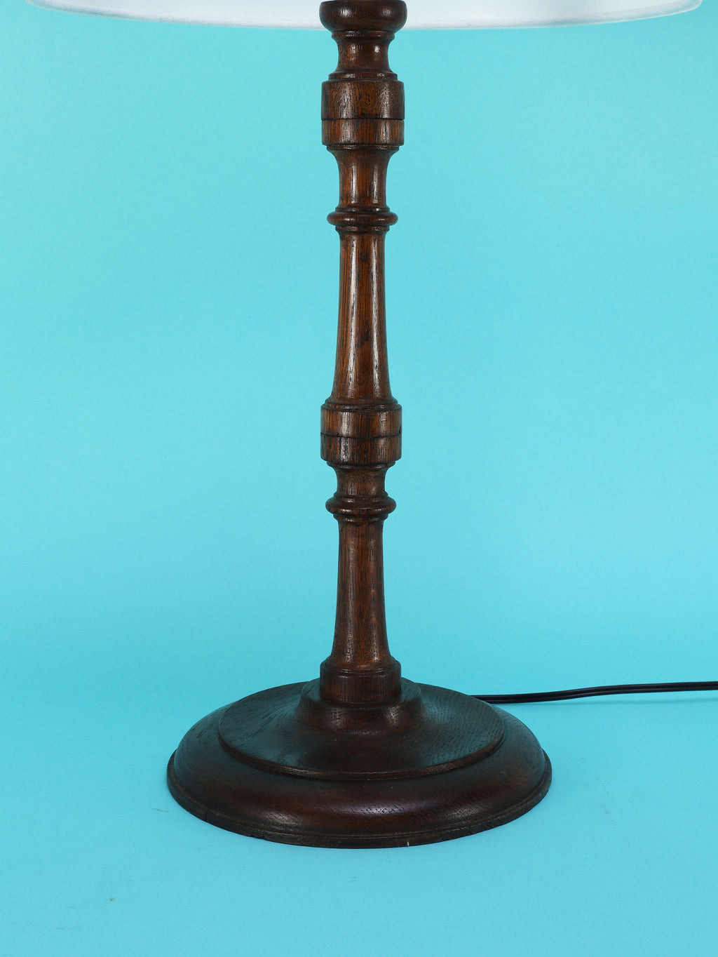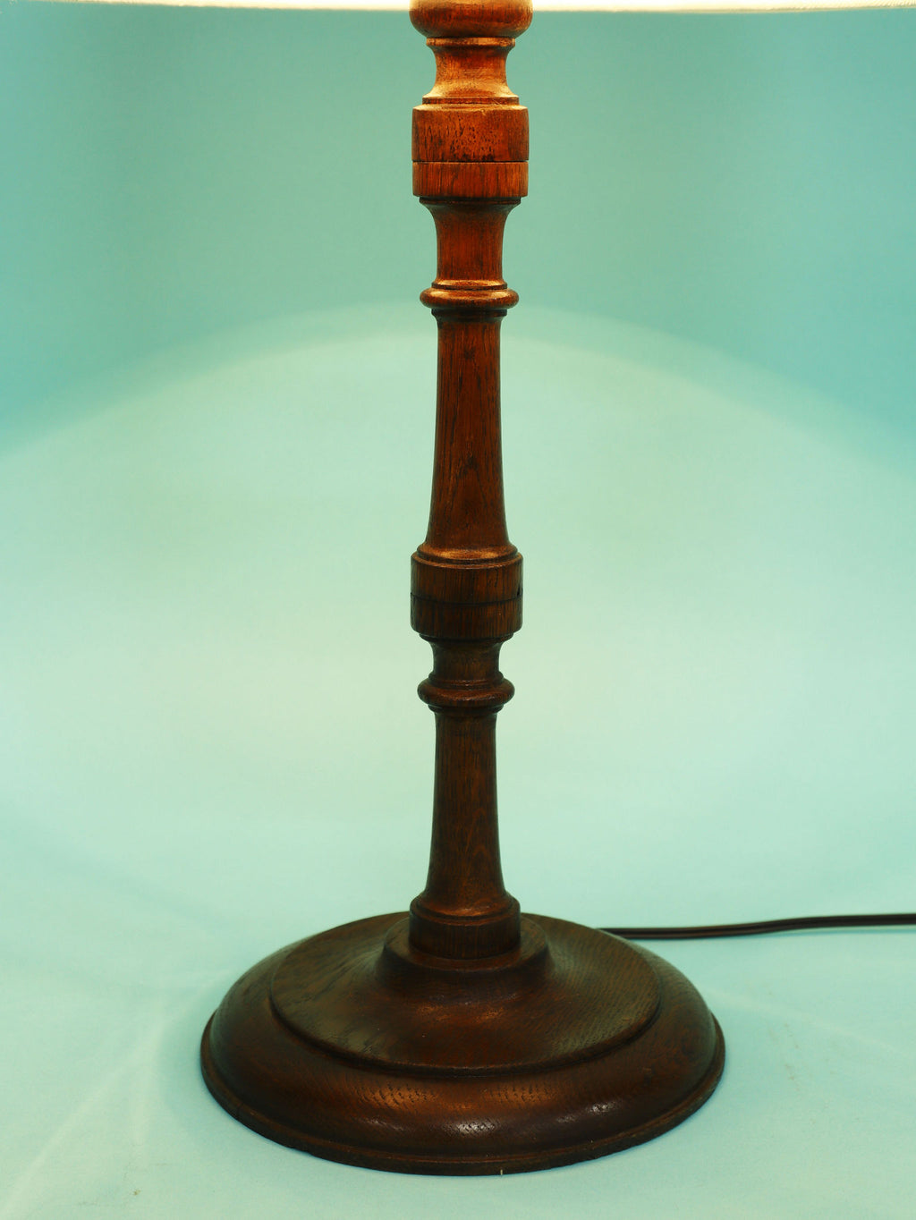 クラシカルな挽物細工が美しいオーク材のテーブルランプ。安定感のある円形台座と、中央部分が装飾的に膨らんだ挽物細工(ターニング)の支柱が特徴です。オーク材の深い色と、長年の使用によって生まれた艶が、この家具に確かな重厚感と信頼をもたらします。台座には、オーク材特有の力強い杢目が感じられます。上部には、円柱型の白いシェードがつくことで、重厚な木製ベースとの美しいコントラストが生まれ、読書灯や間接照明として、上品で柔らかな光を届けてくれるでしょう。書斎やベッドサイドに最適な、格調高い雰囲気を持つ一品です。